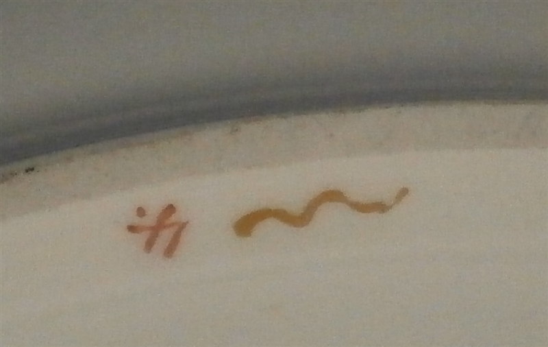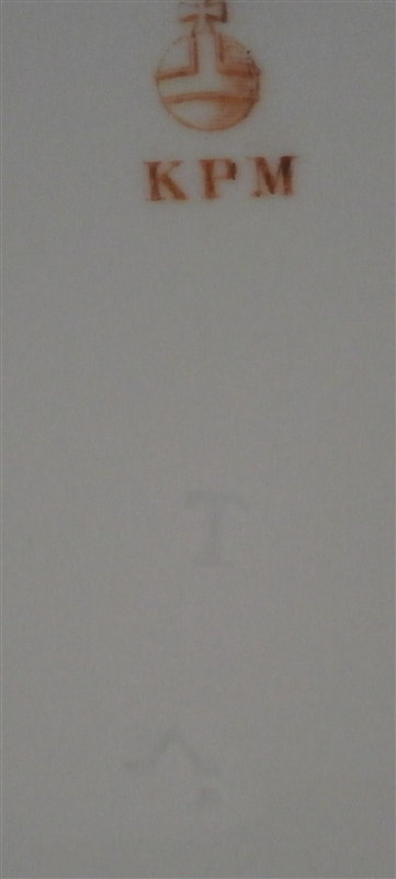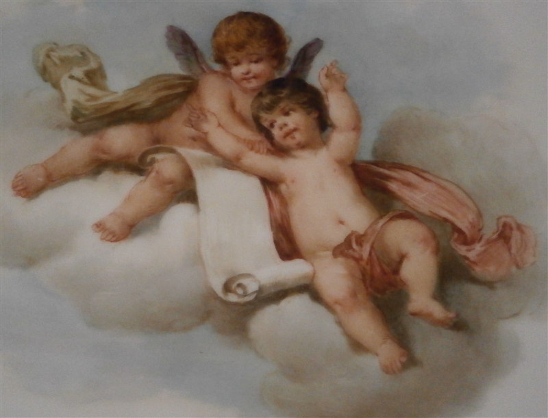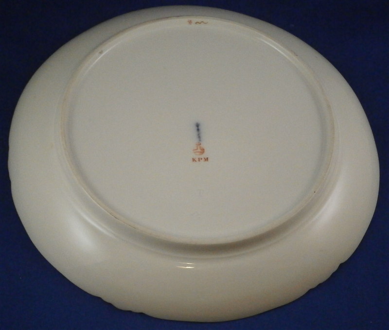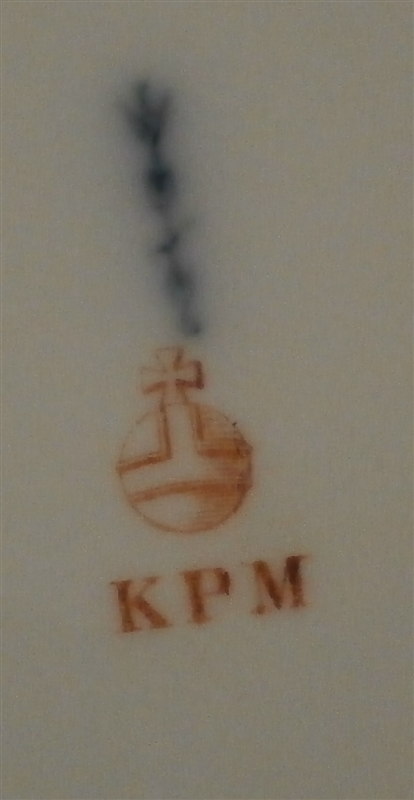 This is a superb plate made by KPM in the 20th century. It is the rarest decoration of these types of plates - you often see the fruit designs, some flowers, rarely a tree but the angel scenes you almsot never come across. The plate is hand painted with a scene in the center of two angels sitting in some clouds. They have a scroll by their side and are covered in a red / yellow cloth. Great quality piece and quite decorative when combined with the raised gold design along the rim. The plate is in superb condition with a bit of dirt and wear to the gold trim and a thin scratch to the red cloth. The piece is about 1.125 inches tall and 8.5 inches in diameter so a nice size. It is marked underneath with the underglaze blue scepter, the red orb mark as well as the usual impressed and painter's marks. Please email me for more information or other pictures.