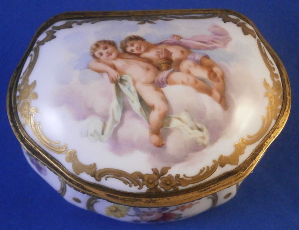 This is a rare porcelain patch / snuff / pill or tabacco box made in the Art Nouveau period by KPM around 1900. The top of the lid has a hand painted scene of two putti / cherubs / angels wearing a pink or green cloth while relaxing on a cloud. The scne is surrounded with some nice gold trim. The bottom as well as the front, back and both sides of the box have some superb flowers hand painted on them as well as some more superb gold trim. Nice shape to the box and there is a single flower to the inside lid and inside bottom as shown. The box is marked on the inside back with the red orb mark as well as the under glaze blue scepter. The nicely detailed metal mounts are probably bronze or brass. The box is in perfect condition with the teeniest of wear to the bottom and some oxidation to the mounts. The piece is 3.25 inches wide, 1.75 inches tall and 2.375 inches deep so a nice size. It closes perfectly. Please email me for more information or other pictures.