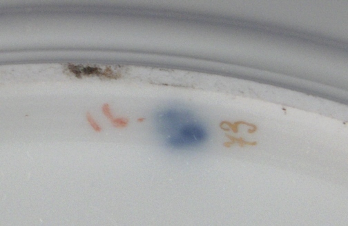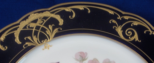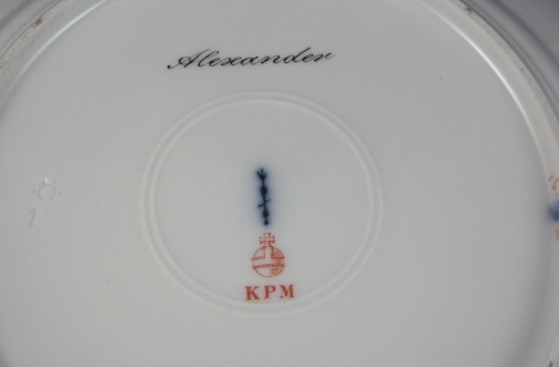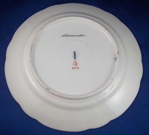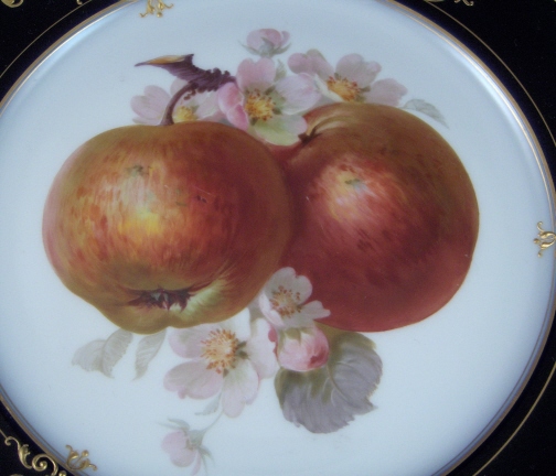 This is a plate made by KPM in the beginning of the 20th century in the Art Nouveau / Jugendstil period. Name of the apple type is written in black on the back - Alexander. It has the impressed letters C and K so it was made sometime before 1910. The plate has a neat deep cobalt blue and raised gold edge and the center is one of the best handpainted fruit still lifes I have ever seen. A pair of apples on the branch with their blossoms all around. They look real enough to eat. The plate is in perfect condition (with three small scratches on the apples that don't take away from the piece!) and is 8.25 inches in diameter. It is marked underneath with the underglaze blue scepter as well as the red orb mark. Also some impressed numbers, letters and painters marks by the footring. Please email me for more information or other pictures.