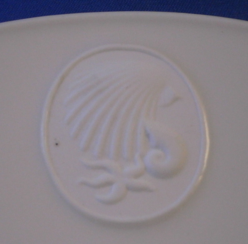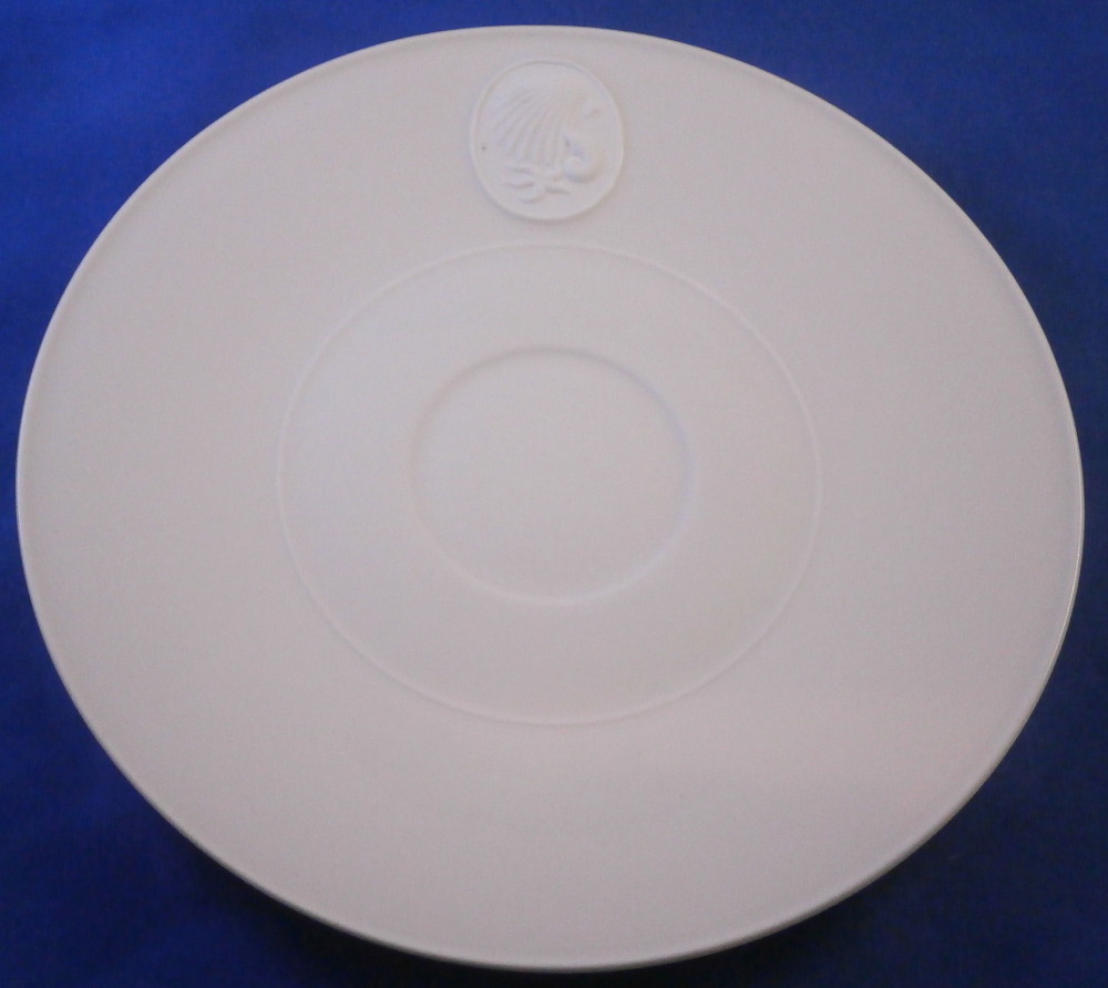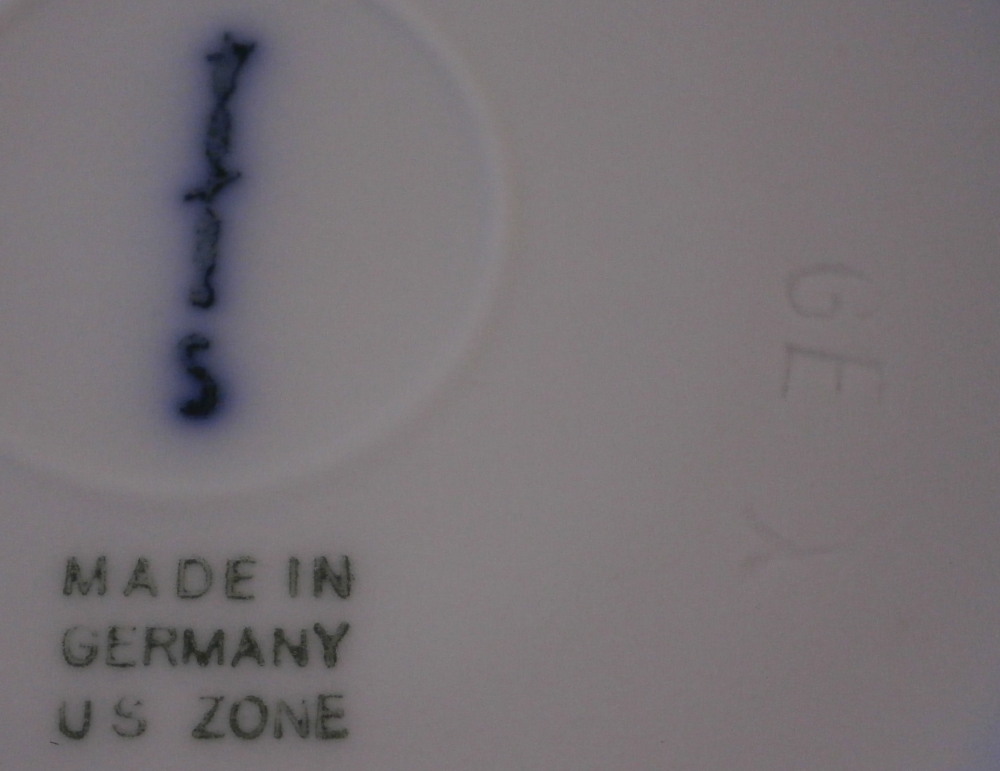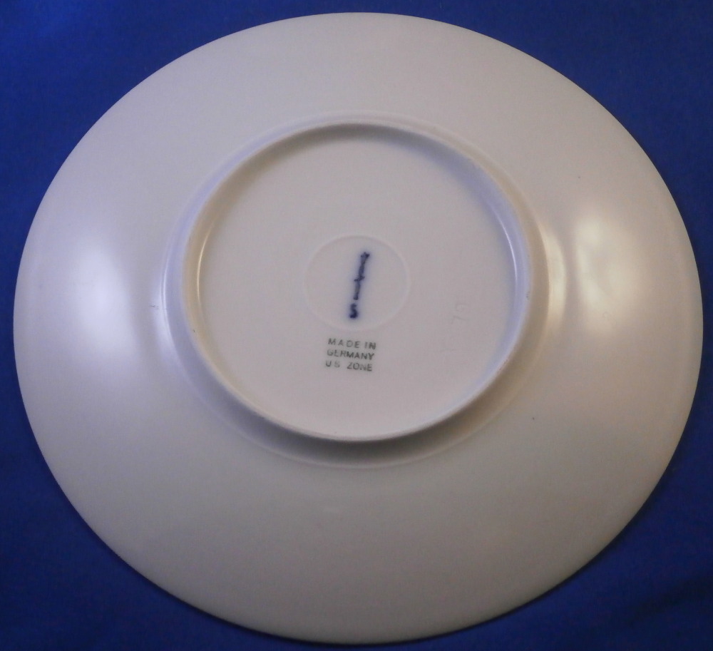 This is a tea cup and saucer set from the Arkadia / Arcadia series made by KPM in the mid 20th century right after WWII. A really nice shape - sleek and modern with an unglazed medallion of a sea shell on the saucer as shown. The rest of the cup and saucer are glazed. A really nice looking set! Both pieces are in perfect condition with a tiny black firing spot next to the seashell design as shown. Both pieces are marked underneath with the under glaze blue scepter with the S under it for the Selb location as well as the green Made in Germany US Zone and some impressed marks under the saucer typical for this period as shown. The US Zone part was only used for a short time after WWII. The cup is just under 2.25 inches tall and has a diameter of just over 3.75 inches. The saucer is 0.625 inches tall with a diameter of 6.5 inches. I have quite a few of these set so if you need more than one just let me know and we'll figure it out from there! Please email me for more information or other pictures.