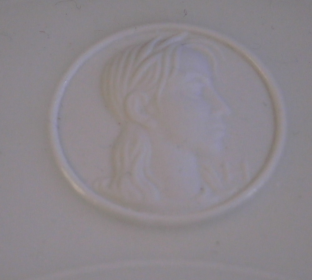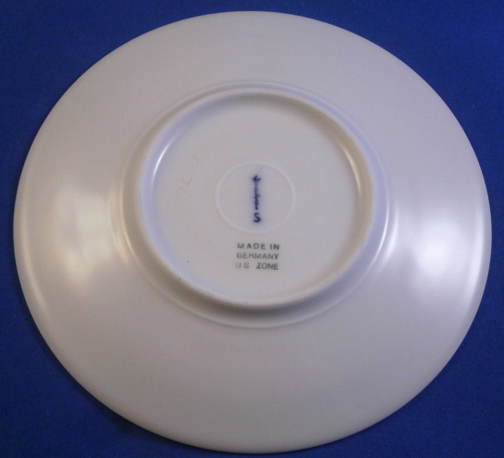 This is a demitasse / mocha coffee / espresso sized saucer from the Arkadia / Arcadia series made by KPM in the later 20th century. A really nice shape - sleek and modern with an unglazed medallion of a lady's head with the letter H by it as shown. The rest of the saucer is glazed. The piece is in perfect condition. The saucer is marked underneath with the under glaze blue scepter mark with the letter S below for Selb as well as some impressed marks and Made in Germany US Zone in green under that as shown. It is 0.625 inches tall with a diameter of 5.125 inches. I have a few of these pieces so if you need more than one just let me know and we'll figure it out from there! Please email me for more information or other pictures.