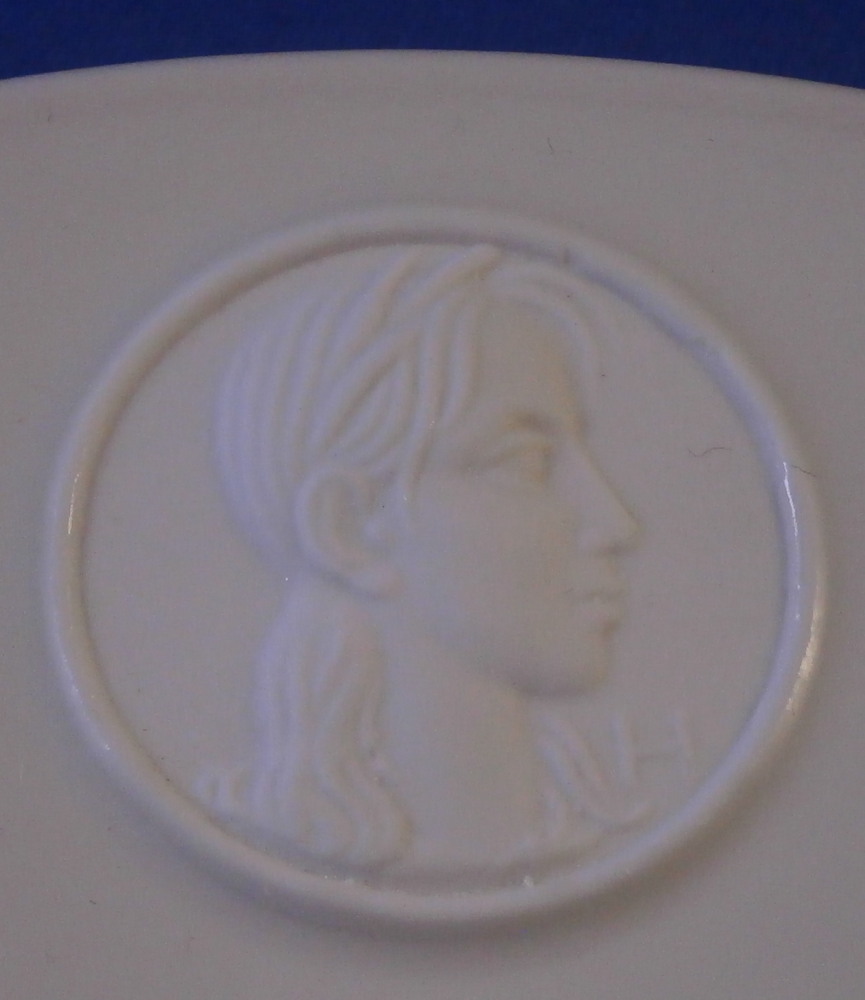 This is a demitasse / mocha coffee / espresso sized saucer from the Arkadia / Arcadia series made by KPM in the later 20th century. A really nice shape - sleek and modern with an unglazed medallion of a lady's head with the letter H by it as shown. The rest of the saucer is glazed. The piece is in perfect condition. The saucer is marked underneath with the under glaze blue scepter mark with the letter S below for Selb as well as some impressed marks as shown. It is 0.625 inches tall with a diameter of 5.375 inches. I have a few of these pieces so if you need more than one just let me know and we'll figure it out from there! Please email me for more information or other pictures.