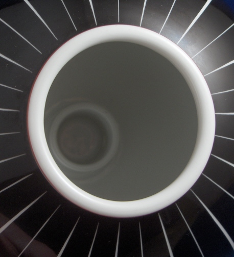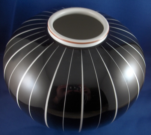 This is a vase made by KPM in about 1939 (I am having a tough time seeing the date mark clearly) so in the end of the Art Deco period. This large vase is handpainted with a black and white stripe design like some of the Bauhaus Trude Petri vases (this might be one of hers I guess) and there is a nice brownish trim to the lip. The vase is in great condition with a few small light scratch spots that have been colored in and are of little importance. The vase is 7 inches tall and has a diameter of 8.5 inches. It is marked underneath with the underglaze blue scepter as well as the red orb mark as well as some black marks that are hard to read one is probably Pe/483 and another QC. Impressed marks as well but also hard to read. Superb design and so well thought through that even the inside bottom has a mini vase in it so the center flowers would stand straight and not slide to the sides. Please email me for more information or other pictures.