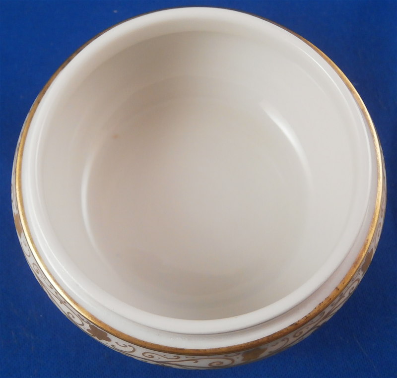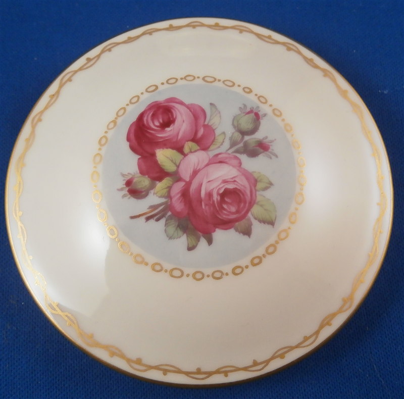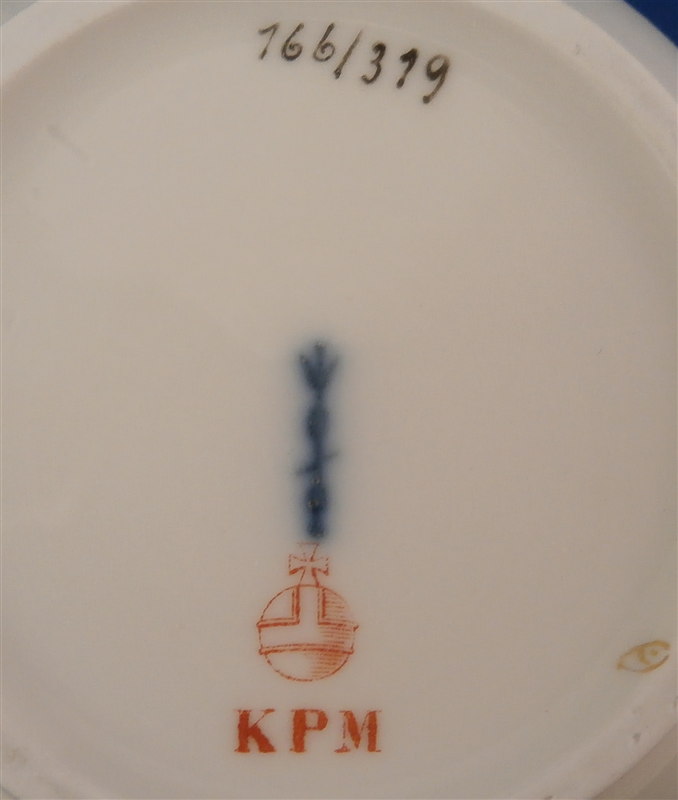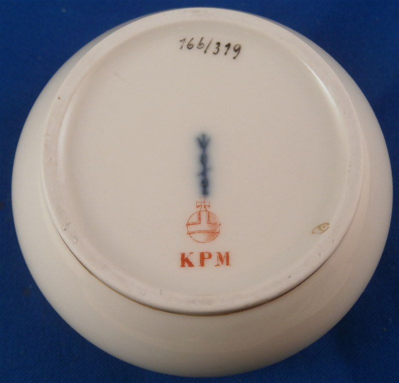 This is a nice little lidded box made by KPM in the early 20th century during the Art Nouveau period. It is handpainted with some nice gold trim on the rim of the bottom part, the edge of the lid and around a superb central medallion handpainted with a rose arrangement. Top quality painting!! The box has a nice shape to it as well. The piece is in perfect condition. It is 2 inches tall and has a diameter of 3.25 inches. It is marked underneath with the underglaze blue scepter, the red orb as well as some artist marks and impressed marks common to KPM pieces of this period. The inside lid also has the artist mark on it. Please email me for more information or other pictures.