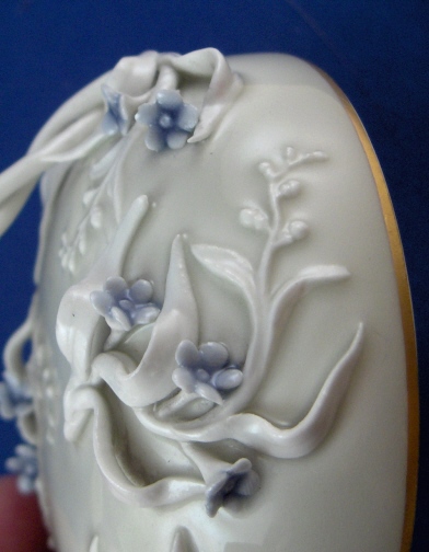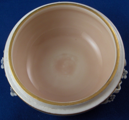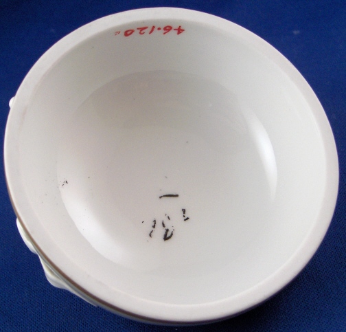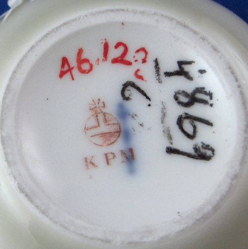 This is a very interesting box made by KPM in the early 20th century. It is unlike anything else I have seen by them - combining an Asian flair with a bit of an Art Nouveau influence. You have the celadon ground color and flowers painted in an underglaze blueish color. The flowers are very detailed and the raised attached parts flow into just raised desins in the apste itself. Really a neat peice with a handle to keep from having to touch the flowers to open the lid. Someone was thinking here :) Nice gold trim to the edges and a orange pinkish ground color to the bottom inside finish this neat piece and make this one of my new favorite boxes! The box is in superb condition with three minor chips to the flowers/leaves. Impossible to find. It appears this piece has spend some time in a museum as you can see some museum IDs on it in red and black. The box is marked underneath with the underglaze blue scepter mark and the red orb mark. I cannot find any impressed letters so it might date to 1900 or a bit earlier. The piece including the lid and handle is 3 inches tall and 3.125 inches in diameter. Please email me for more information or other pictures.