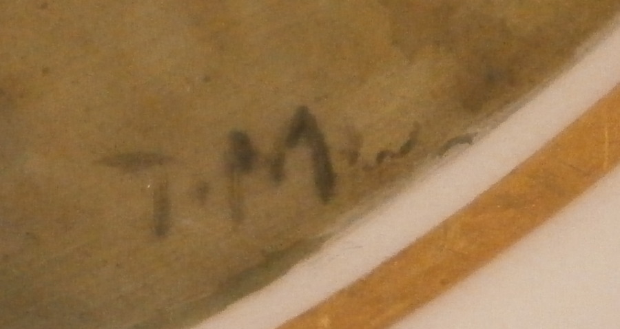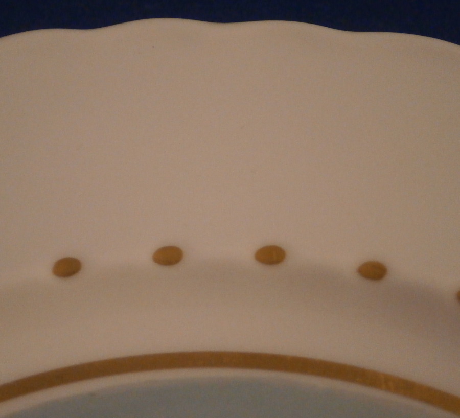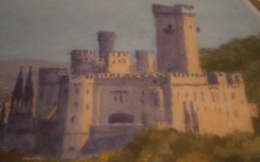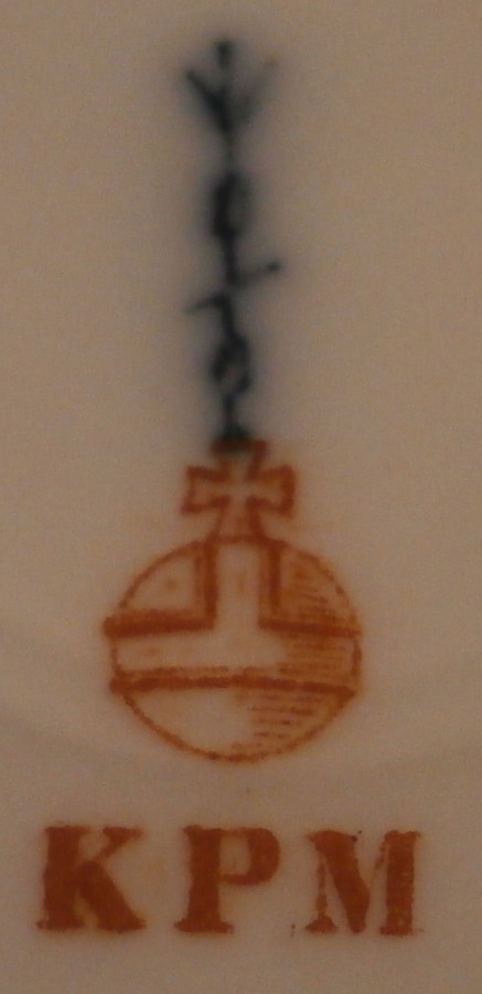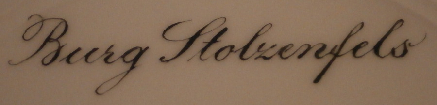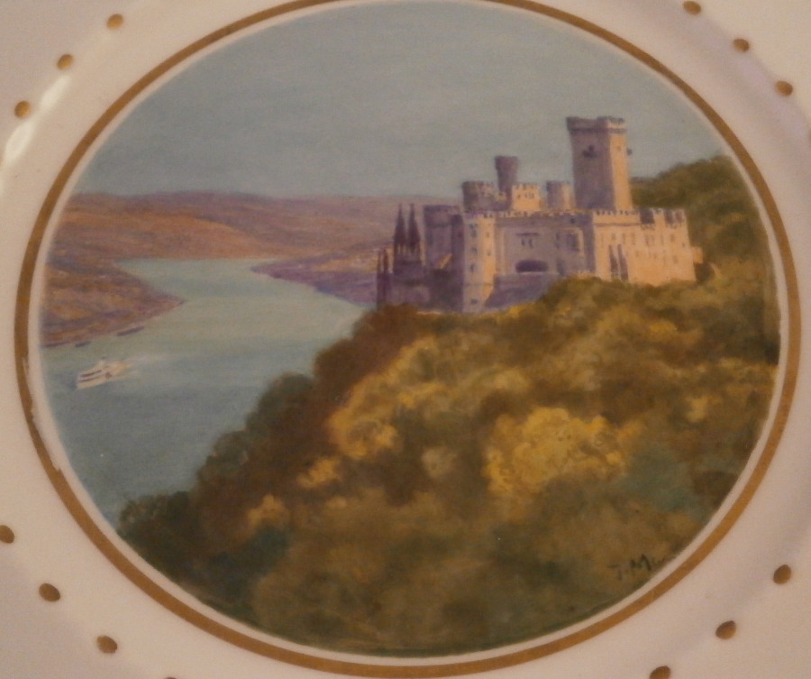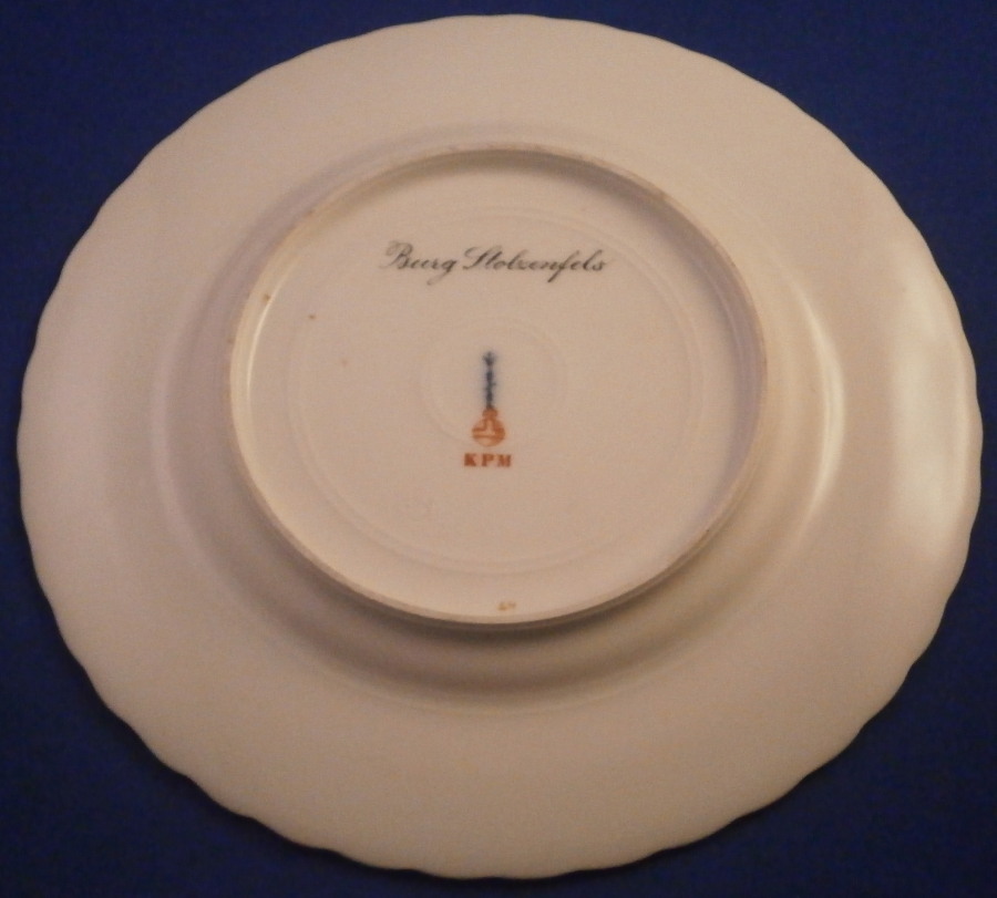 This is a stunning plate made by KPM in the early 20th century during WWI. It is very much in the Art Nouveau / Jugendstil style of the period and is hand painted with a scene in the center of a castle on top of a hill by a river with a boat going along. The castle is called Burg Stolzenfels which is a former medieval fortress castle that was ruined and then turned into a palace. It is situated near the city of Koblenz on the Rhine. Today, it is part of the UNESCO World Heritage Site. The rim of the plate is nicely done as well not being the boring old kind but a bit wavy and a gold ring around the scene and some gold dots along the well edge make this a very elegant plate. Julius Menzel is best known for these kinds of scenes and the plate here is signed by him in the bottom right of the scene. I have three more from this series and one other is also signed by him. The plate is in perfect condition with some minor use marks to the gilding. The piece is 0.625 inches tall and 7.75 inches in diameter and marked underneath with the under glaze blue scepter, the red orb mark, the black iron cross of the first World War, the number 50/39 in black, a gilder's marks, the usual impressed marks and also the title of the scene to the front in black. Please email me for more information or other pictures.