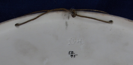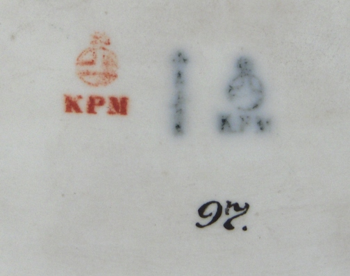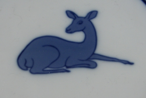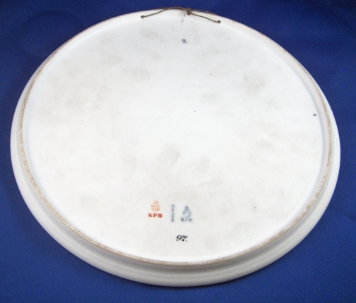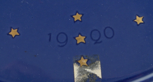 This is a cake plate or plaque made by KPM in 1920. It was designed by Theodor Schmuz-Baudiss around this time. It is handpainted in an underglaze blue with overglaze gold stars. In the center is a deer and on the bottom the year 1920 is written. The plaque is in perfect condition (the odd looking thing by the year is just sticker residue from an old collection sticker that I removed and cleaned now). It is marked underneath with the blue scepter, the blue orb for underglaze colors, the red orb for the overglaze gold, a black 97. for the number of the plate, another black 50/95 and some impressed numbers like the year code, etc. Got a wire in the top footring for hanging. The plate is 0.625 inches tall and 10.25 inches in diameter. Very flat like a cake platter in terms of shape. Please email me for more information or other pictures.