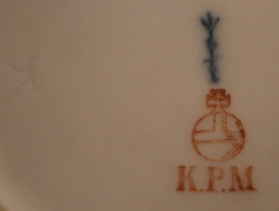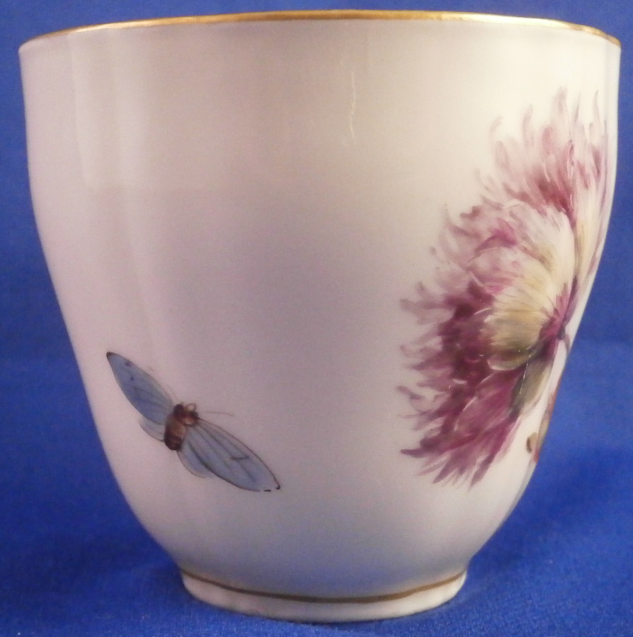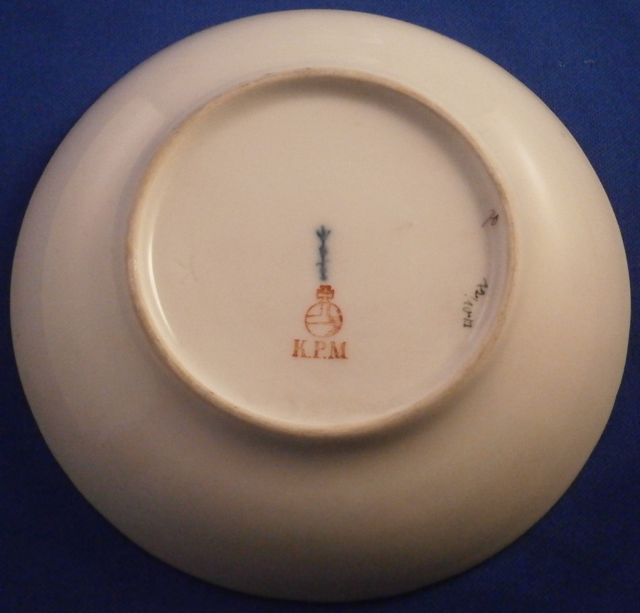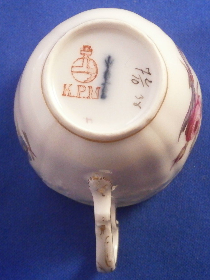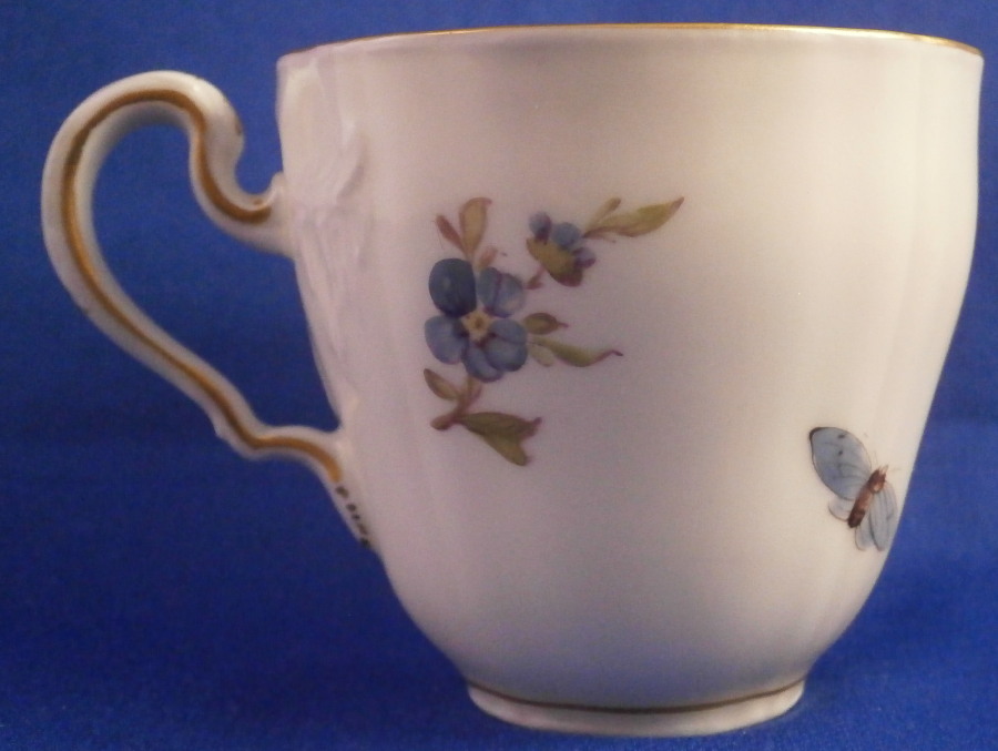 This is a nice demitasse cup and saucer made by KPM during the Art Nouveau / Jugendstil period in the early 20th century. Made for Mocha or Espresso coffee but can be used for anything you want off course. Both pieces are hand painted with a nice large floral arragenments as well as a smaller single flwoer and a butterfly. The colros and style of the flowers are superb during this period much nicer than any other time for this maker I think! The pieces have a slightly raised design to the paste and a gold trim to the edge. The cup has a great handle shape with gold trim to it and a design in relief to either side of the top terminal. A simple design yet very elegant! The set is marked underneath with the under glaze blue scepter mark as well as the red orb and various painted and impressed marks as shown. Both pieces are in perfect condition. The cup is 2.125 inches tall and 2.25 inches in diameter. The saucer is 0.875 inches tall and just under 4.625 inches in diameter. Please email me for more information or other pictures.
