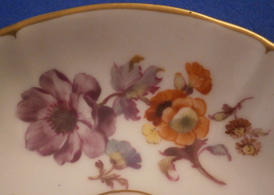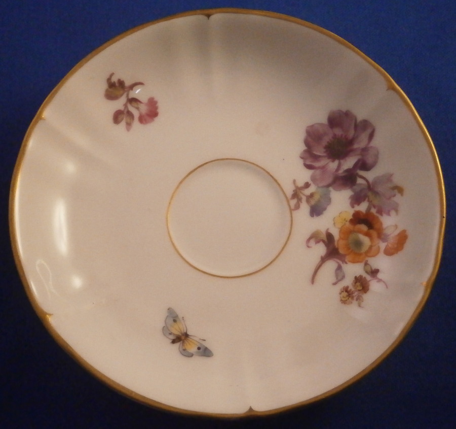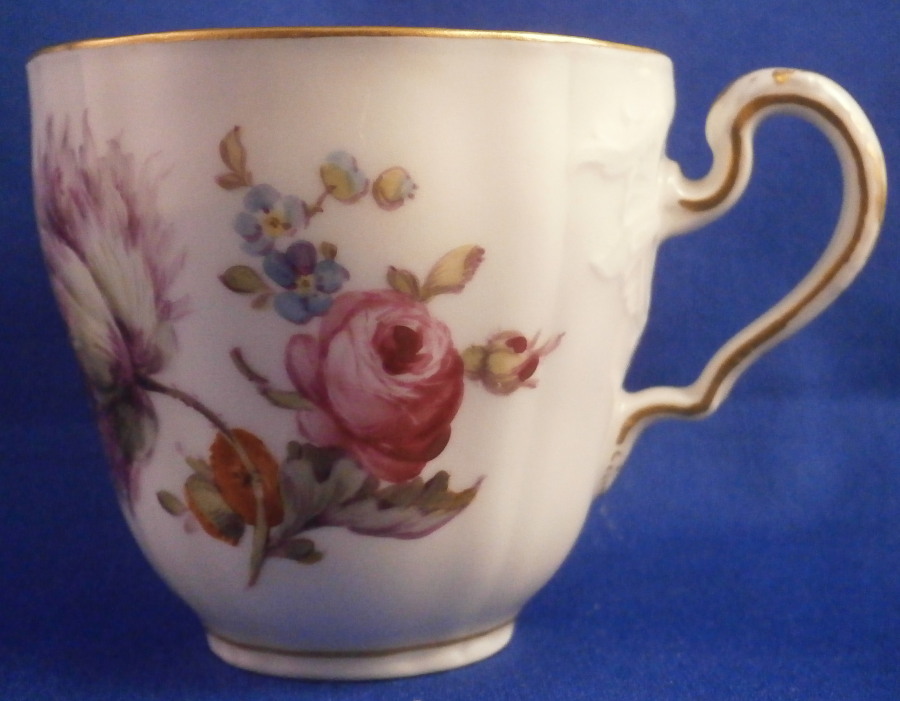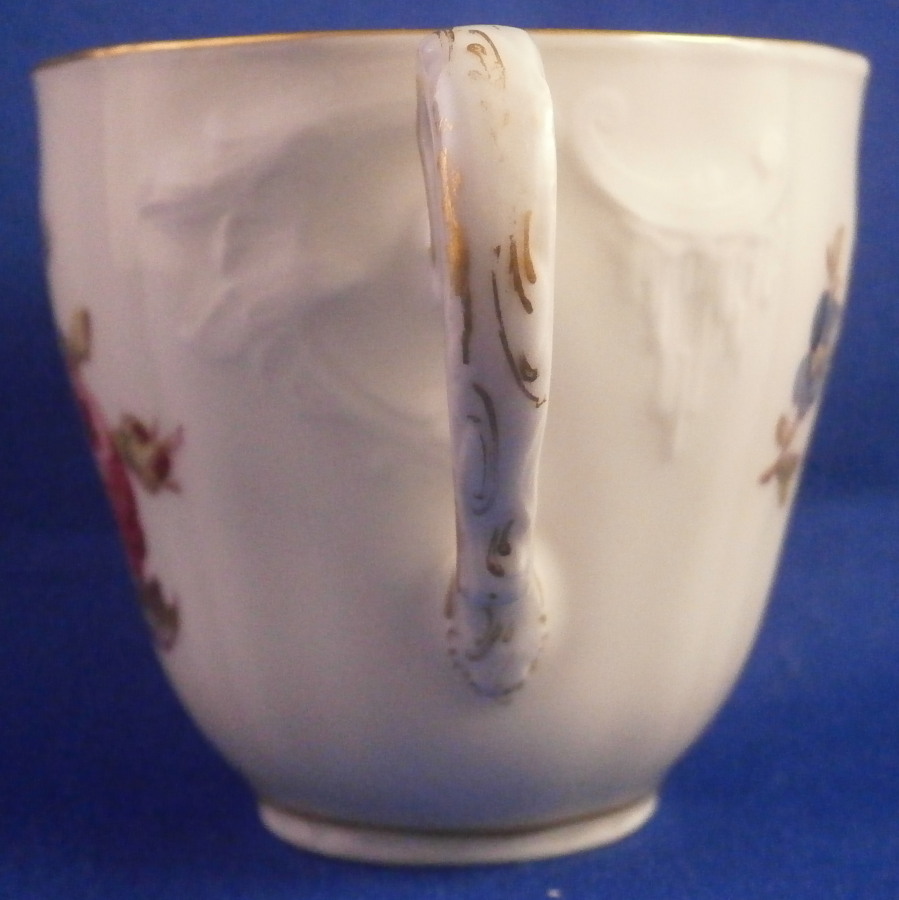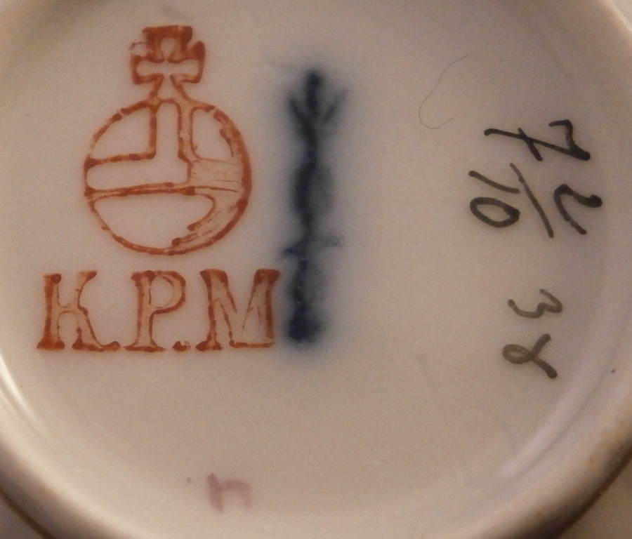 This is a nice demitasse cup and saucer made by KPM during the Art Nouveau / Jugendstil period in the early 20th century. Made for Mocha or Espresso coffee but can be used for anything you want off course. Both pieces are hand painted with a nice large floral arragenments as well as a smaller single flwoer and a butterfly. The colros and style of the flowers are superb during this period much nicer than any other time for this maker I think! The pieces have a slightly raised design to the paste and a gold trim to the edge. The cup has a great handle shape with gold trim to it and a design in relief to either side of the top terminal. A simple design yet very elegant! The set is marked underneath with the under glaze blue scepter mark as well as the red orb and various painted and impressed marks as shown. Both pieces are in perfect condition. The cup is 2.125 inches tall and 2.25 inches in diameter. The saucer is 0.875 inches tall and just under 4.625 inches in diameter. Please email me for more information or other pictures.