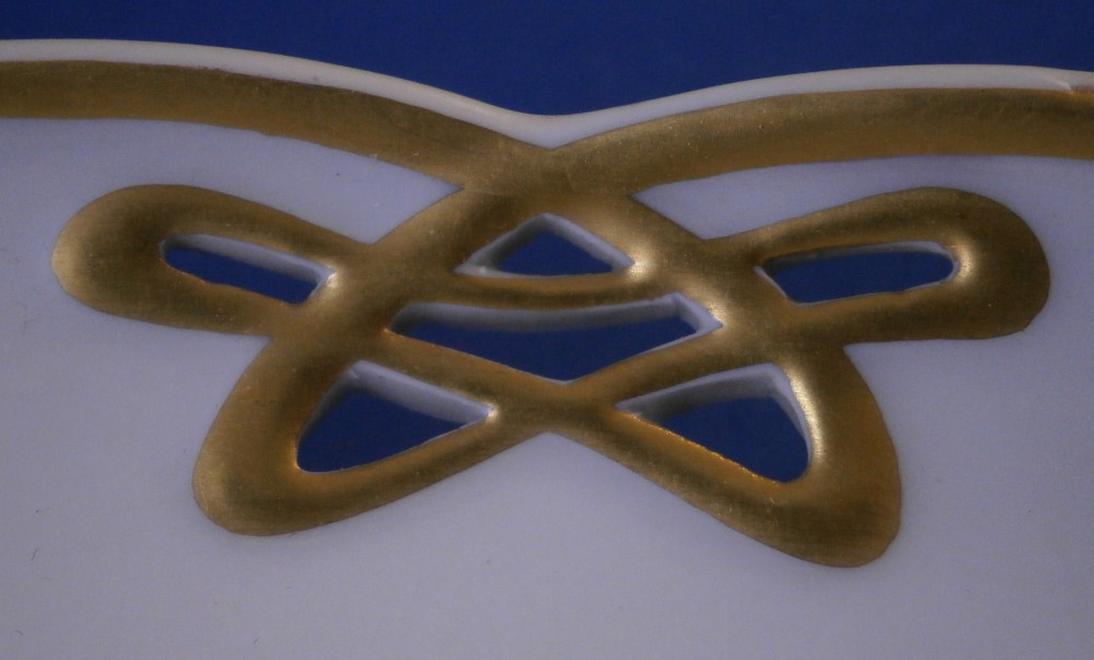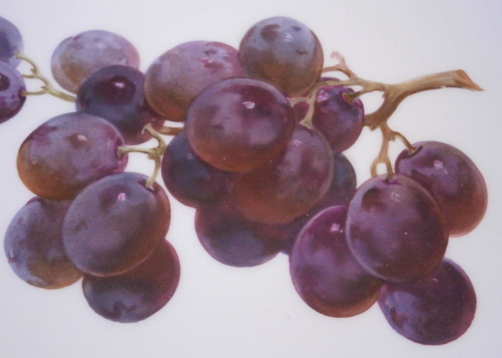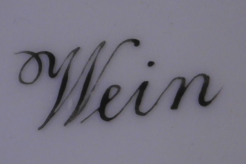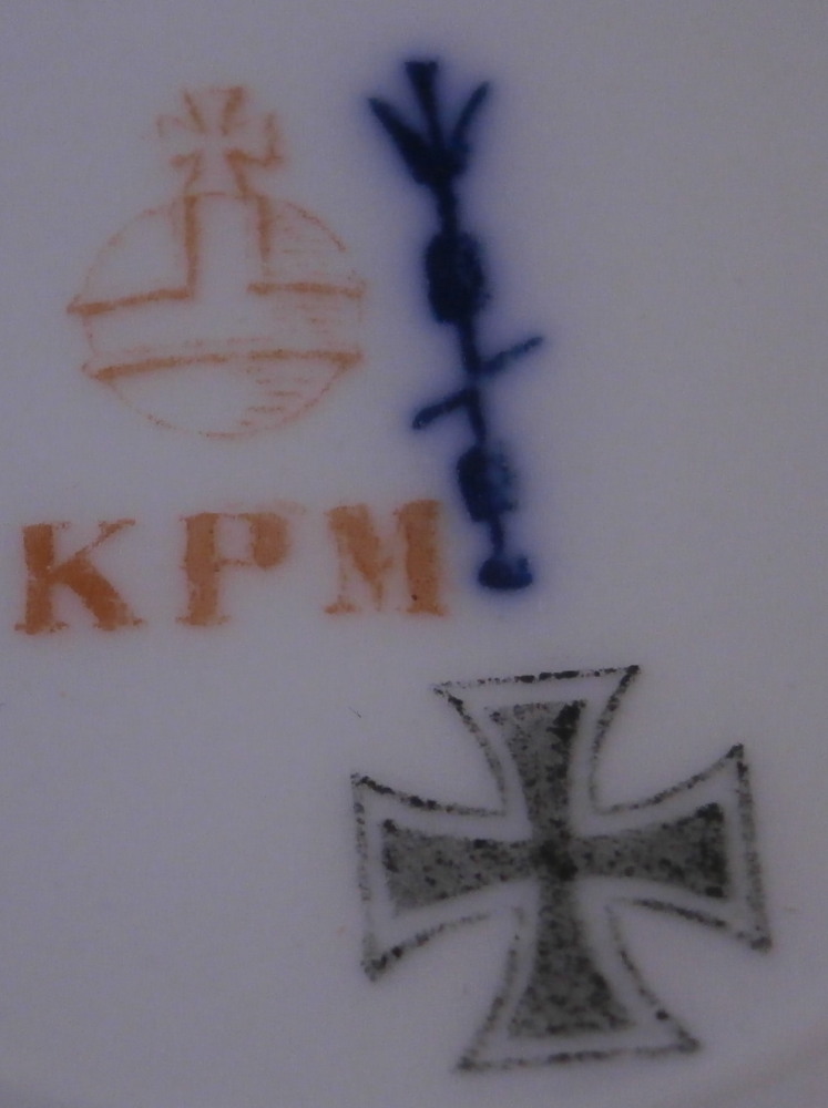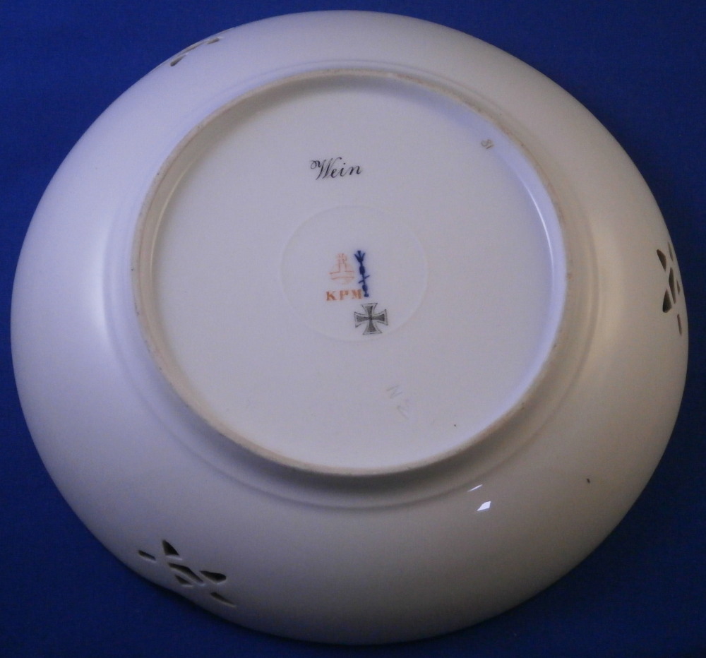 This is a really nice plate made by KPM in the beginning of the 20th century during the Art Nouveau or Jugendstil period. The plate has a neat reticulated edge highlighted with gold and the center has a hand painted fruit still life scene of a bunch of purple grapes. It's simple yet stunning looking! The plate is in perfect condition. The piece is 1.25 inches tall and 7.25 inches in diameter. It is marked underneath with the under glaze blue scepter as well as the red orb mark, the word Wein (wine - a type of grape) and the usual painter's, gilder's and impressed marks as shown. Please email me for more information or other pictures.