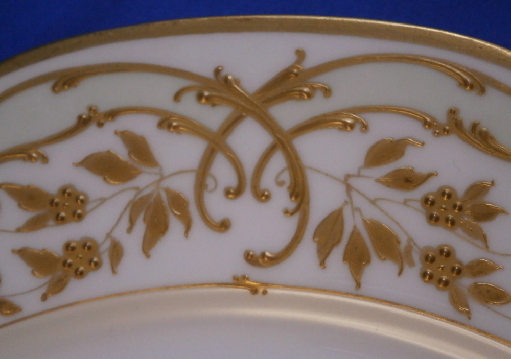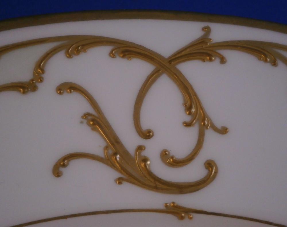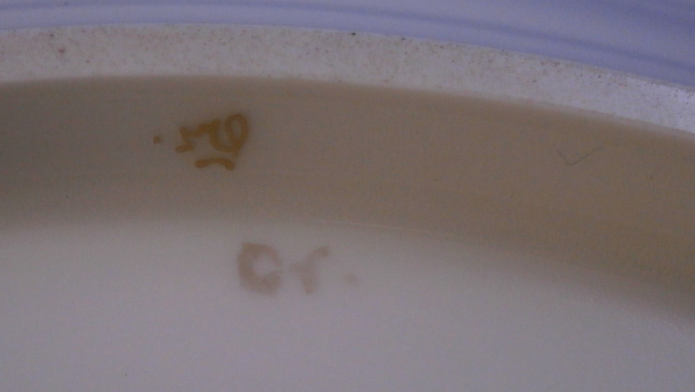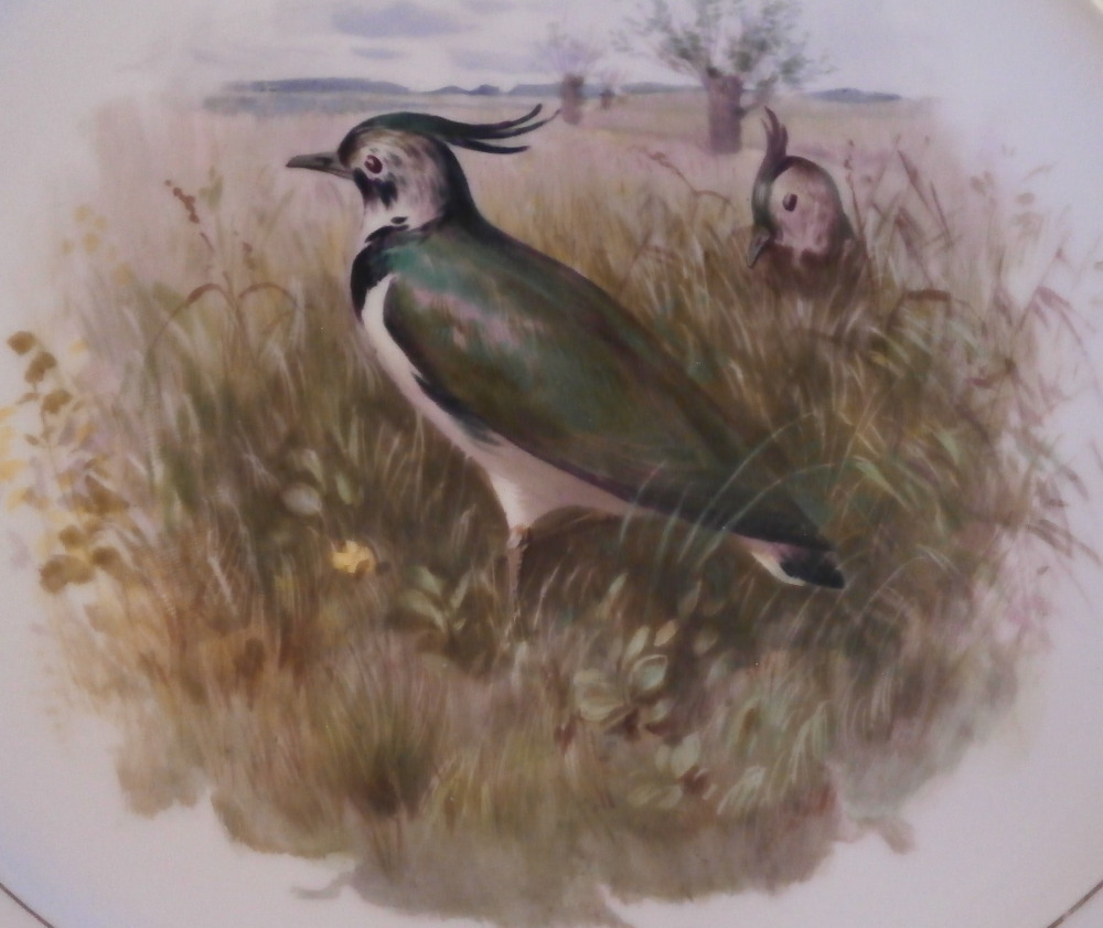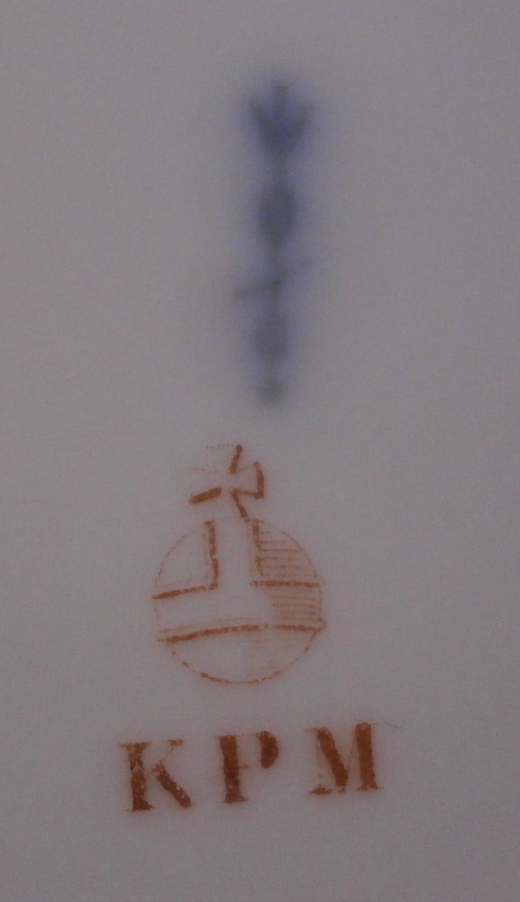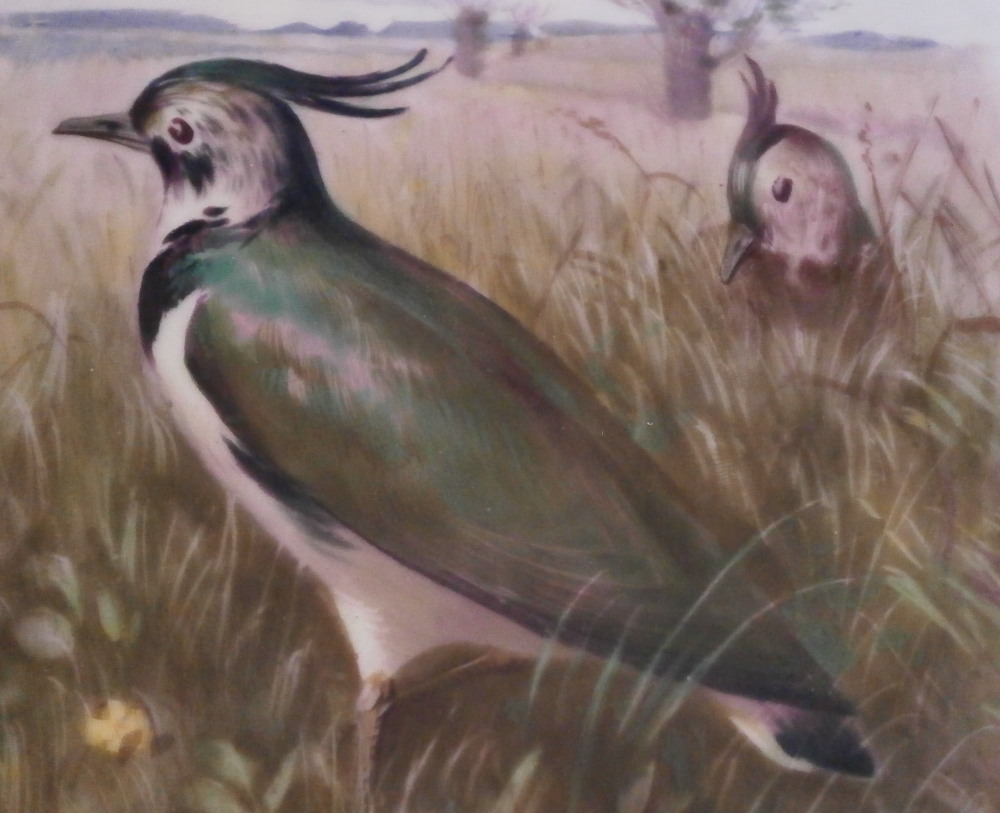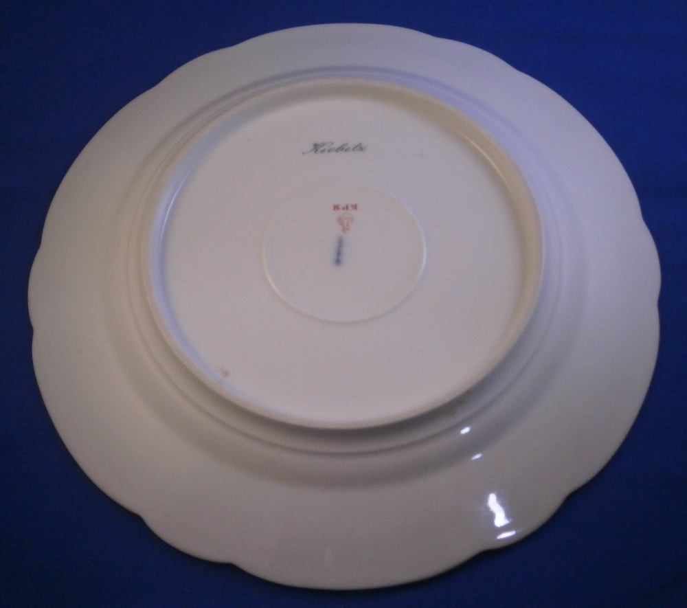 This is a really nice Art Nouveau / Jugendstil period plate made by KPM in the early 20th century. The plate is hand painted with a bird scene including a bird in full view as well as another sticking its head out of the tall grasses in a nice landscape surrounding. The rim is decorated in the Jugendstil style with raised gold scrolls as well as some leaves and flowers and a slightly greenish ground color between the scrolls which is hard to see in the pictures. A truly superb plate and it is in superb condition. The piece is just over 1 inch tall and 9.75 inches in diameter. It is marked underneath with the under glaze blue scepter as well as the red orb mark as well as a painter's mark, some numbers and the usual impressed marks of the period as shown. The name of the bird in black script - Kiebitz which is a type of northern lapwing . Please email me for more information or other pictures.