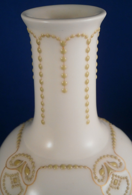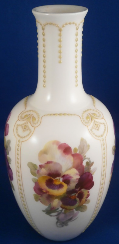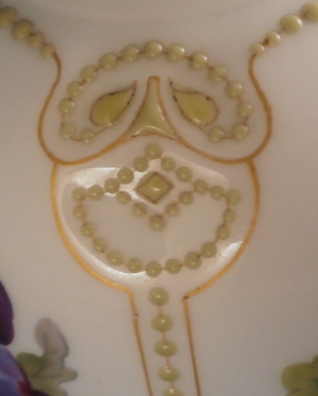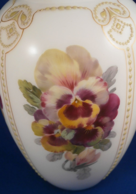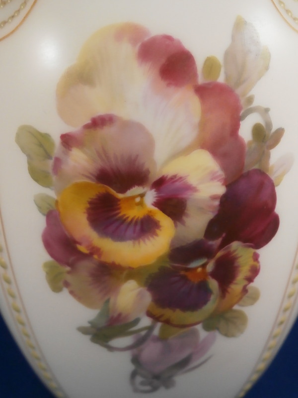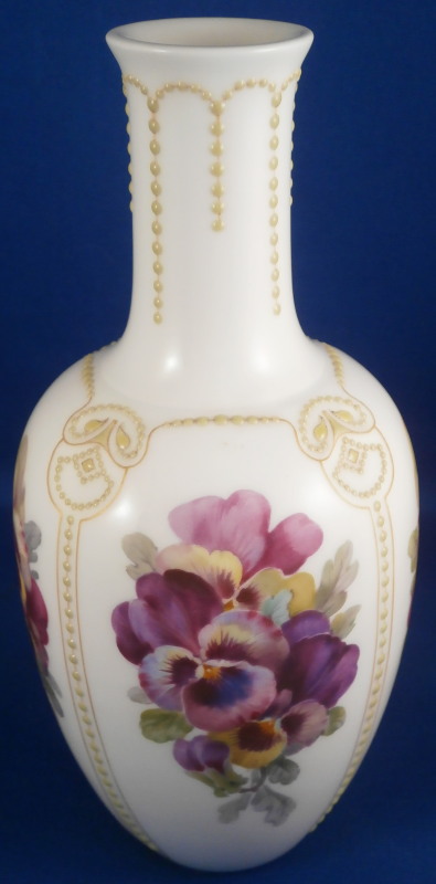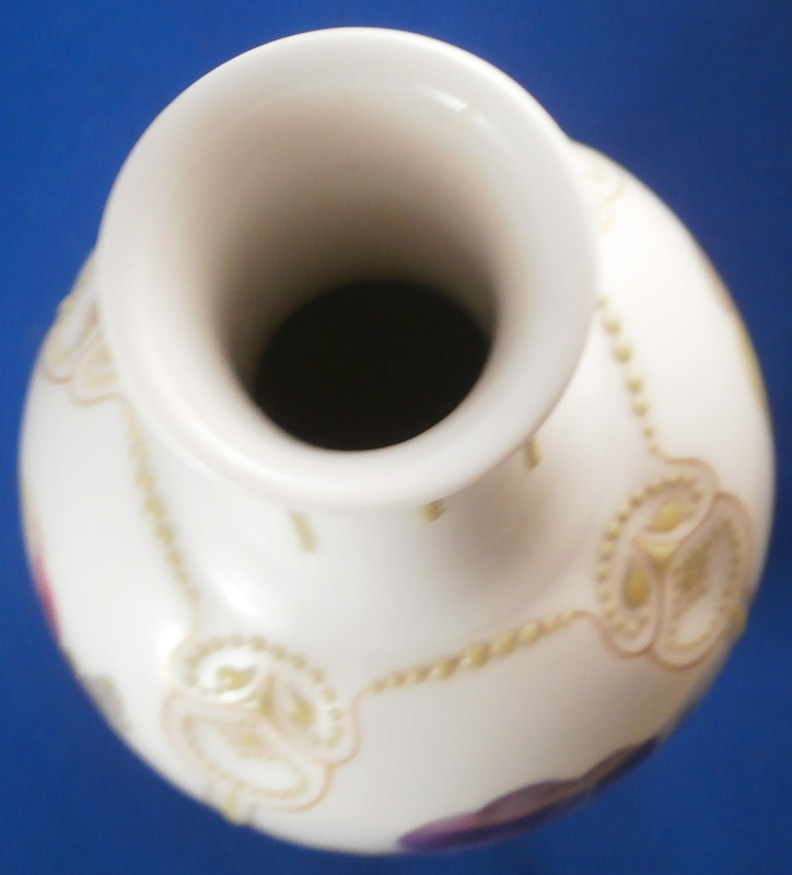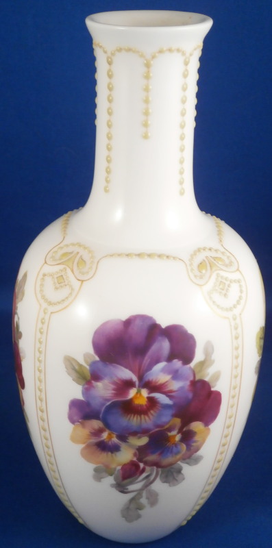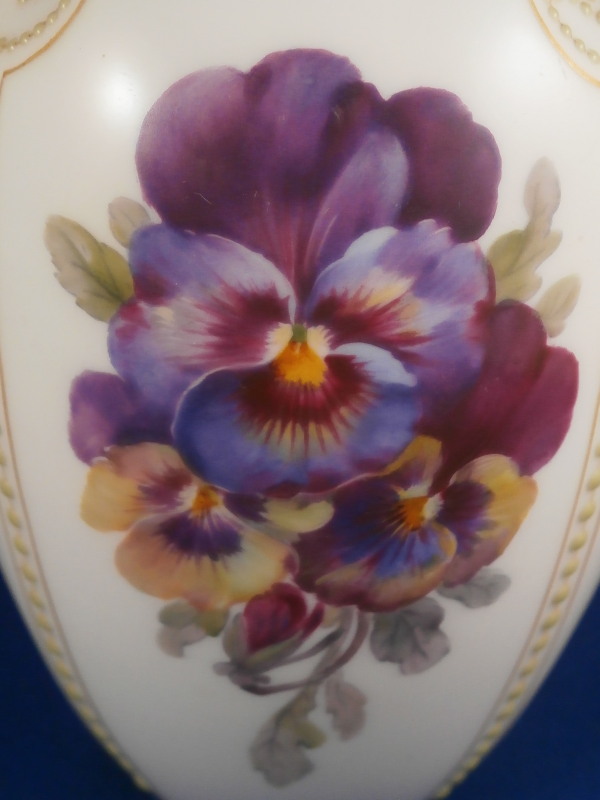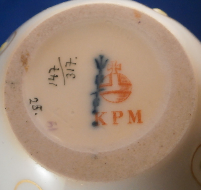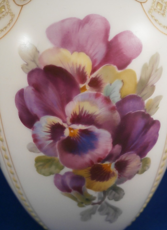 This is a really nice vase made by KPM in the early 20th century during the Art Nouveau / Jugendstil period. The piece is handpainted with four floral arrangements of pansies - two in a darker purple tone and two a bit lighter with more yellow in the mix. These are of superb quality and very much in the Weichmalerei taste of the period. What is unusual and something one rarely sees is that the sections in between the flowers as well as around the neck of the vase have a design of little light green raised "jewels" to it which are made up of the famous Seger enamels of the period. A thin gold trim connecting the raised dots as well as to either side of the design make this one elegant vase! Just an amzing vase and if you love pansies - a must have for sure :) The vase is marked underneath with the under glaze blue scepter mark, the red orb as well as some black numbers and a painter's number. The piece is in perfect condition which is always a plus! The vase is 6.5 inches tall and about 3 inches in diameter. Please email me for more information or other pictures.