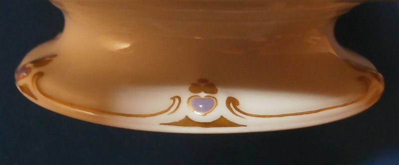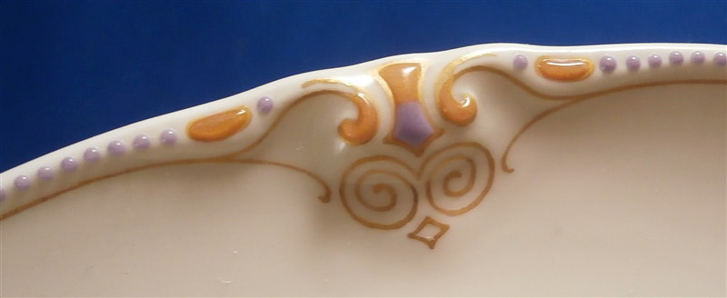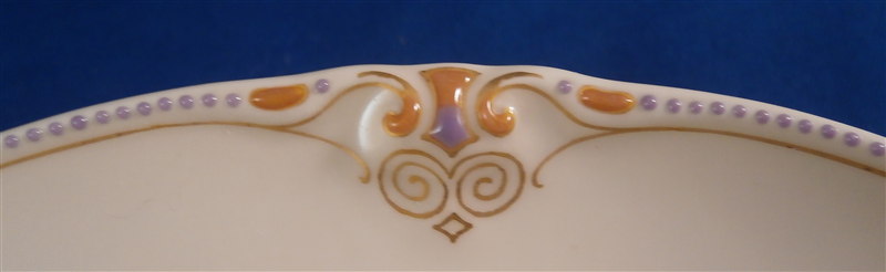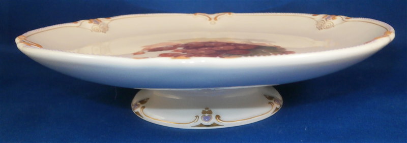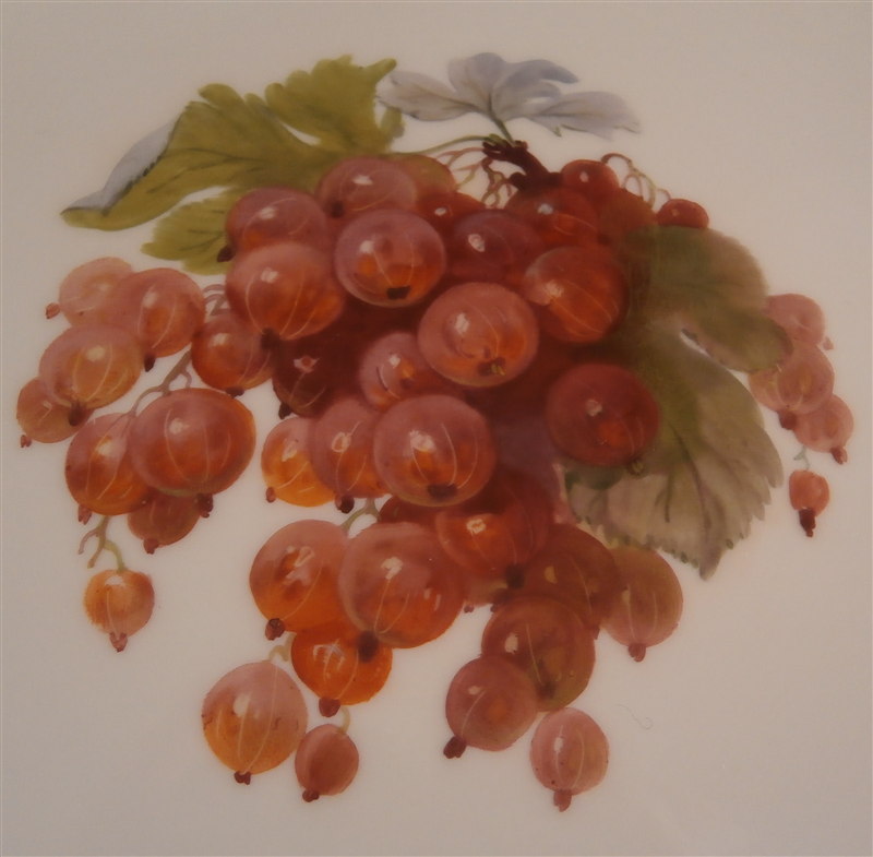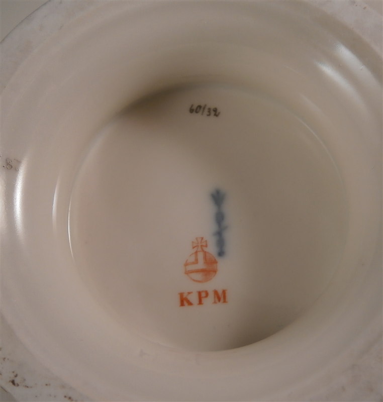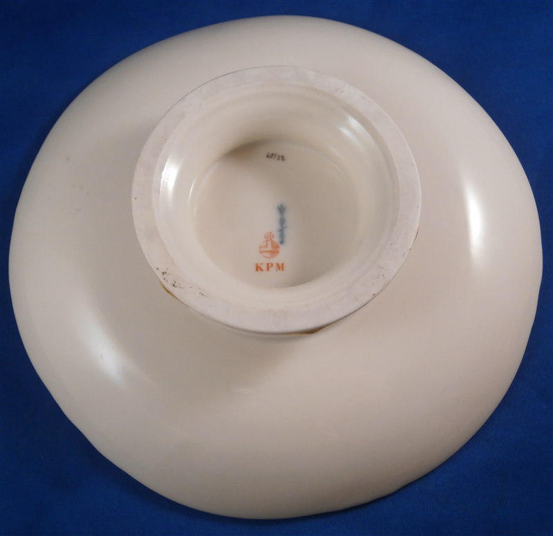 This is a great litte pedestal plate made by KPM in the early 20th century. It is handpainted in the Art Nouveau style with a fancy design on the rim including little purple beads, an ornage color as well as some nice gilding. A very unusual rim design and not one I have seen before incorporating the Seger colors which were pretty new around that time. The foot has the same design on it! The center of the dish has a nice red currant scene including the leaves handpainted on it. The plate is in perfect condition. It is 1.625 inches tall and 7.25 inches in diameter - perfect for some cookies :) Marked underneath with the underglaze blue scepter and the red orb mark as well as the usual impressed and painter's marks. Please email me for more information or other pictures.