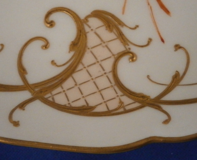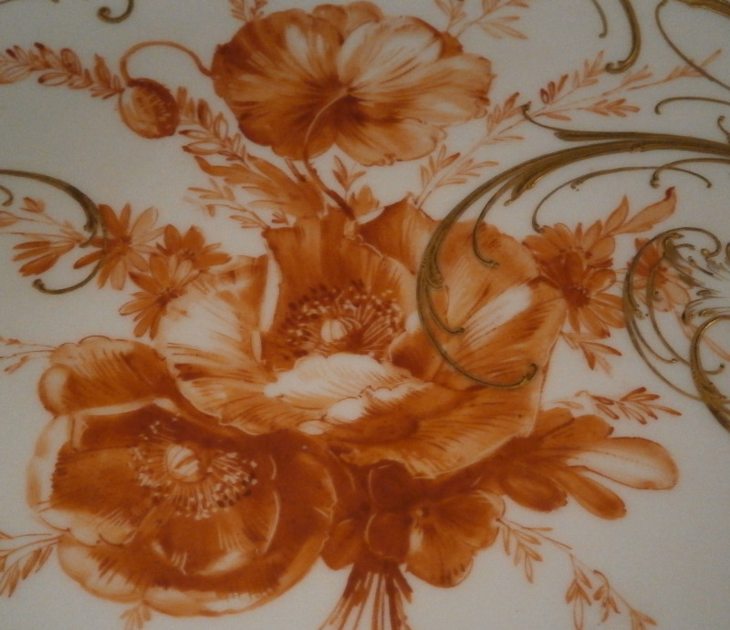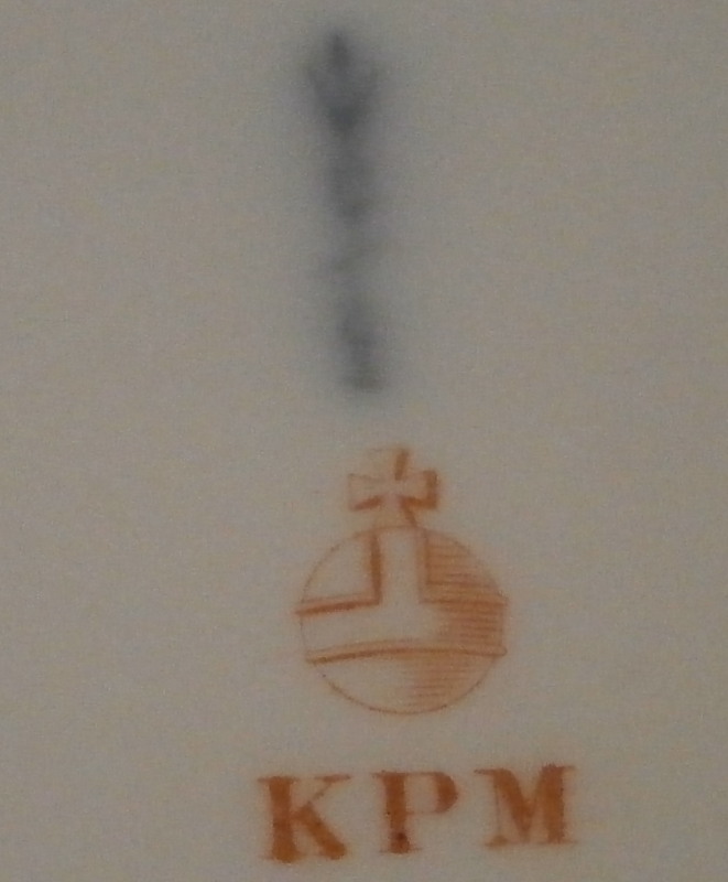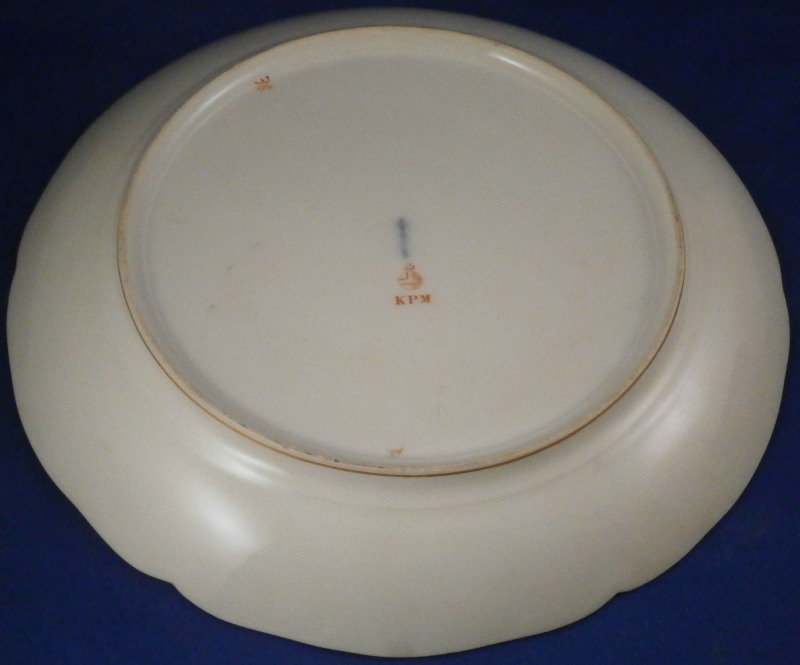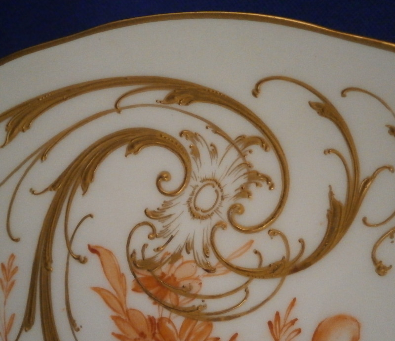 This is a superb plate made by KPM in the early 20th century. It is hand painted with a fun poppy flower scene in the center in all orange with lots of raised gold around the rim some of which goes into the center over the flowers. Gives it that amazing Art Nouveau / Jugendstil feeling we all like to much of this period. The nicely shaped edge has some more gold trim to it. The piece is in perfect condition which always helps. The plate is 1.125 inches tall and 8.5 inches in diameter. It is marked underneath with the underglaze blue scepter as well as the red orb mark and the usual impressed and painter's / gilder's marks one finds on KPM pieces from this period. Please email me for more information or other pictures.