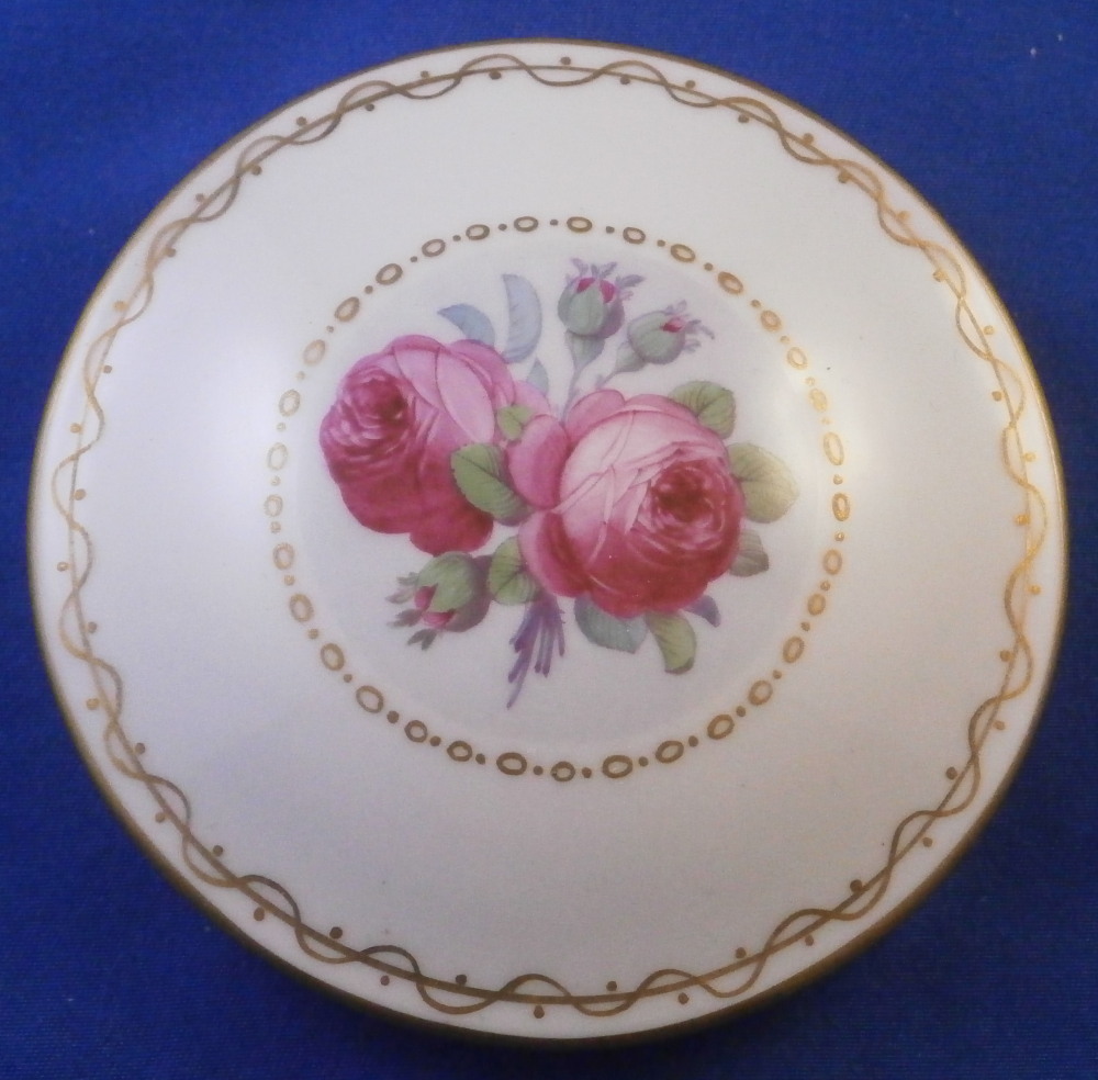 This is a nice little lidded box made by KPM in the early 20th century during the Art Nouveau / Jugendstil period. It is hand painted with a nice gold trim on the rim of the bottom part, the edge of the lid and around a superb central medallion that has hand painted roses in it. Top quality painting!! The box has a nice shape to it as well. The piece is in perfect condition. It is 2 inches tall and has a diameter of 3.25 inches. It is marked underneath with the under glaze blue scepter, the red orb as well as some artist marks and impressed marks normal on KPM pieces of this period. The inside lid also has the matching numbers to it. Please email me for more information or other pictures.