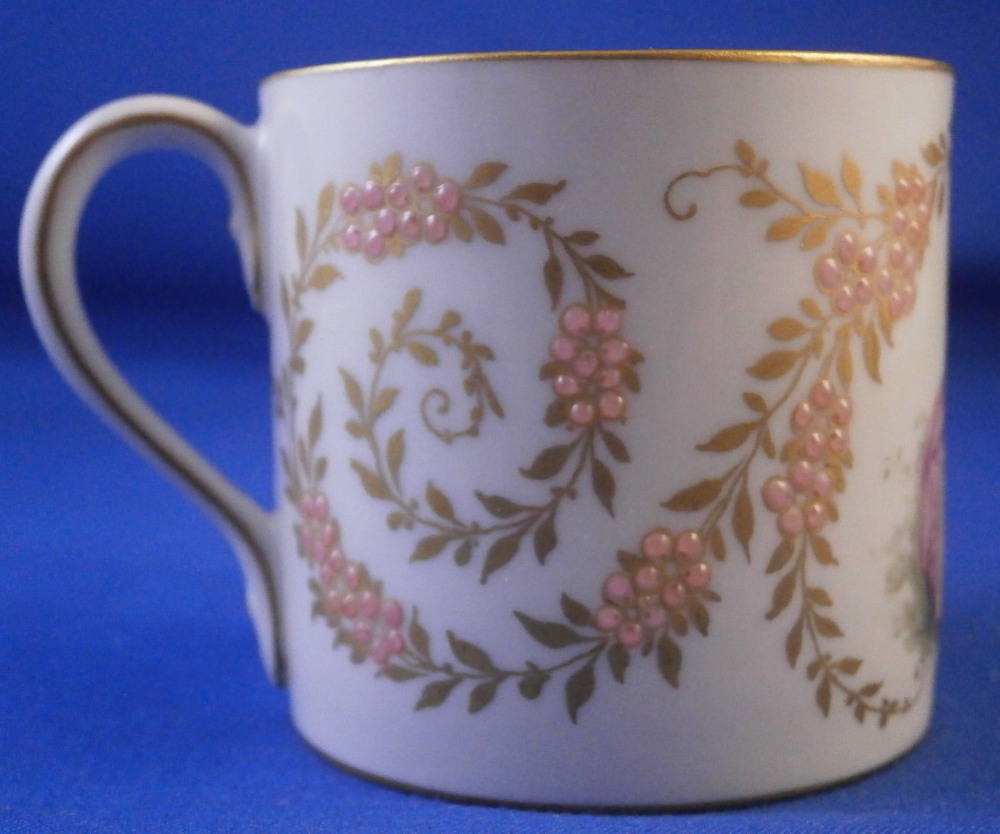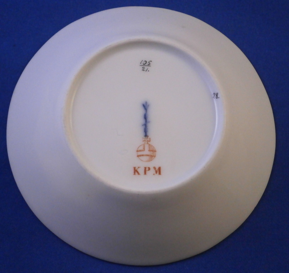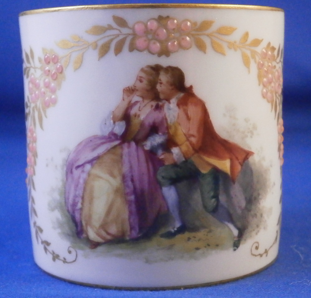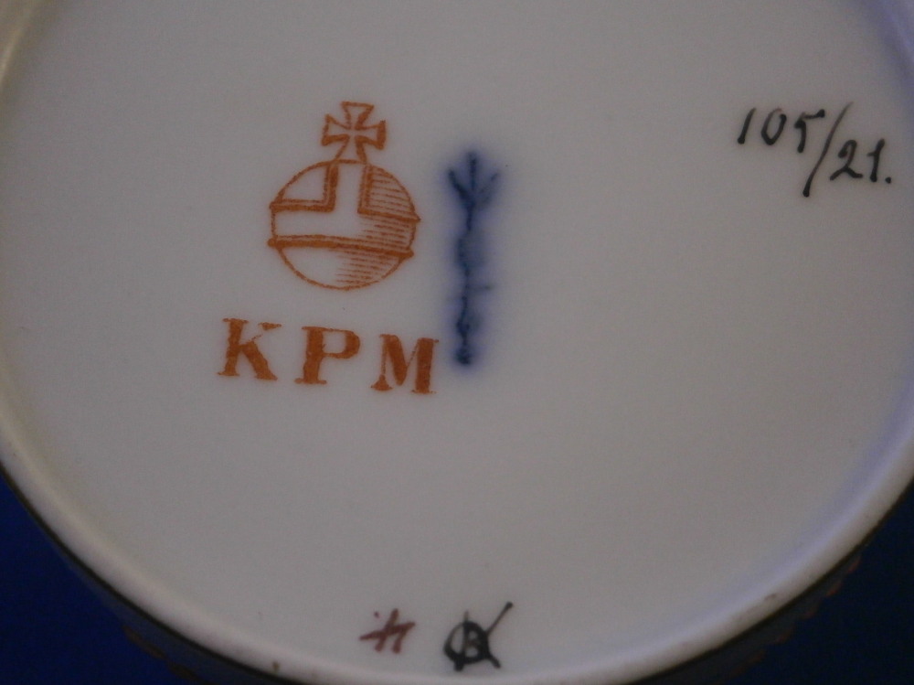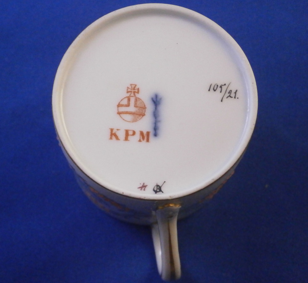 This is a really nice demitasse or mocha coffee cup and saucer made by KPM in the early 20th century. Such a cute set with the saucer having a gold leaf garland and pink raised "jewelled" flowers to it with a gold trim to the edge. These raised Seger enamels are so awesome and there is a reason they are referred to as "jewels" since they look like tiny ones! The cup has a superb scene to the front and the same gold leaf garland and pink "jewels" design along the sides. Gold trim to the top edge and handle. A really cute cup and saucer! Both are in perfect condition and marked underneath with the under glaze blue scepter as well as the red orb as well as various decorator's marks etc. as shown. The cup is 1.75 inches tall and 1.875 inches in diameter. The saucer is 0.75 inches tall and 3.75 inches in diameter. Please email me for more information or other pictures.