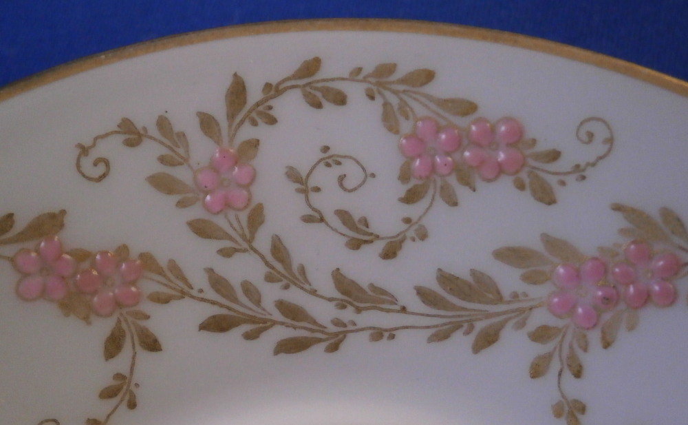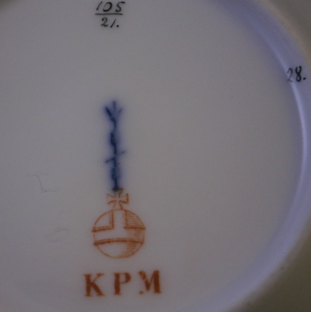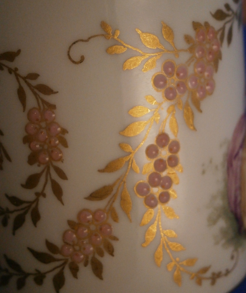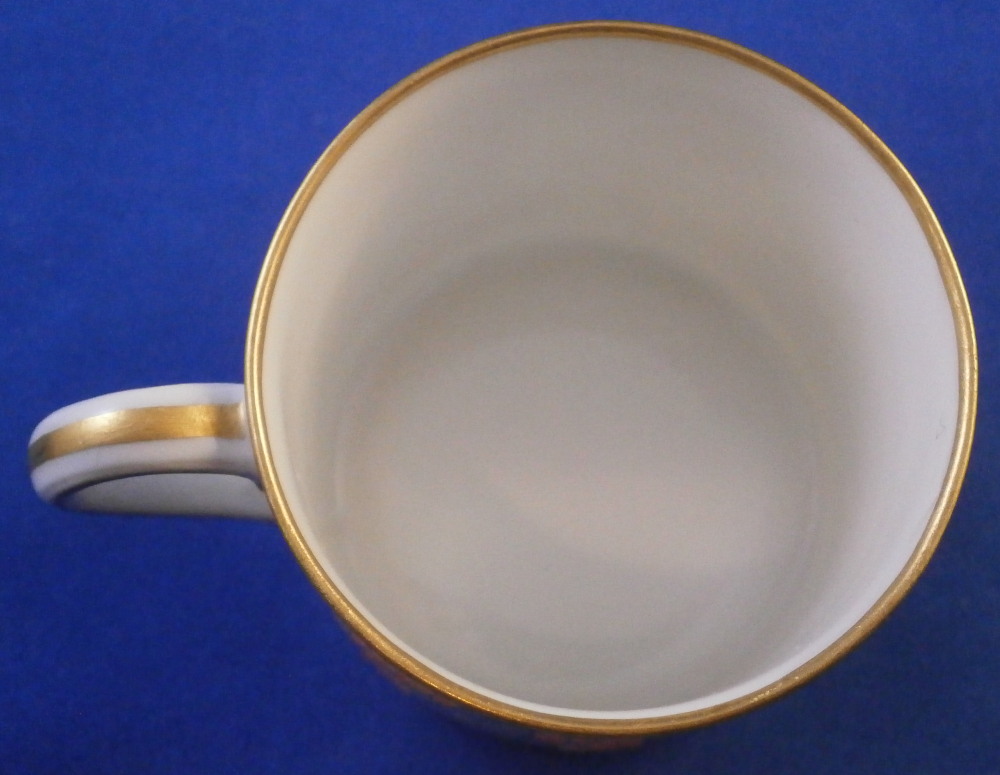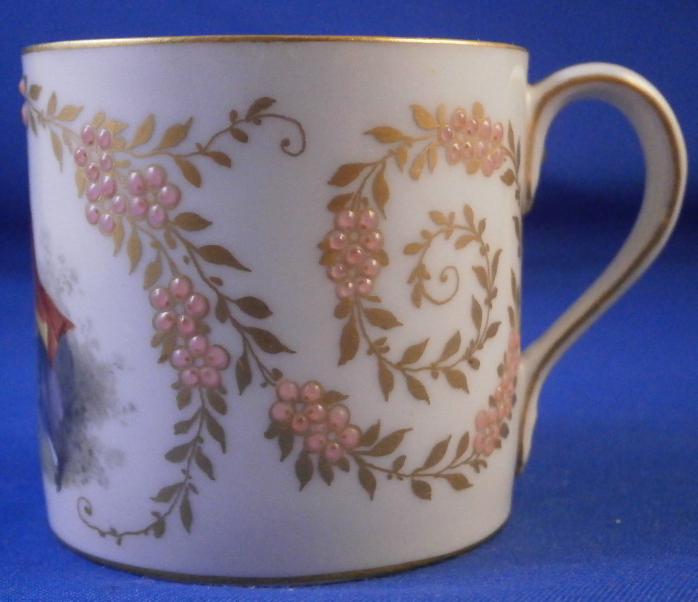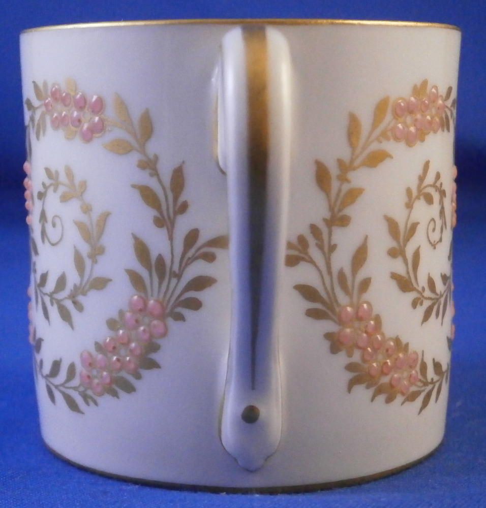 This is a really nice demitasse or mocha coffee cup and saucer made by KPM in the early 20th century. Such a cute set with the saucer having a gold leaf garland and pink raised "jewelled" flowers to it with a gold trim to the edge. These raised Seger enamels are so awesome and there is a reason they are referred to as "jewels" since they look like tiny ones! The cup has a superb scene to the front and the same gold leaf garland and pink "jewels" design along the sides. Gold trim to the top edge and handle. A really cute cup and saucer! Both are in perfect condition and marked underneath with the under glaze blue scepter as well as the red orb as well as various decorator's marks etc. as shown. The cup is 1.75 inches tall and 1.875 inches in diameter. The saucer is 0.75 inches tall and 3.75 inches in diameter. Please email me for more information or other pictures.