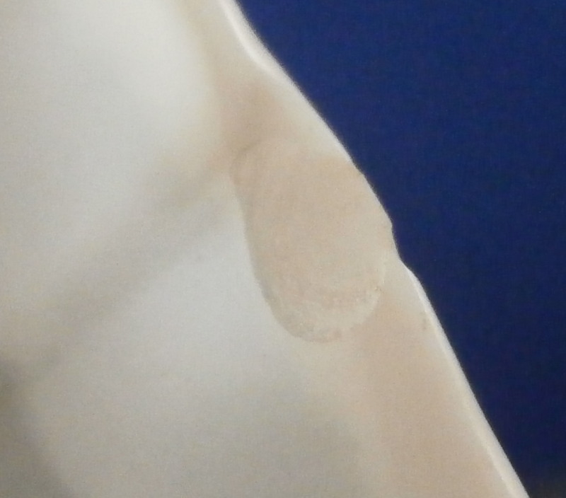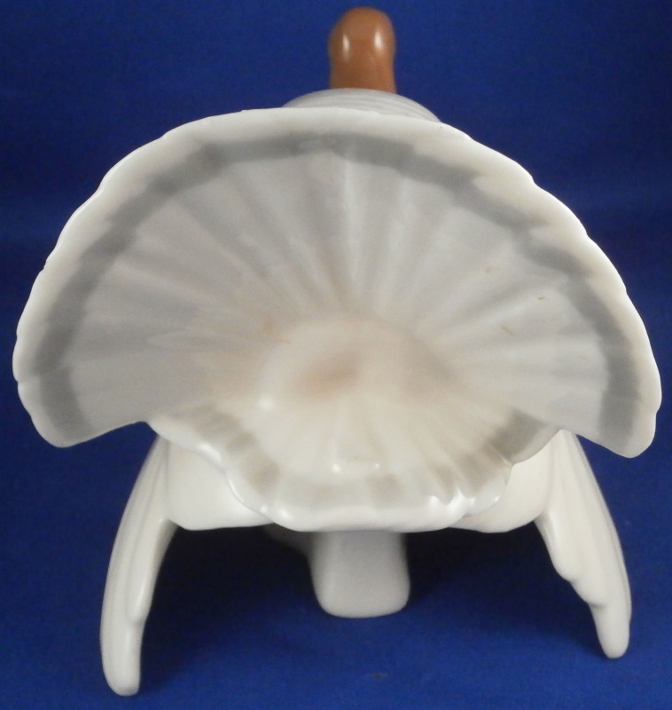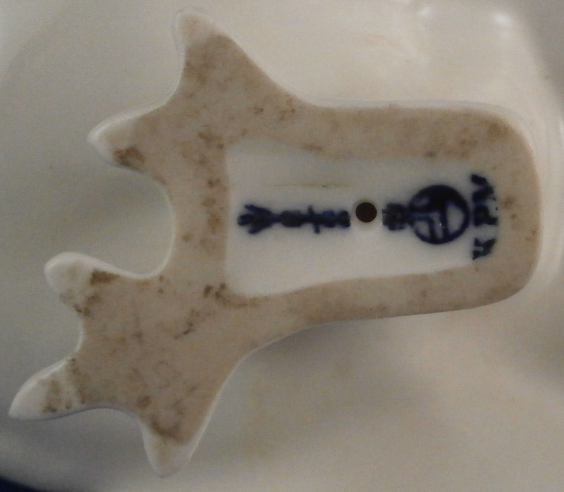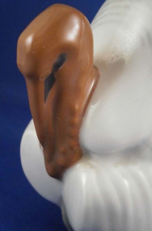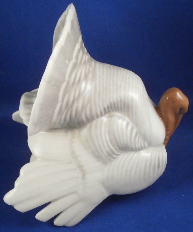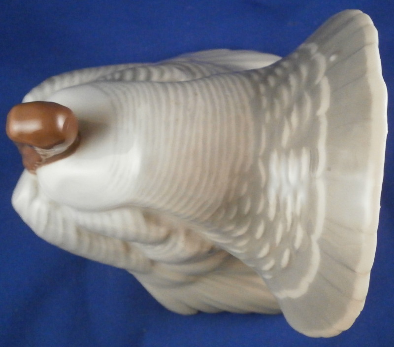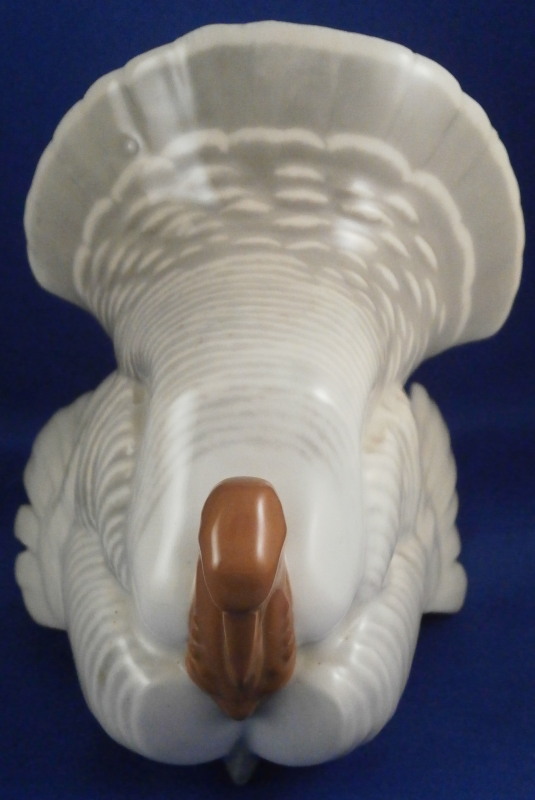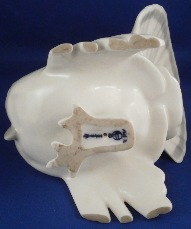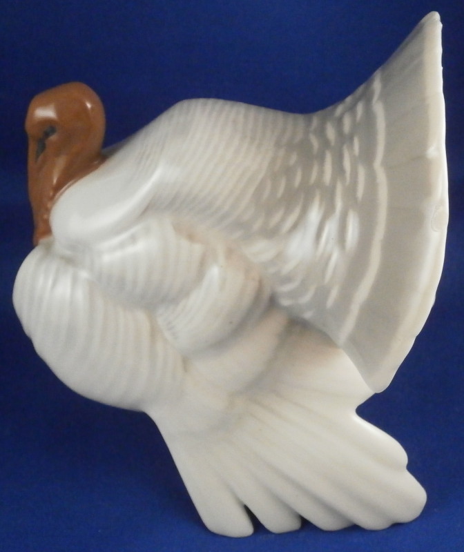 This is a fun turkey figurine made by KPM in the early 20th century. It was designed by Carl Wilhelm Robra around 1909 and is painted in underglaze colors which was really only done during the Art Nouveau era and is very nice! This model is very ahrd to find and I ahve not seen it in these lightter colors. A stunning look. The bird is hand painted in grey tones with a reddish head and neck. The figure displays perfectly but there is a light colored bump on his tail which is the reason for the second choice cut byt the mark and a very shallow chip to the edge of the tail. Neiter takes away from the piece. It is perfect for your Thanksgiving table! The piece marked in the back with his monogram WR as well as underneath with the underglaze blue scepter mark and the blue orb mark. The piece is 4.75 inches tall, 4.5 inches deep and 4.25 inches wide. Please email me for more information or other pictures.