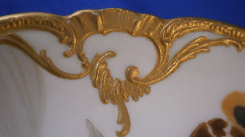 This is something special. I own and have owned some amazing Neuzierat plates by KPM over the years but this one is by far the nicest I ahve ever come across! The plate is hand painted in the Weichmalerei style and was made in the early 19th century during the Art Nouveau / Jugendstil period. The entire surface of the plate is hand painted with a top notch flower design including some end stage flowers that look dried, a poppy seed pod, some leaves and grasses with a superb moth and bee flying above. Normally these are done in fruit designs or flowers in the center but to have this sort of amazing design covering the entire plate is very unusual. I do own plates with this sort of painting but not in the Neuzierat style with the relief rim that is superbly gilded. It's a stunning look! An instant favorite for my wife :) w I cannot tell you how amazing this plate looks so have a look at the picture to get an idea - though it looks better in real life. A truly superb plate and it is in superb condition. The piece is 1 inches tall and 8.5 inches in diameter. It is marked underneath with the under glaze blue scepter, the red orb mark as well as a gilder's mark and a red Mx as a painter's mark which I assume is for the famous Paul Miethe! The usual impressed marks as well as shown. Please email me for more information or other pictures.
