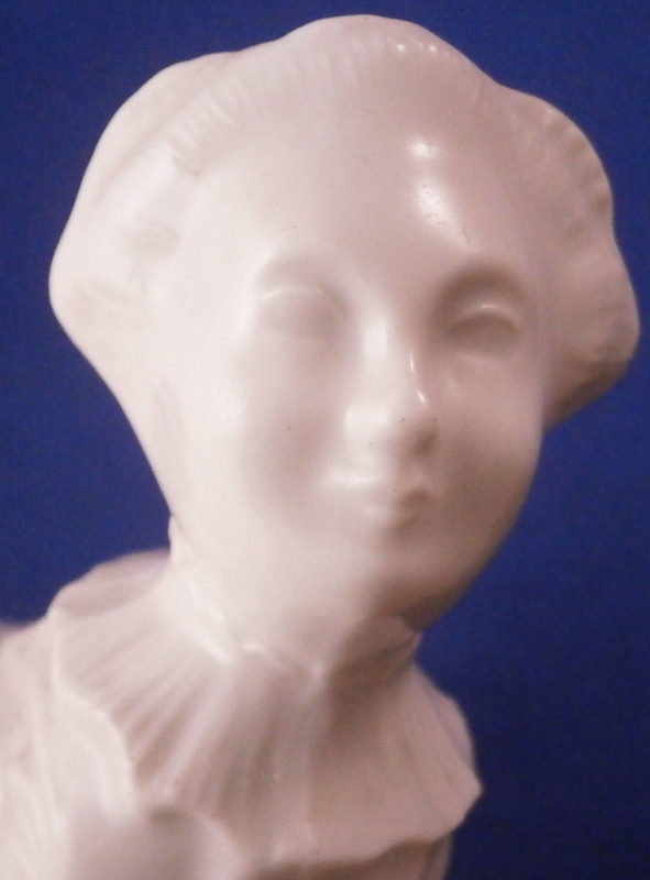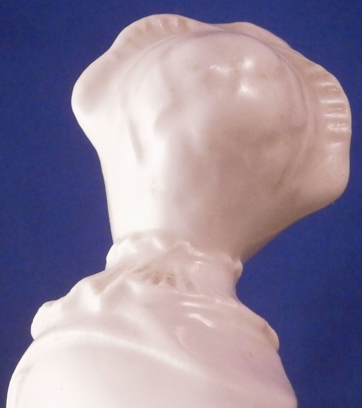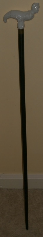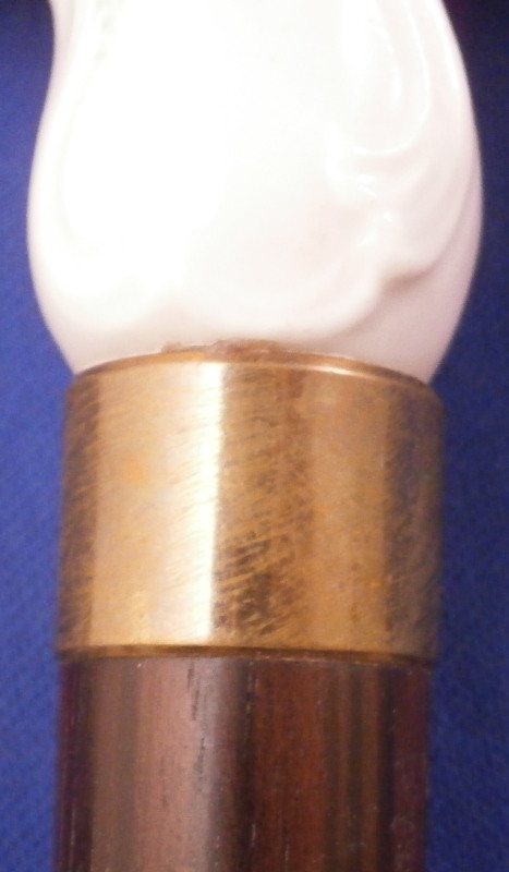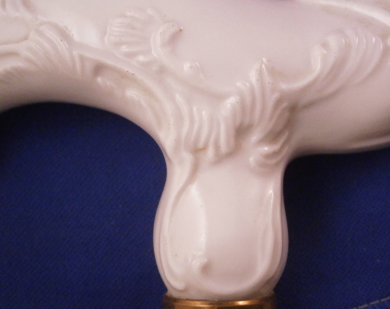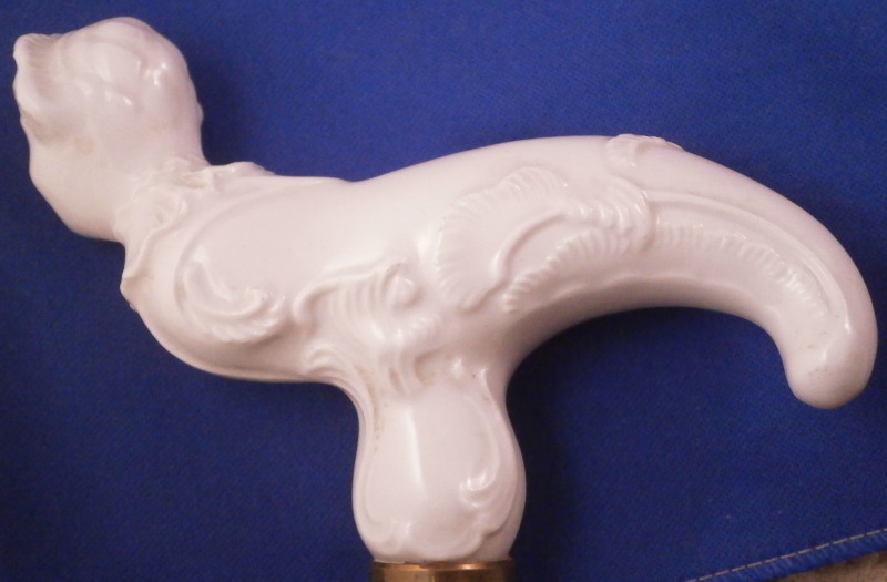 This is a superb cane handle made by KPM which is attached to a cane. It is impossible to tell the age of it due to it not being painted. They made these in the 18th century and also 19th and probably even earlier on in the 20th century. I am pretty sure it is not 18th century since the porcelain is absolutely perfect without any flaws or imperfection so that leaves 19th 0r 20th century. I ahve no come across a blanc de chine version before but when they are painted it is usually of a veiled lady’s head with the body making the shape of the handle. The body has a relief design all over that makes this a very elegant cane handle! The porcelain is attached to a wooden cane with a brass sleeve fitting and the bottom end of the cane is some other type of material - feels a bit like horn from a cow but could be plastic. No idea if the cane is original or a later addition. Impossible to tell but it looks great together and is in great shape with a crack in the horn part at the bottom as shown. The pporcelain is in perfect condition. The porcelain part is 3 inches tall, 4.5 inches long and 1.25 inches wide. The entire cane is about 34 inches long. No mark can be seen but the porcelain handle was made by KPM. Please email me for more information or other pictures.