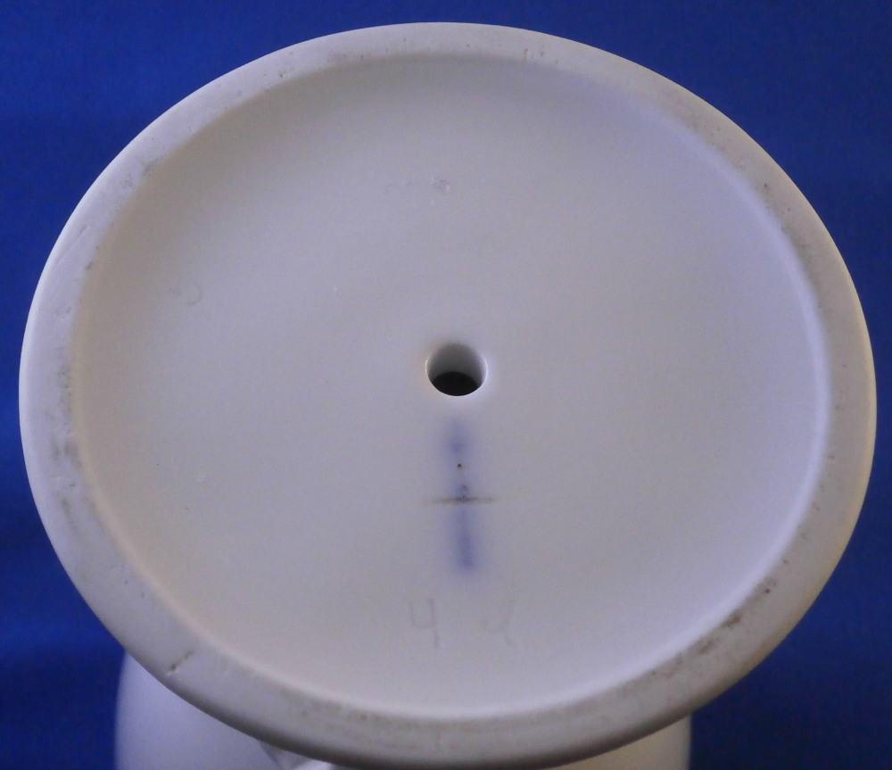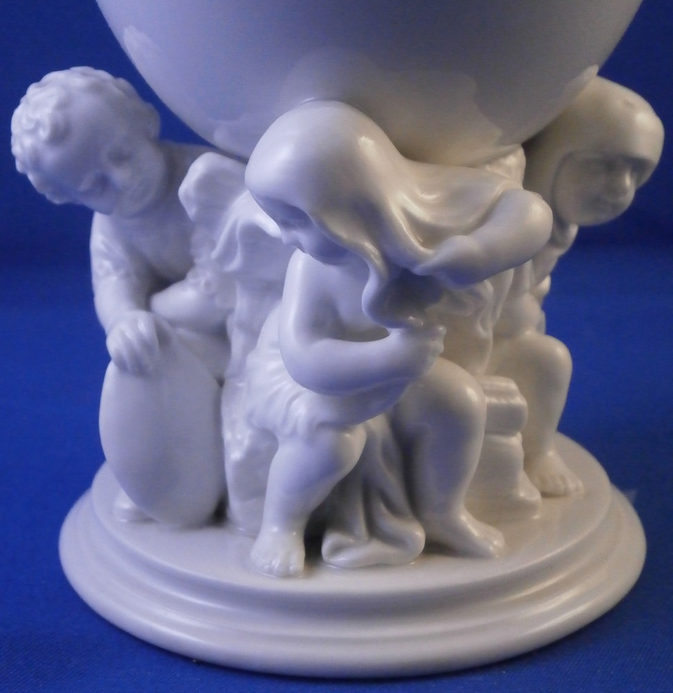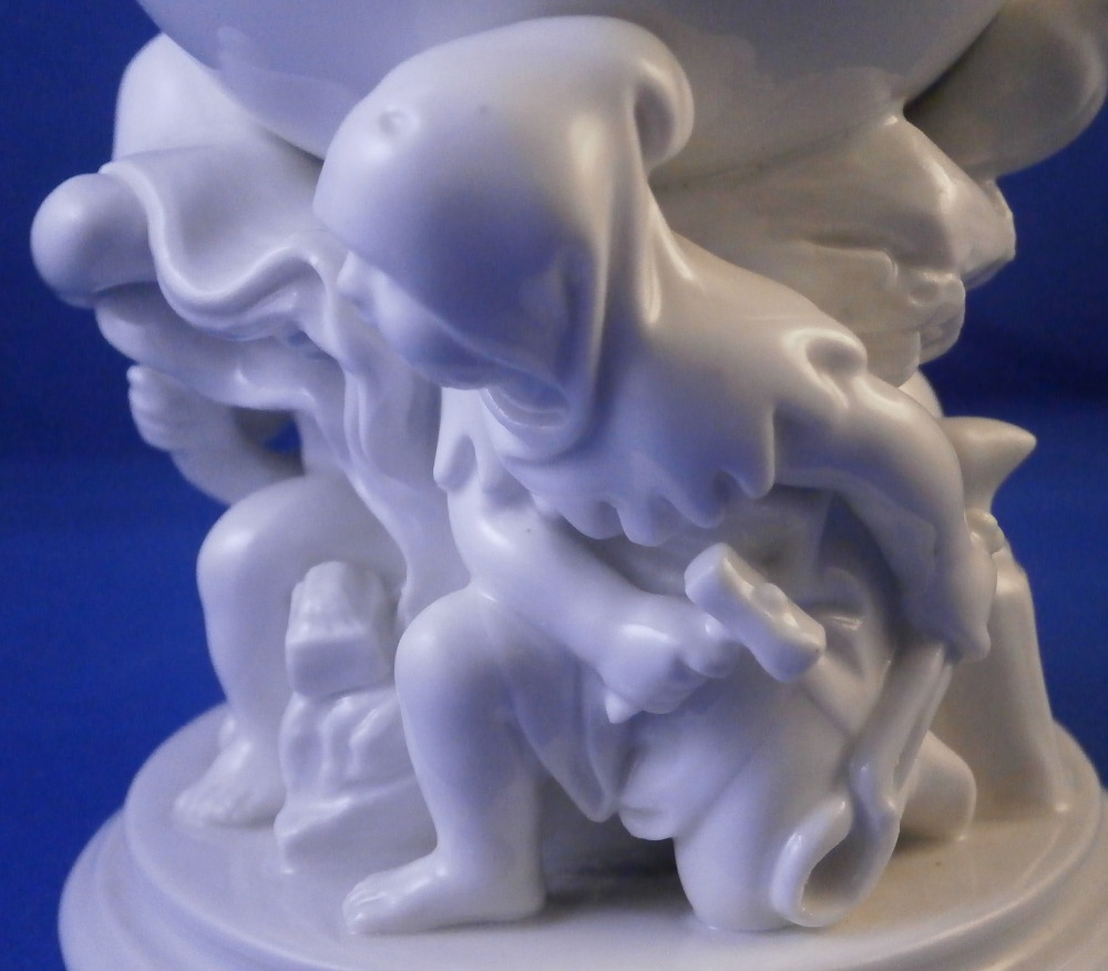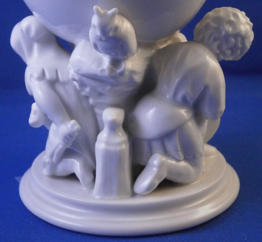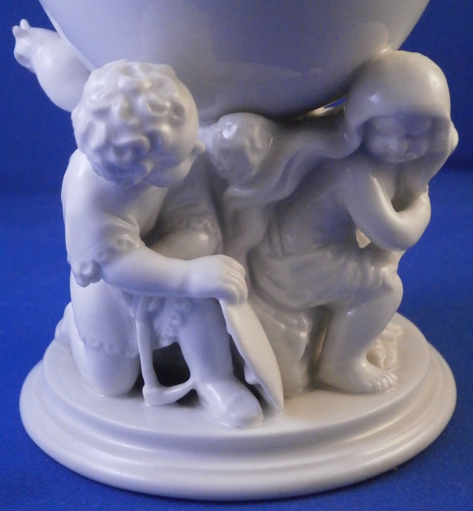 This is a fun cup / chalice / goblet or whatever you want to call it made by KPM in the early 20th century. I ahve come across these over the years but never a white one and never one that was painted by KPM either. They were always second choice it seems as is this one here though I ahve no idea why. The piece is superbly modeled as a small simple cup at the top with three child figures holding it up on a nice base. Not sure what the children are meant to represent but it seems to be a bit of an odd mix. There is one draped with a cloth over the hear which I would interpret as winter. One is definitely a blacksmith with an anvil behind him, there is a cute owl perched in the rocks over the anvil and the last figure is holding a pickax and shield maybe for mining? I really like that is is all white instead of painted in a low quality way as most are so I was excited to find it. Maybe I'll make it my new morning coffee cup :) The piece is in perfect condition. It is 5.25 inches tall with a top diameter of 3.375 inches. Marked underneath with the under glaze blue scepter mark with a cut across it as well as the usual impressed marks one finds of KPM during this period. Please email me for more information or other pictures.