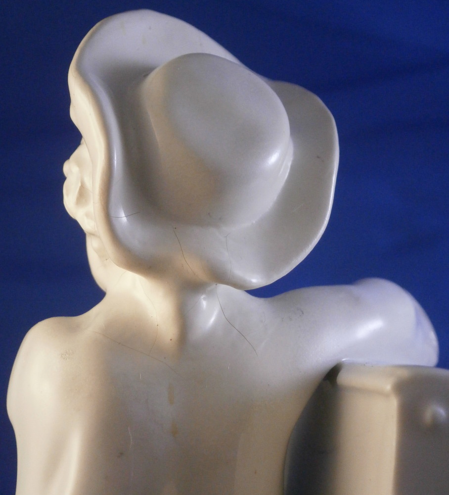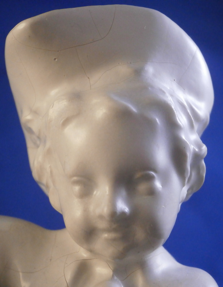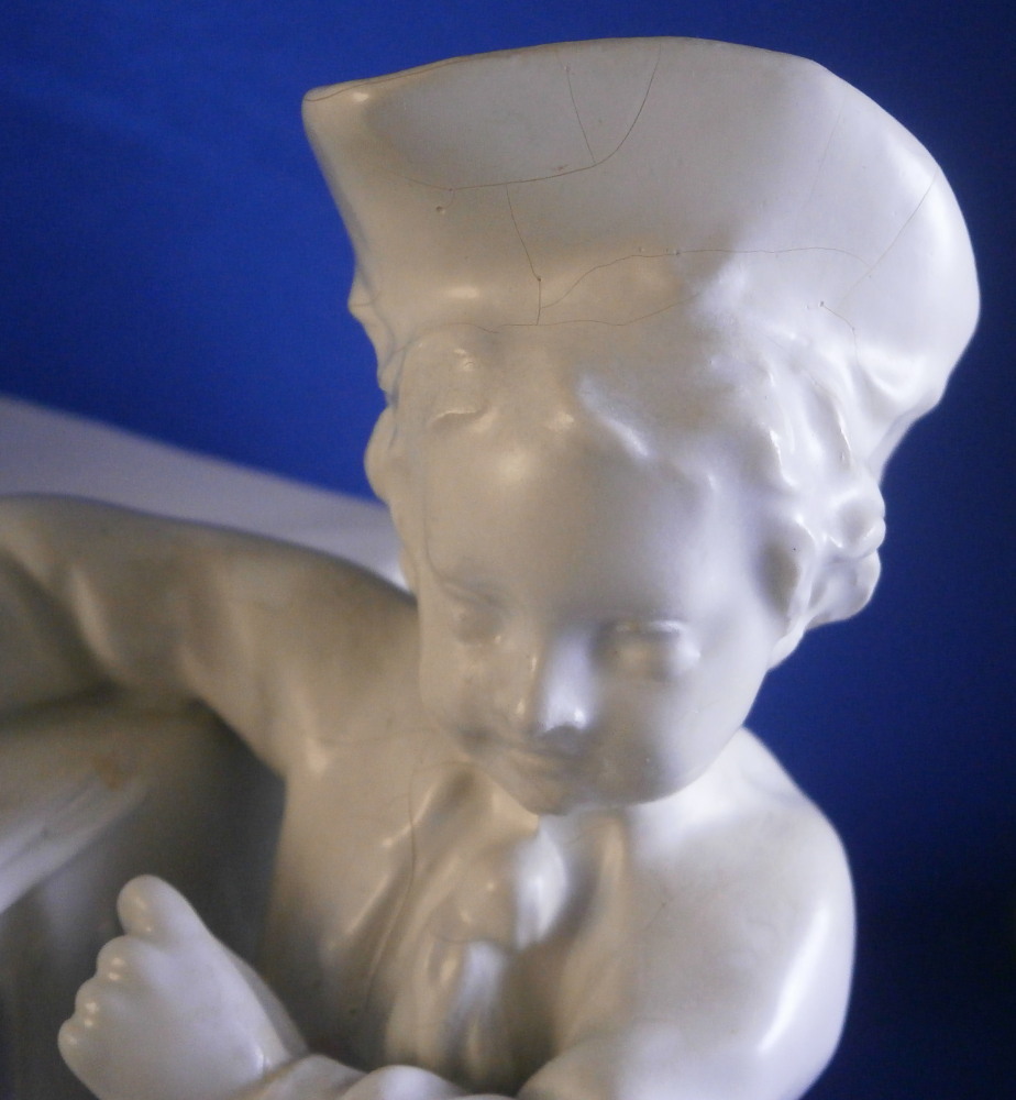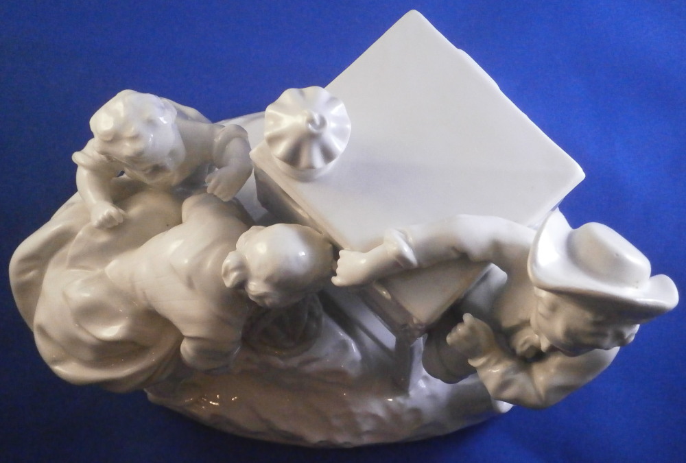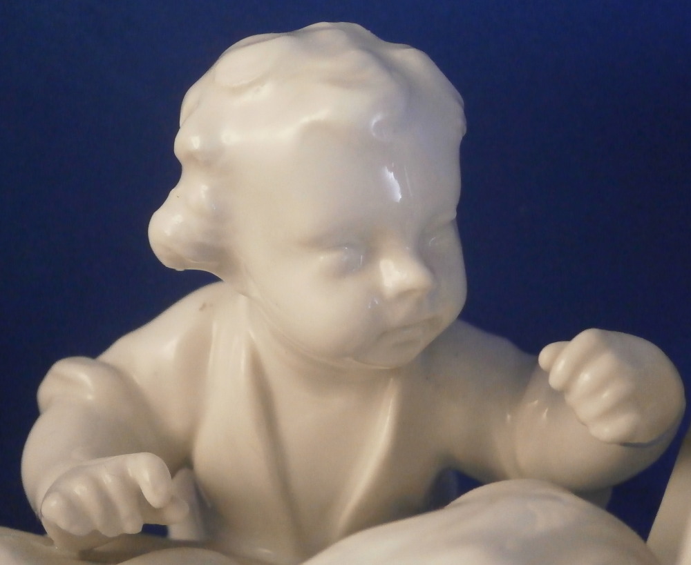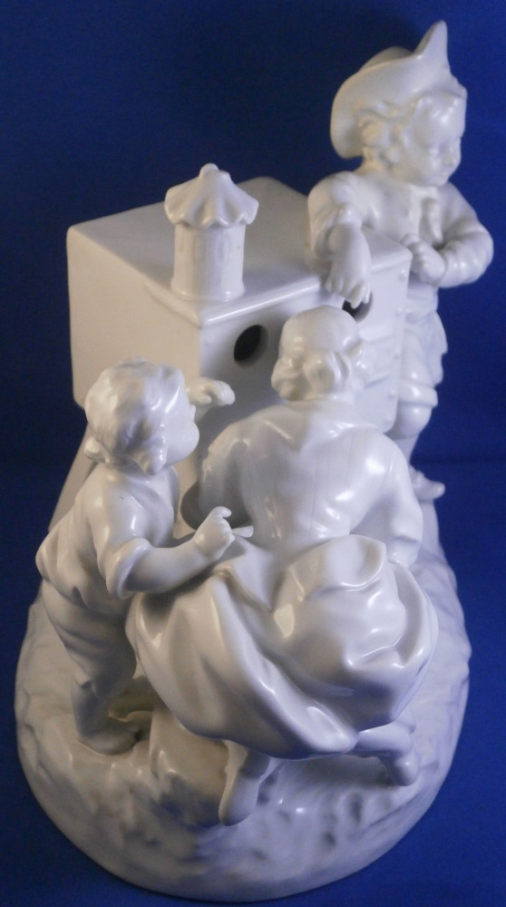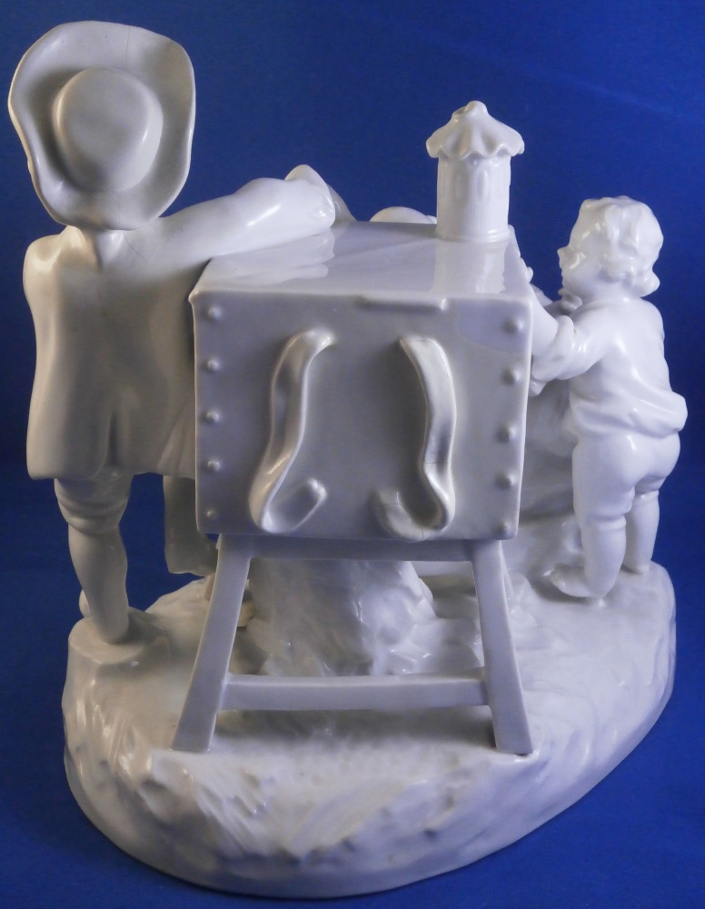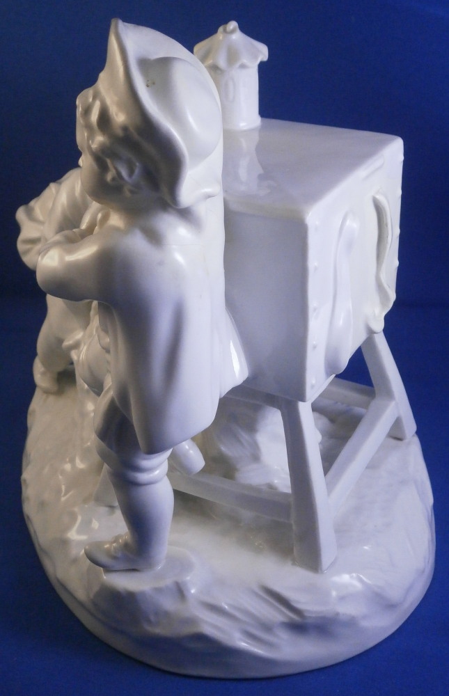 This is a superb figurine of an interesting subject made by KPM in the early 20th century. A very rare model to find but this same figure was also made by Chelsea / Derby and Sevres but I am not sure if they copied them from each other or it was done from an engraving. I assume it is the latter. This is the version left in the white but I also own the hand painted version. The subject is of a lady looking into a laterna magica devise which is sort of the earliest precursor to our modern day movies. There is a gentleman to the side and a child next to her. The piece is nicely modeled with lots of details. The figure is in decent condition and displays nicely but the gentleman's head has been off and repaired and one of the straps by which he would carry the devide has also been worked on. The edge of his hat have also been worked on by the look of it. Not obious when on display but the restoration has aged and could be redone to improve it and make it invisible. The figurine is 6.75 inches tall, 7 inches wide and 5 inches deep. It is marked underneath with the under glaze blue scepter that was ground down to hide a second choice line I presume. Also an impressed letter D as shown. Not a piece you will see again anytime soon! Please email me for more information or other pictures.