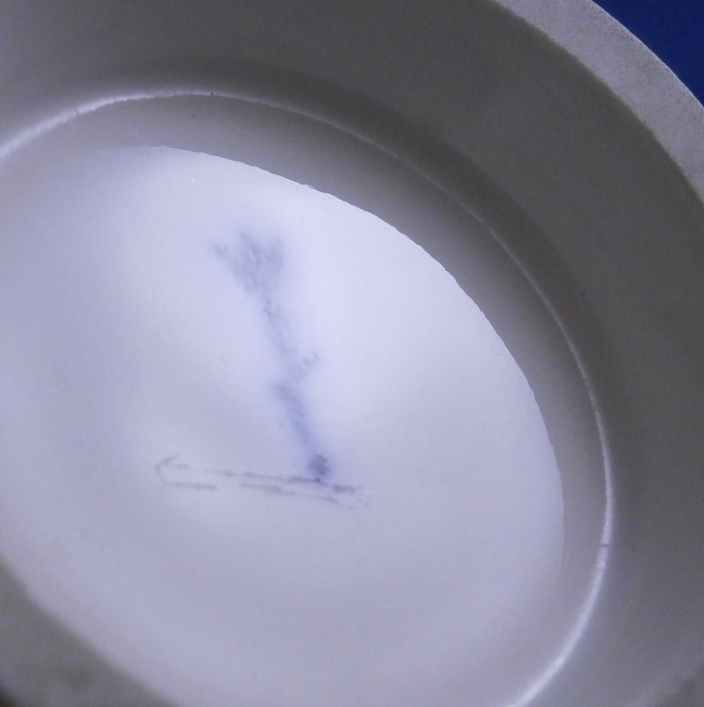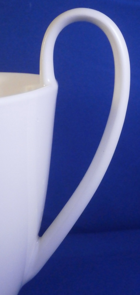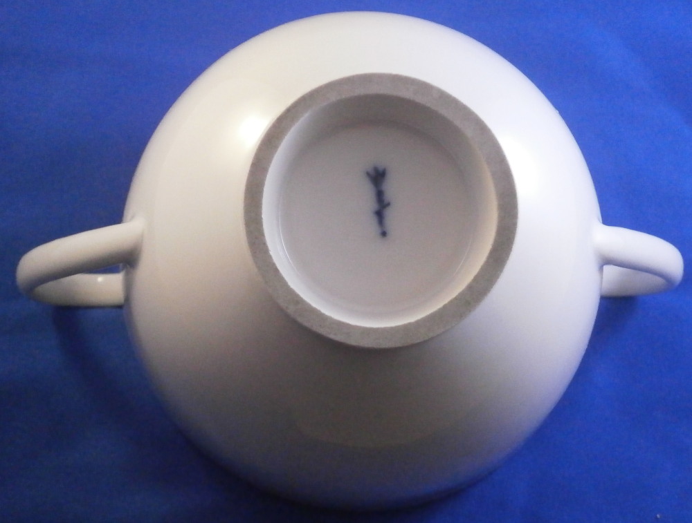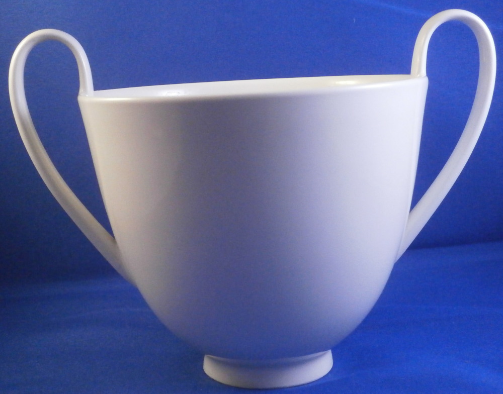 This is a fun blan de Chine vase made by KPM in the 20th century. It is known as the Hölderlin cup and was modeled by the famous Sigmund Schütz. It has a nice shape to it with a large loop handle to either side. Left in the white to show off the nice form. I don't think a painted version exists. It is meant to be a vase but can be used for many other things as well. A very sleek and modern piece. It is in perfect condition. It is marked underneath with the under glaze blue scepter mark as shown. There is a faint line near the bottom so it is probably a second choice though I don't see a reason for that. The piece is 5.25 inches tall at the handles with a diameter of 5.125 inches. The handles stick out about an inch from there. Please email me for more information or other pictures.