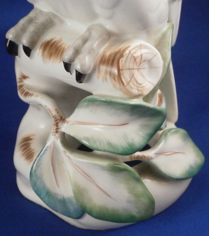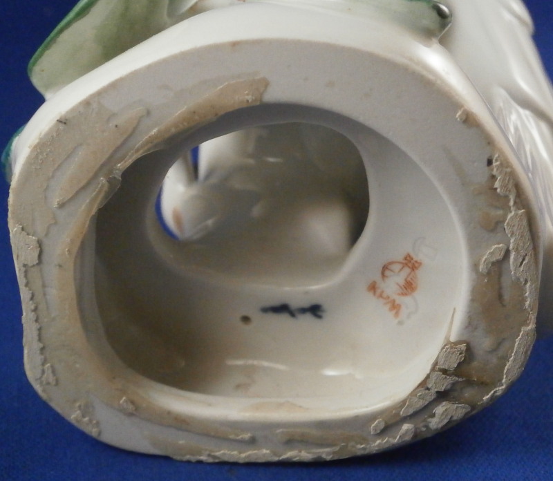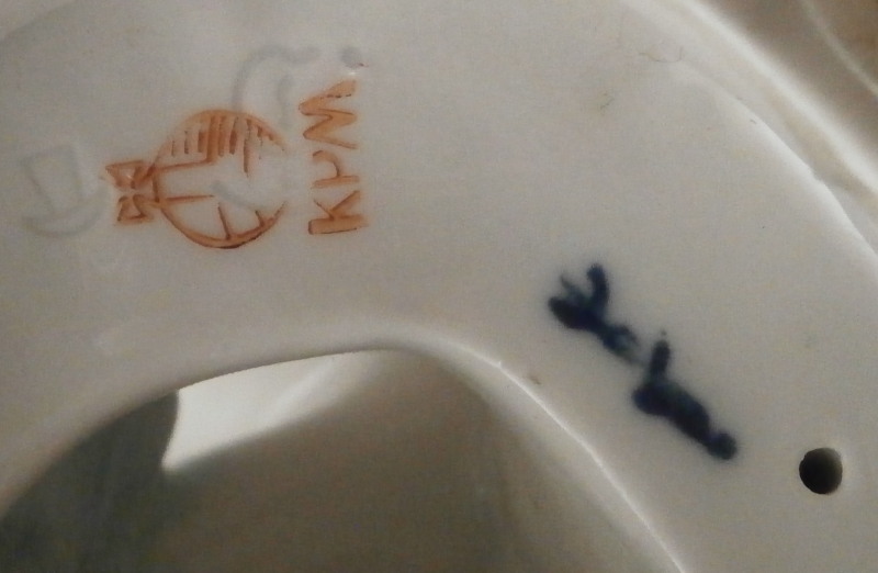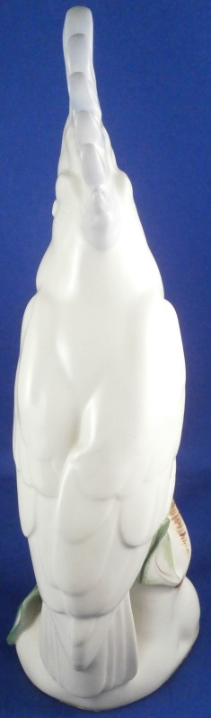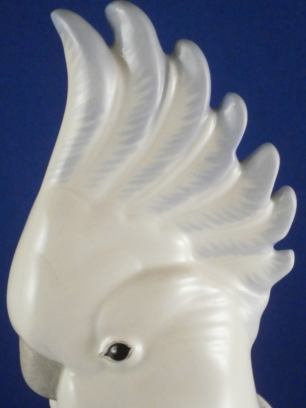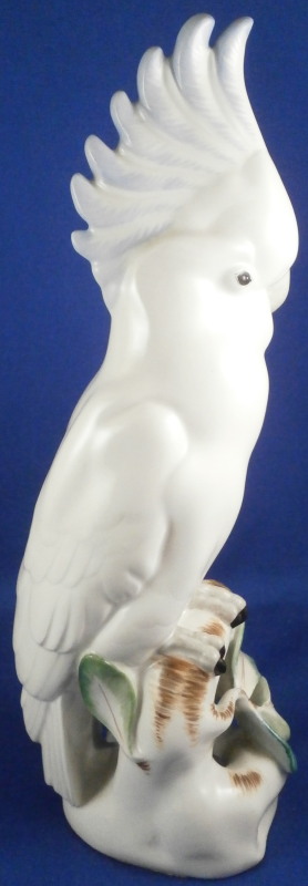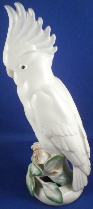 This is a superb figurine of a cockatoo bird made by KPM in the 20th century in the Art Nouveau or Jugendstil style. The bird is modeled superbly and very elegantly painted. I especially like the branch and leaves he is sitting on and the fact that he has blue feathers instead of the usual yellow ones. The figure is in perfect condition. The piece is 9.75 inches tall, 2.75 inches wide and 3.5 inches deep. The figurine is marked underneath with the underglaze blue scepter as well as the red orb mark and the usual impressed marks from this period. First choice. Please email me for more information or other pictures.