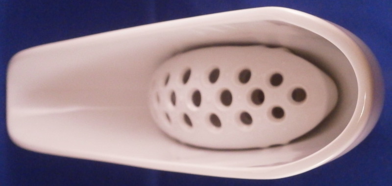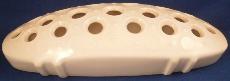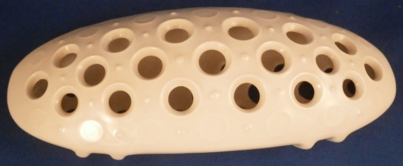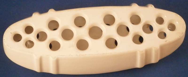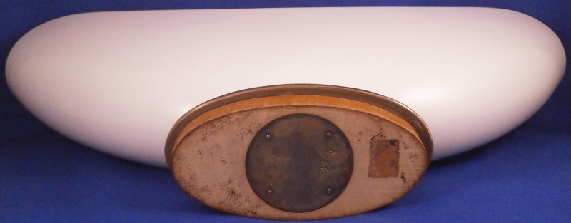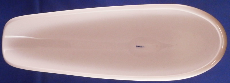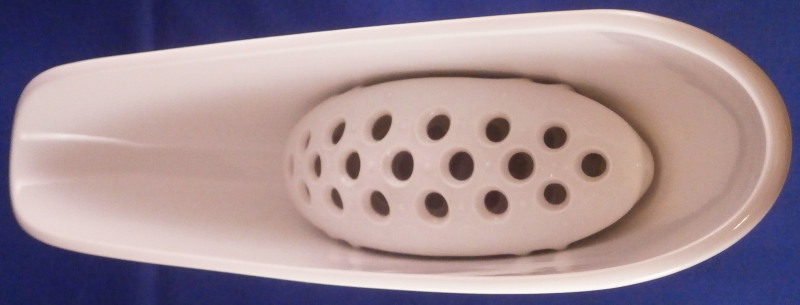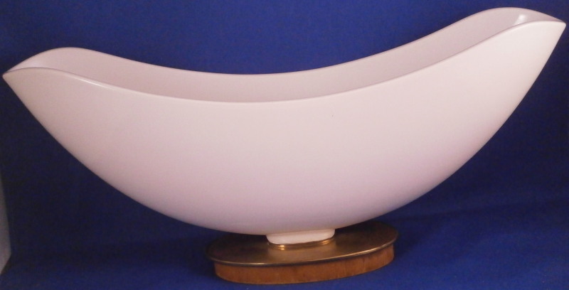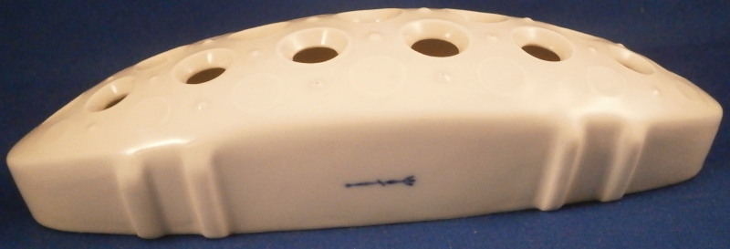 This is a vase made by KPM in the 1950's. This piece is called a flower boat ( Blumenschiff) and was designed by Sigmund Schütz in 1953. It consists of a white porcelain elongated bowl on a wooden base covered with a piece of brass. This one here comes with its flower frog insert which is often gone since it is a separate piece that just fits into the inside bottom. The vase is in great condition with the wood a bit dried out but a quick round of oil will fix that and the brass could use a bit of polishing! The piece is 5.75 inches tall, 3.375 inches wide and 13 inches long. It is marked on the inside with the underglaze blue scepter mark. The flower frog is also white in color (the photos show it more off white but it plain white in person), hollow on the inside and has a nice design to the top. The piece is also in perfect condition. It is 1.5 inches tall, 6.25 inches wide and about 2.5 inches deep. It is marked on the side with the under glaze blue scepter mark as shown. Please email me for more information or other pictures.