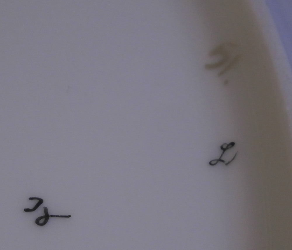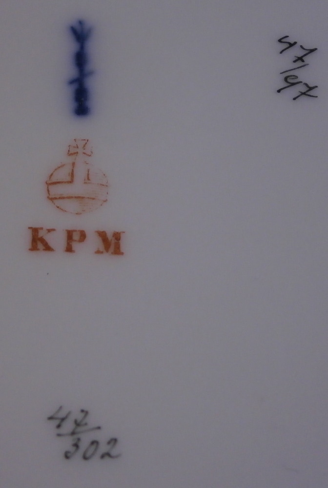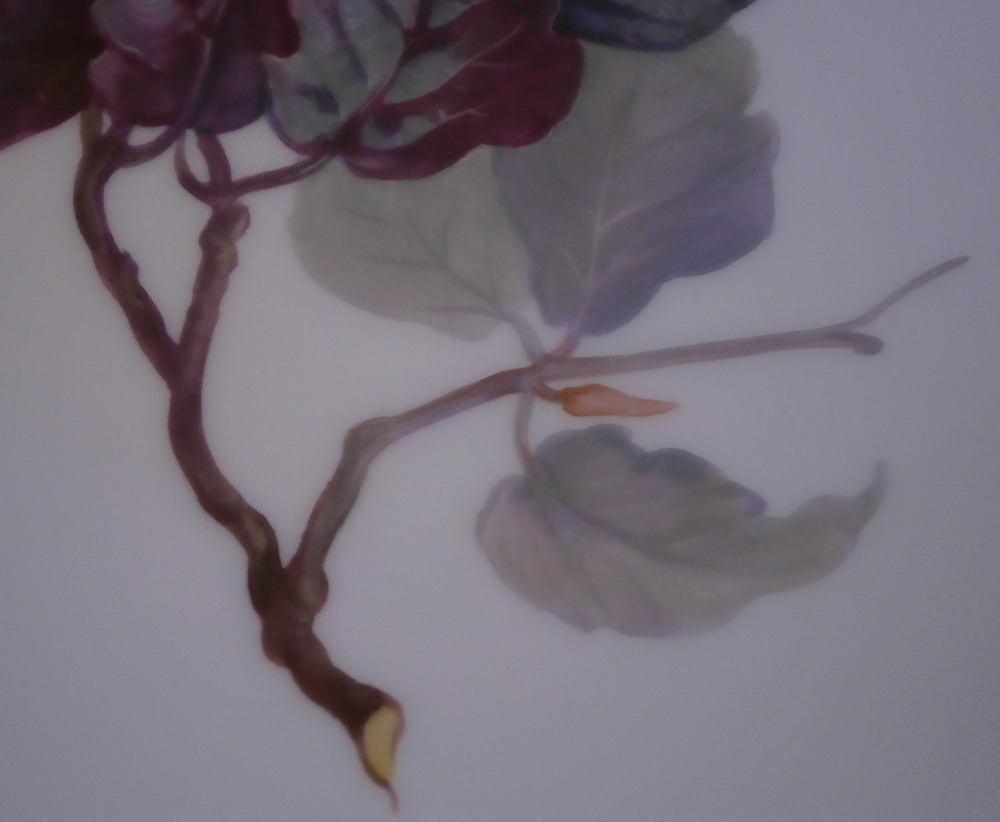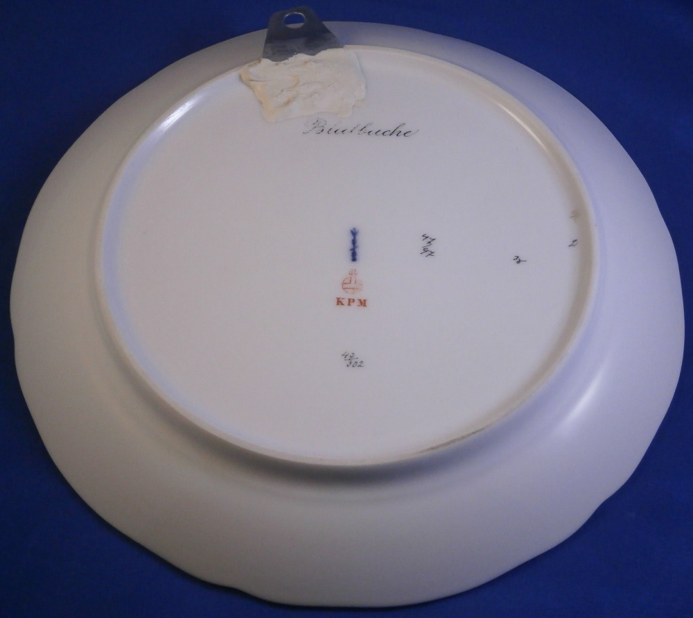 This is a great plate made by KPM in the early 20th century. It has a simple and elegant shape to it with a gold trim to the edge and a really well done hand painted tree branch with its leaves design. This tree branch is from the Copper Beech tree. Nice purple tone leaves and some green ones in the background. Not the most exciting plate in the world but very elegant and better than always having flowers on them! I have not seen one in this style before. The plate is in perfect condition which is always a bonus! It is 8.625 inches in diameter so a nice size and 1 inch tall. The plate is marked underneath with the under glaze blue scepter, the red orb mark as well as a number of painter's and gilder's marks as shown. No impressed marks so this would date it to 1900. The back also has the name of the motif to it - Blutbuche which would translate to blood beech but it is called Copper beech here. Someone has added a hanger to the back and sanded the area underneath the glue and near it a bit so there are some scratches there as shown. Please email me for more information or other pictures.