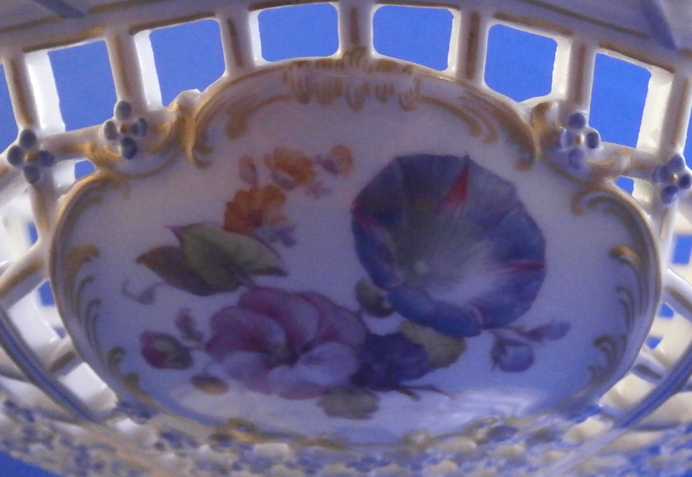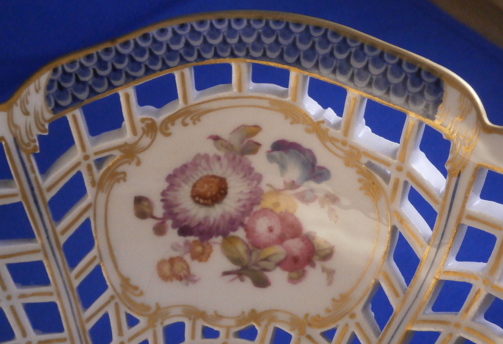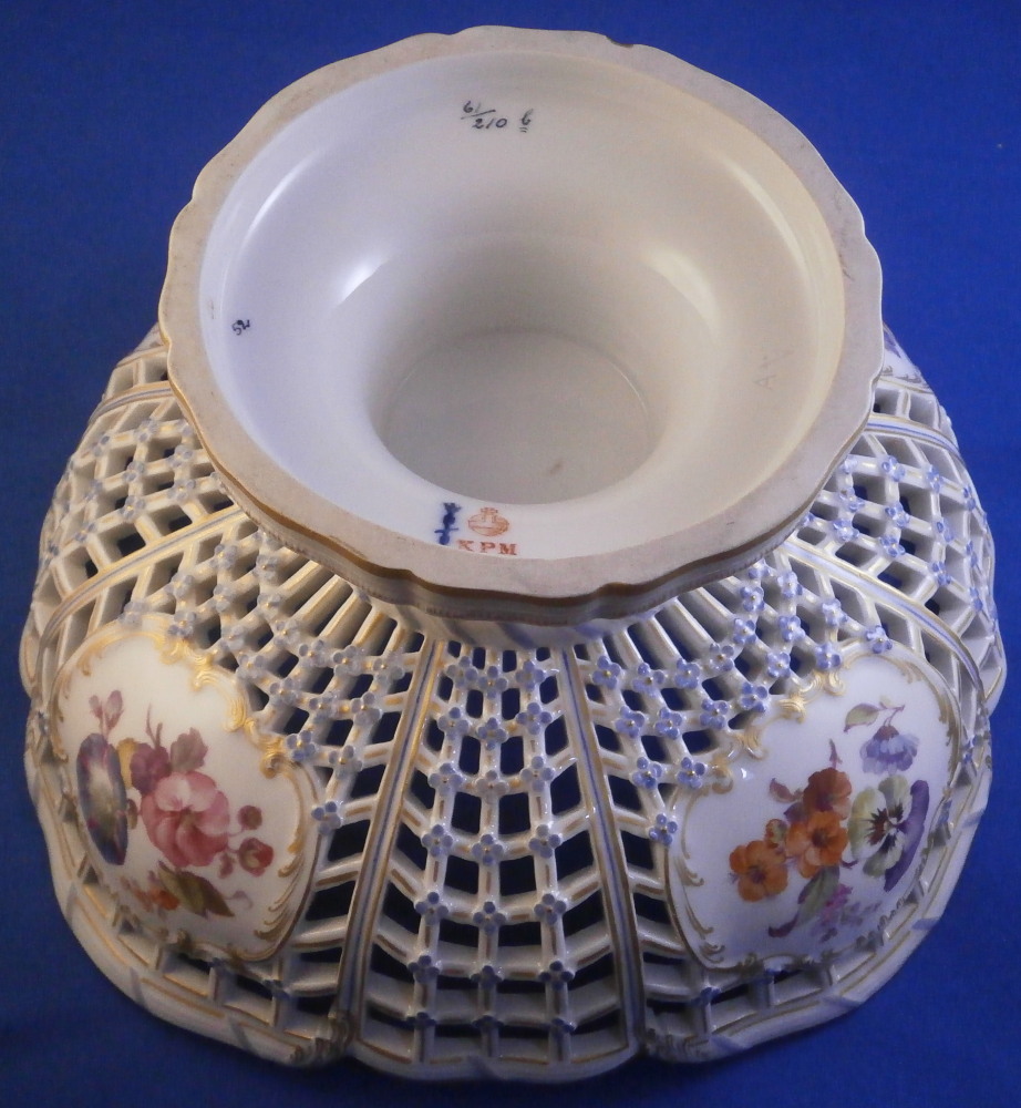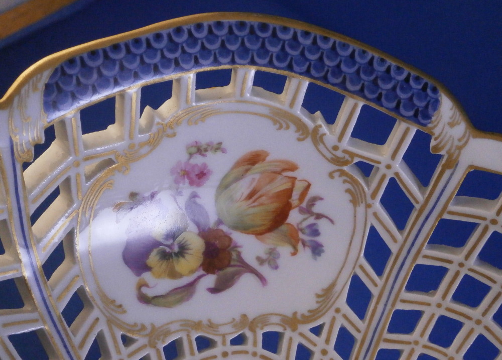 This is a stunning reticulated footed basket in the Breslauer Stadtschloss pattern made by KPM in the early 20th century. It's a hard to find shape and looks amazing! The flowers from this period use a bit darker colors and they are larger and more detailed than the newer pieces that one finds most of the time. The basket has five floral panels to the inside - one to the bottom and four along the rim. It has four more floral panels to the outside. It is heavily reticulated with gold and some blue highlights and the telltale blue scale design in areas of the rim above the floral panels. This is what gives it away as a Breslauer Stadtschloss piece. The outside has lots and lots of raised forgetmenots to the intersections of each cutout. The foot has some smaller flowers to it and more gold and blue trim. It's an amazing piece! It is one of the nicest patterns in my view and looks very stunning when on display. The plate is in perfect condition (one tiny spot of gold wear) and marked underneath with the under glaze blue scepter as well as the red orb and various painters marks and the usual impressed marks as shown. The piece is 4.375 inches tall, 8.5 by 8.25 inches at the top. Please email me for more information or other pictures.