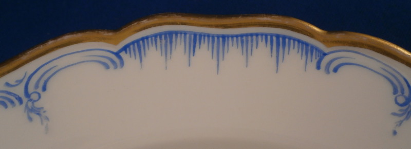 This is a great plate made by KPM in the early 20th century. It is hand painted with a scene in the center of a castle or some sort of royal residence surrounded by a nice landscape including some trees and a small lake with a path by it. I am not sure what the building is so if someone knows a quick email is always appreciated! The rim has a nice shape to it and has a gold line around it with some nice blue design as well parts of which are raised. The plate is 1.125 inches tall and 8.5 inches in diameter. It is in great condition with a little bit of wear but displays beautifully! The plate is marked underneath with the underglaze blue scepter mark, the red orb mark, the usual impressed letters and a painter's mark normal to this period. Please email me for more information or other pictures.