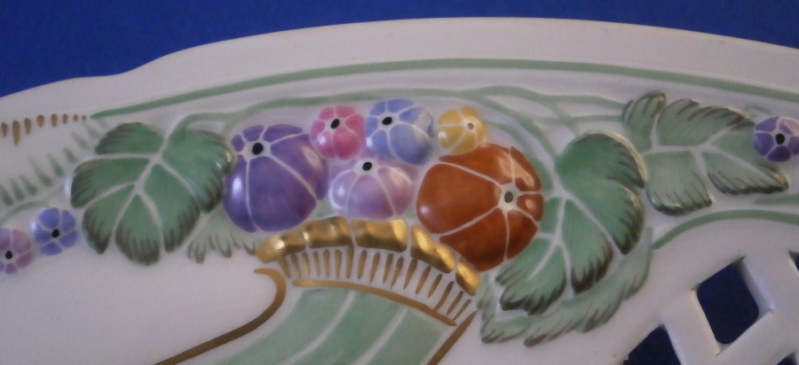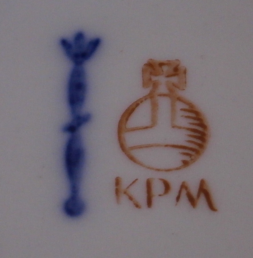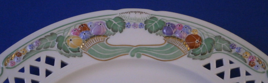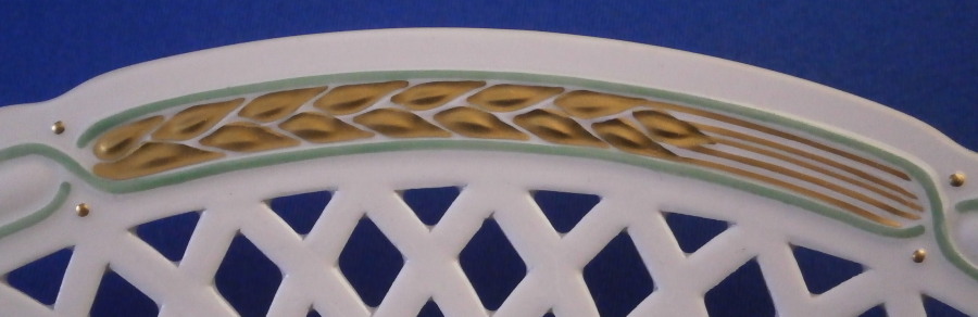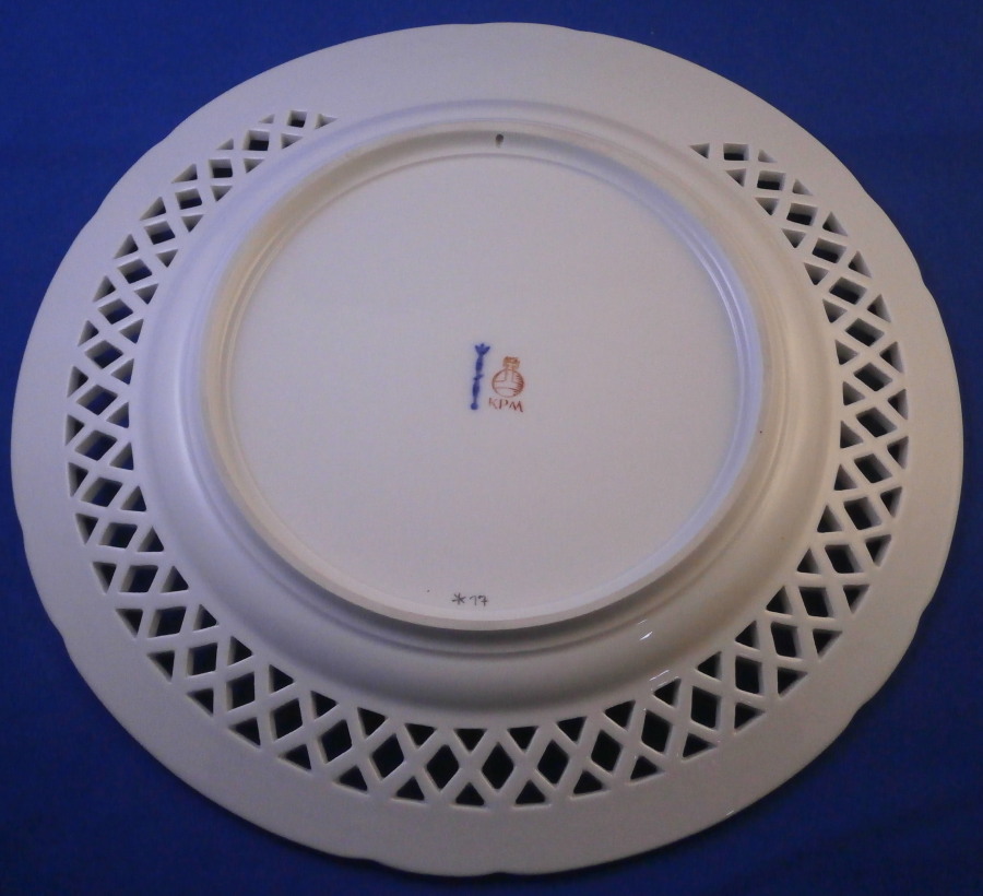 This is a superb reticulated plate made by KPM in the later 20th century. The plate is from the famous Ceres Service designed by Theodor Schmuz-Baudiss for the 150 year anniversary of the manufactory. It is the most famous of the Jugenstil services I believe and the name comes from the Roman goddess of fertility and agriculture. Hence the cornucopias, etc. This plate here is the reticulated version which is really nice and hard to find! The plate is in perfect condition which helps :) It is 1 inch tall and 8.75 inches in diameter. The set was first designed in 1912 for the anniversary of the manufactory. It is marked underneath with the under glaze blue scepter mark, the red orb and some blakc painter's marks as shown. Hole in the foot ring for hanging. A truly superb piece! Please email me for more information or other pictures.