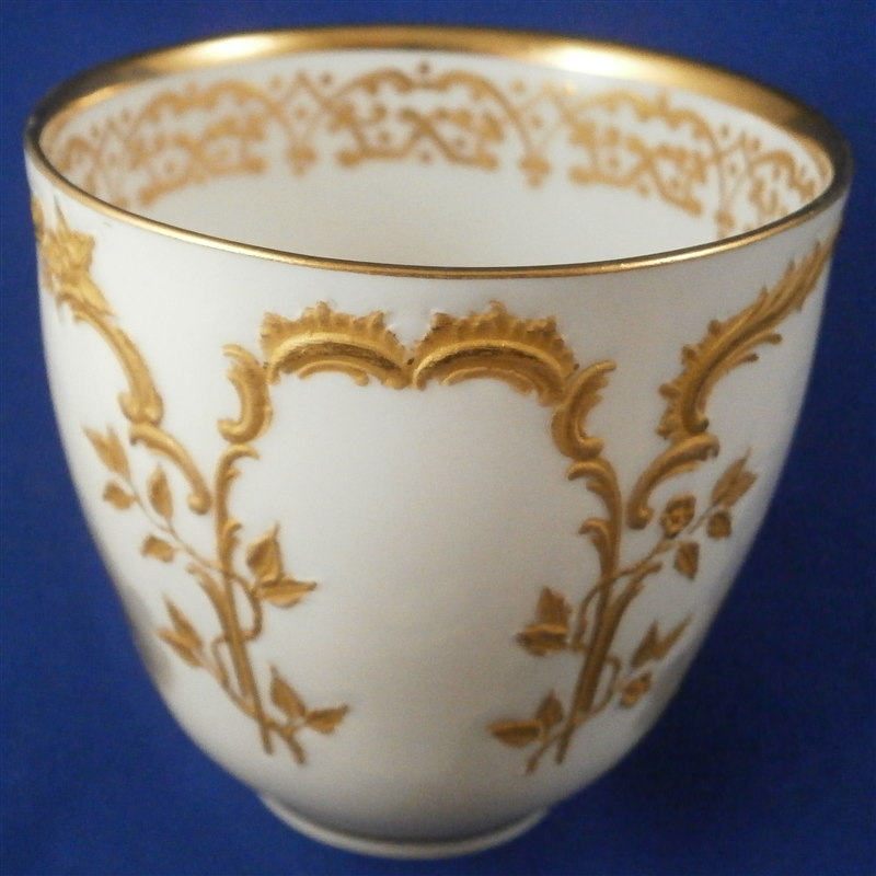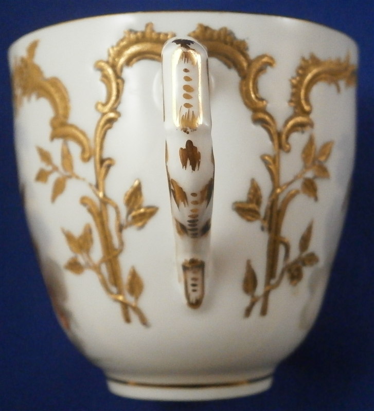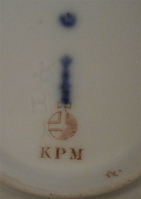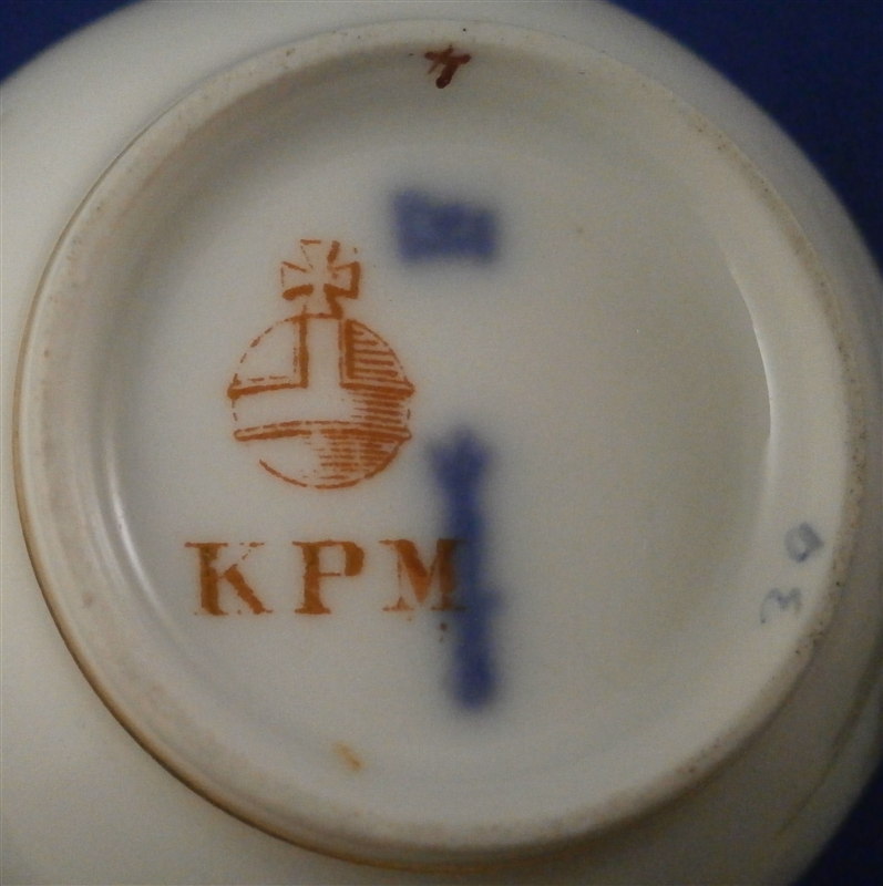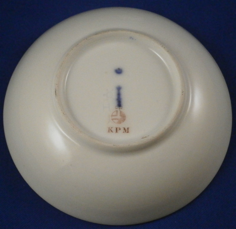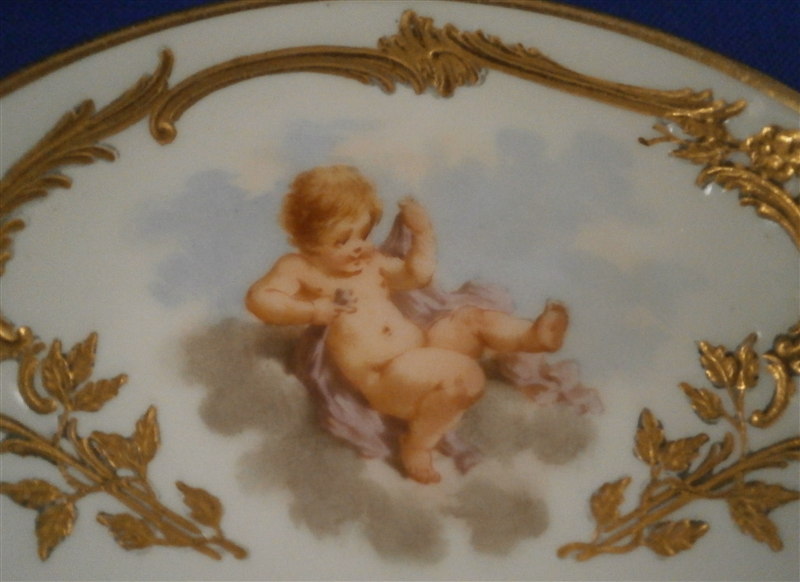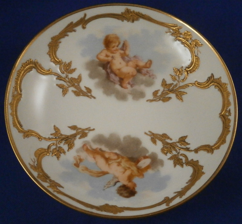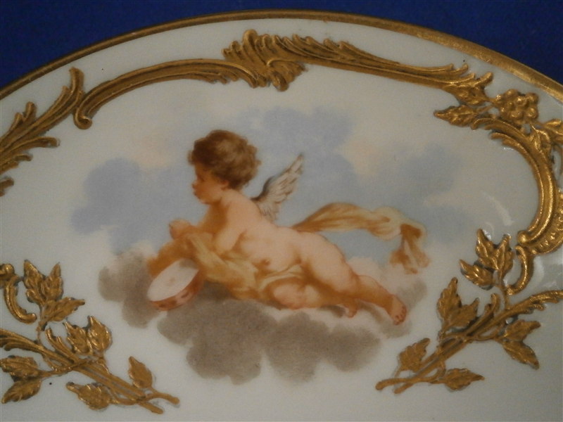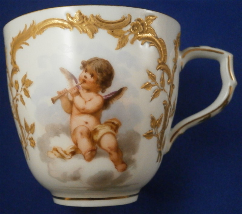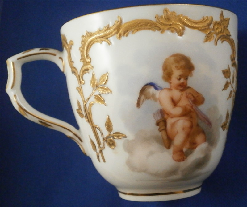 This is a superb cup and saucer made by KPM in the early 20th century. Both pieces are hand painted with two high quality angel / cupid scenes with the angels sitting on a cloud. Two are holding musical isntruments, one has a bow and arrows while the last one just seems to be relaxing. An amazing raised gold trim in between the scenes and along the rim as well as more gold trim to the inside rim of the cup and the nicely shaped handle. This style of design is called Neuzierat and it is quite popular even today and the angel scenes are the nicest design they made of this style I think. The set is marked underneath with the under glaze blue scepter mark as well as the red orb and the usual painter's and impressed marks of this period. The cup & saucer are in perfect condition. The saucer is 1 inch tall and 4.375 inches in diameter. The cup is 2.25 inches tall and has a diameter of 2.375 inches. Please email me for more information or other pictures.