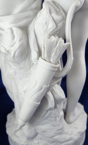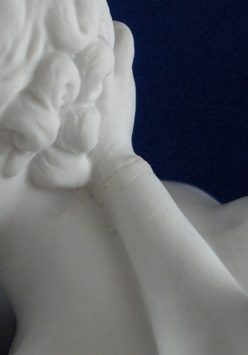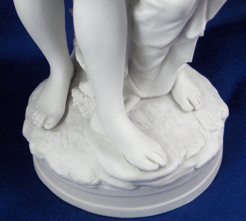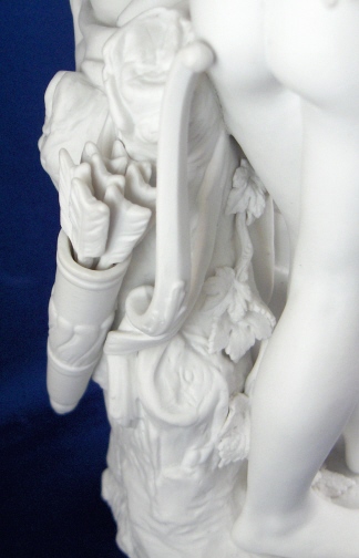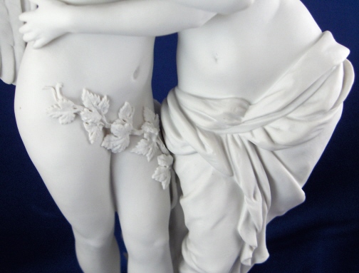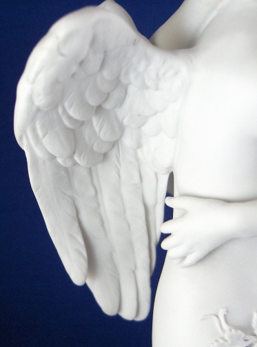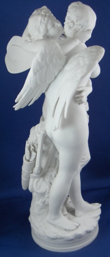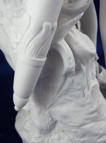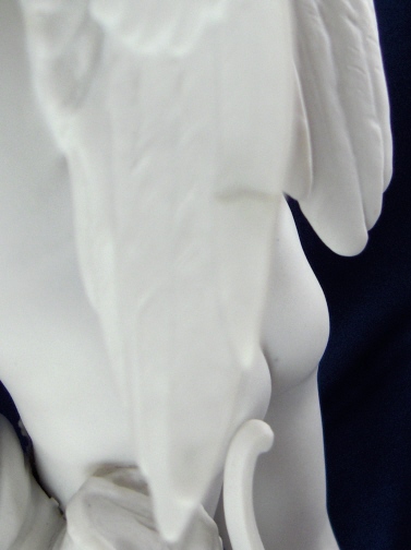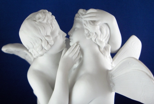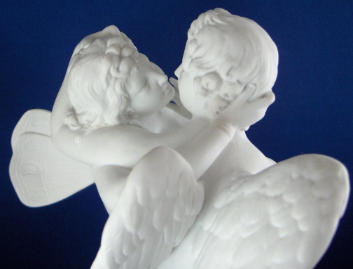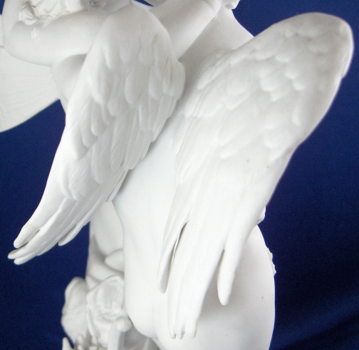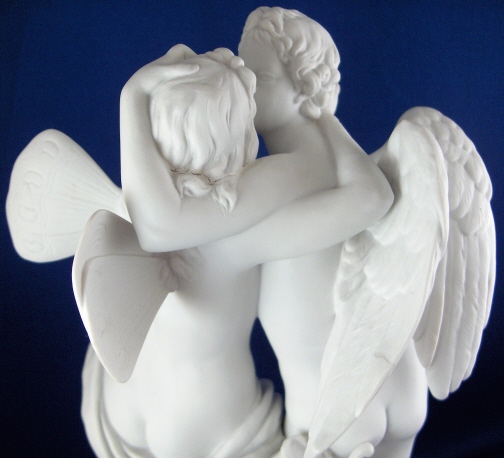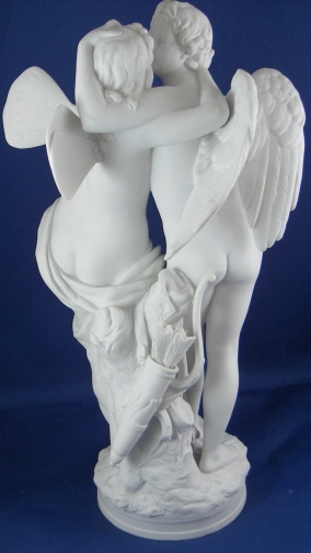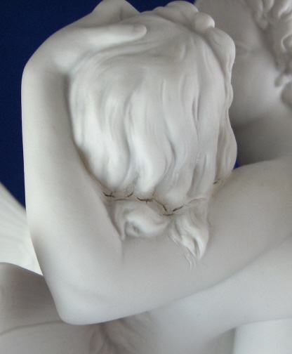 This is an amazing parian porcelain figurine made by KPM around 1911. I have not come across this model before and it is really very nice with tons of detail plus a great subject! Just google the tale of Cupid and Psyche (aka Amour and Psyche or Eros and Psyche) to get the whole scoop of this old myth. The figurine was left unglazed to show off all the tiny details normally hidden by the glaze! The piece is in great condition but there are some minor flaws which do not show on disply since they are in the back! The is a bit of a firing crack in the back of her neck and her hand on his neck which was filled in by KPM! The outside feather of his left wing was reglued very well or it is a hairline I cannot tell and the bottom of his bow is missing. None of tehse stand out and it is a superb piece of porcelain by a top maker! Nice size, too being 10.5 inches tall, 5.75 inches wide and 3.5 inches deep. The figure is marked underneath with the blue scepter mark with a cut next to it (they probably missed) because of the firing cracks. Also an impressed letter K as the date code. Please email me for more information or other pictures.