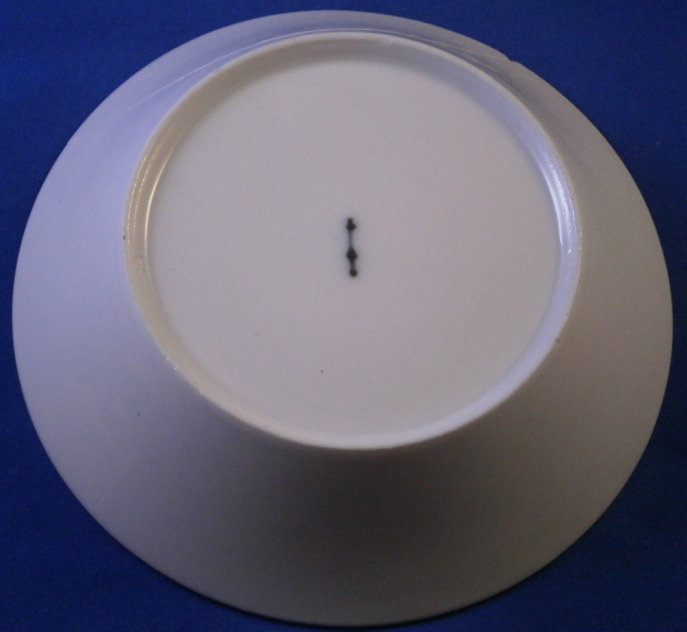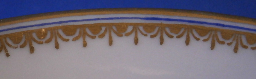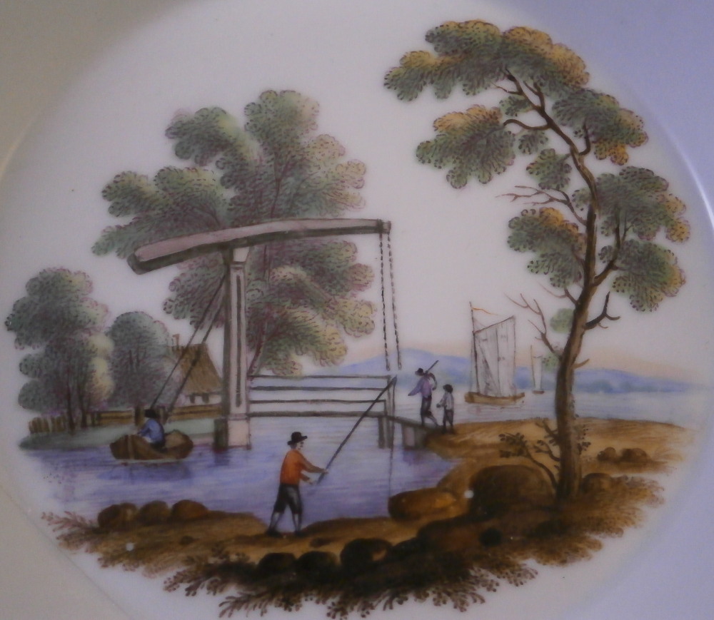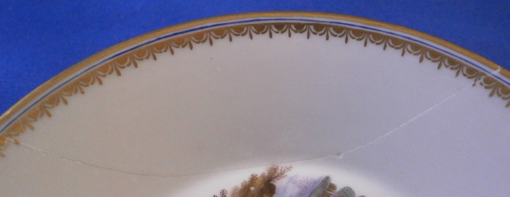 This is a saucer made by KPM in the late 18th century. KPM used no painters mark like the red orb yet during this period thus you only have the blue scepter and impressed marks most of the time. The piece is hand painted very nicely with a scene in polychrome including what looks to be an early version of a raising bridge operated by a little boat with two people ready to cross it and another on the shore fishing all in a landscape surrounding. Super gold and blue trim to the edge. The saucer is 1.125 inches tall and 5.125 inches in diameter. It is marked underneath with the under glaze blue scepter mark as well as some kind of impressed marks on the footring that looks like two lines which is a size indicator they used in the late 18th century. The saucer displays nicely but has a large chunk on the rim reglued as shown. Almost all there and a clean break except for a tiny piece at the outside edge. Would be an easy fix for a good restorer! I do have the matching cup but since the saucer was broken I am selling that separately. Please email me for more information or other pictures.
