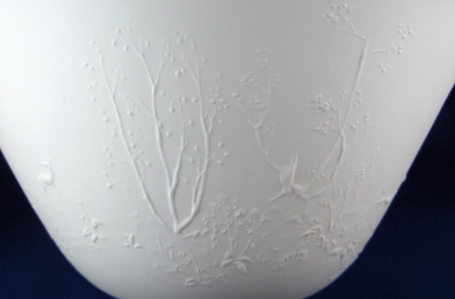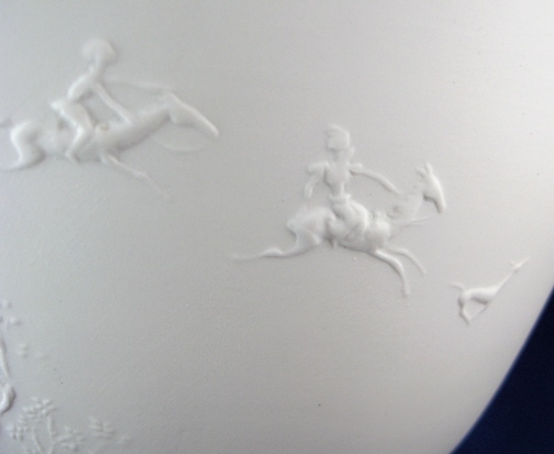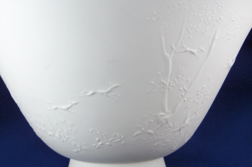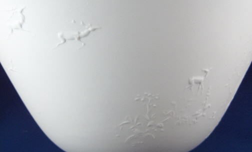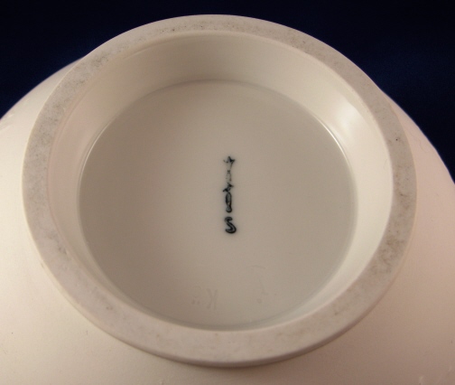 This is a bowl made by KPM in about 1945. It is called a Rohtrautschale and was created by Gerhard Gollwitzer in 1936. It is decorated in relief on the outside which is left unglazed and the inside is glazed so it can be used. The decoration is of deer and and people on stylized horses riding around the bowl. There is also some trees and flowers. It is a really neat design. The color is white in this case but I also have a celadon (slightly green color) up on the site. The bowl is 4.75 inches tall and 9.125 inches in diameter. It is in perfect condition and marked underneath with the blue scepter with the S for Selb as well as impressed marks K and c and some other marks. The scepter mark has a scratch in the glaze over it but not cut like seconds pieces usually are. Not sure if it just a scratch or really a second choice sign. Please email me for more information or other pictures.