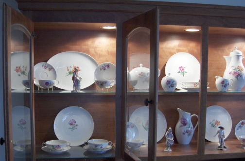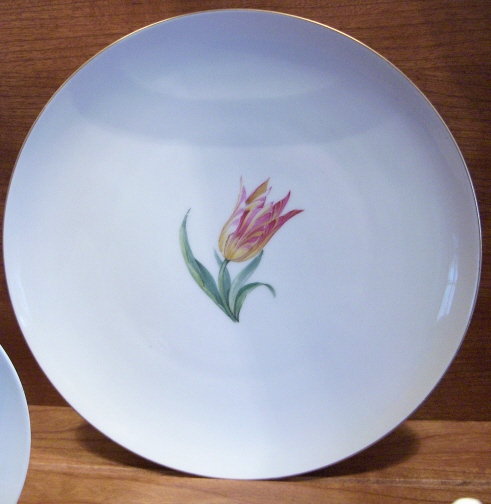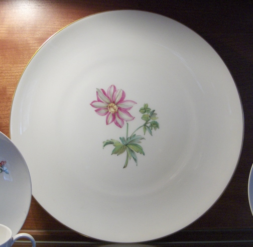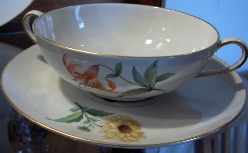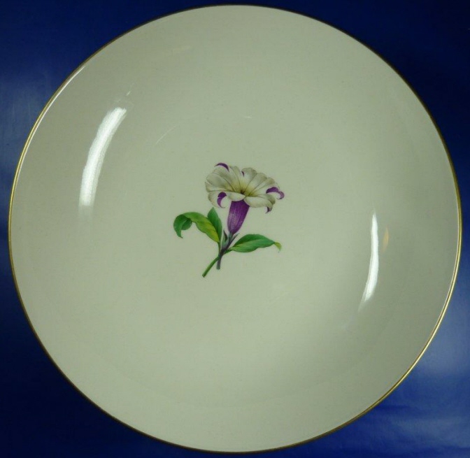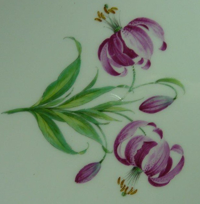 This is a dinner set in the Urbino design made by KPM in the 20th century just after WWII. It is handpainted with flowers and a nice gold trim. There are enough pieces for six people. 6 dinner plates, 6 soup bowls and saucers, 6 desert plates, 1 large round serving platter, one large oval serving platter, 4 serving bowls from small to large, one lidded tureen, one sauce dish, and six coasters. I think that is it. I have this set displayed in my formal dining room. If you are interested I can send detailed pics of the pieces. All in great condition, no chips, etc. Might have been used once or twice only. Marked underneath with the underglaze blue scepter, the red orb mark, incised marks and artist marks. Please email me for more information or other pictures.