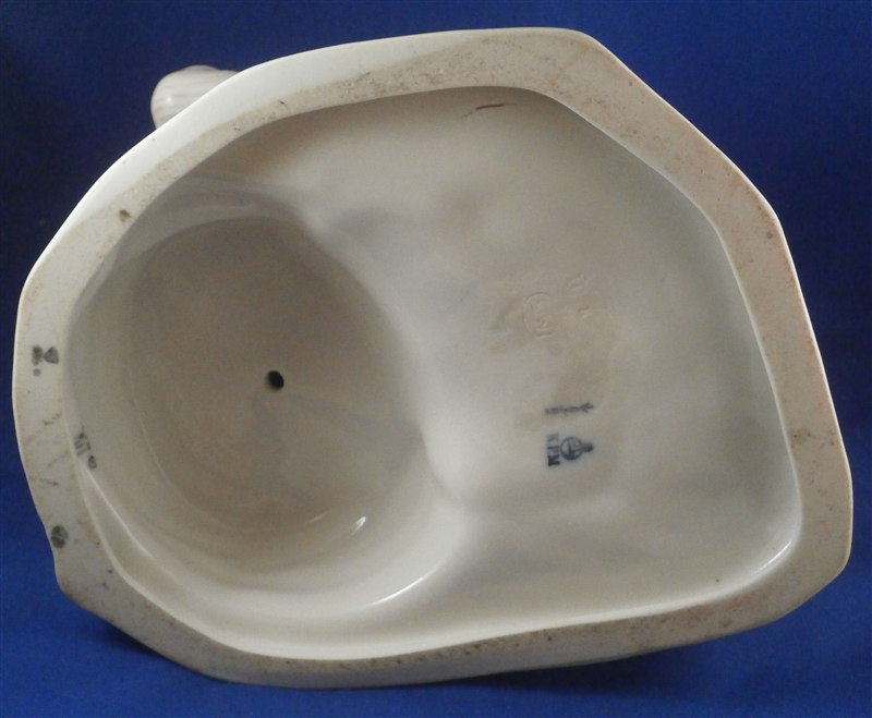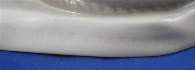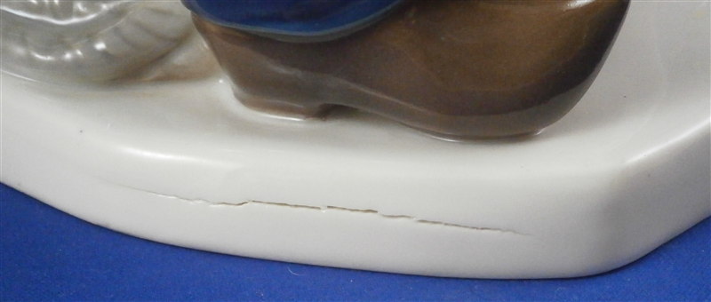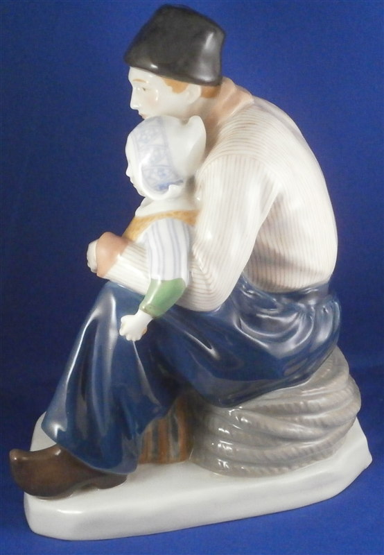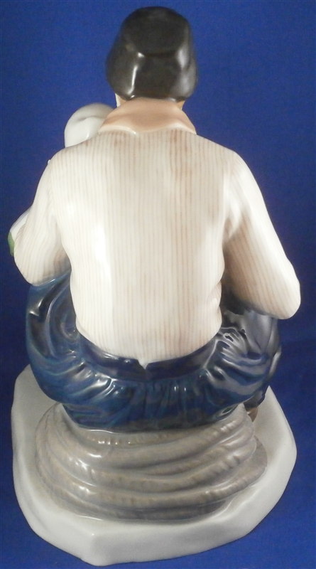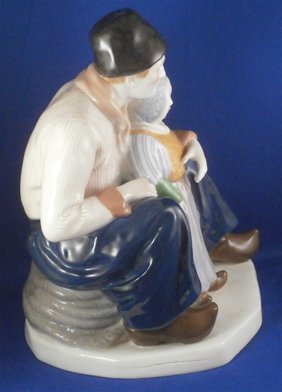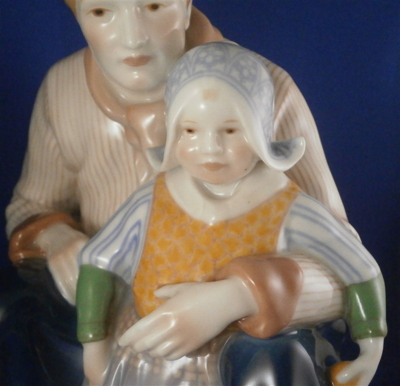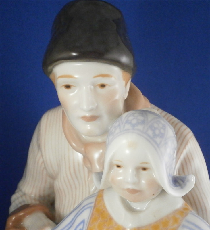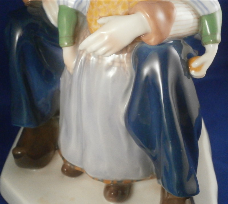 This is a superb large and rare figurine made by KPM in the early 20th century. It is of a dutch father and his daughter dressed in traditional clothing and handpainted to perfection! The piece is painted in the Art Nouveau or Jugendstil style of the period in underglaze colors that one rarely sees used. The piece was designed by Rudolf Marcuse who is very well know for his figurines though I know him more for his work at Rosenthal but apprently he also did work for KPM and a few other makers. This is a very alrge and unusual piece I have not seen before. The figure is in perfect condition with the exception of a firing crack on the left side of the base from the making which was so common on these large pieces that they did not even make it a second choice piece. The figure is about 10.5 inches tall, 6.625 inches wide and 8.25 inches deep. It is marked underneath with the underglaze blue scepter, the blue orb (used only on udnerlgaze colored pieces) as well as the usual impressed nubmers and amrks and some painter's marks as shown. First choice pieces of this size are amazing and highly unusual. Not a piece you will see again anytime soon if ever! The right side of the base has the artist name impressed in it. Please email me for more information or other pictures.