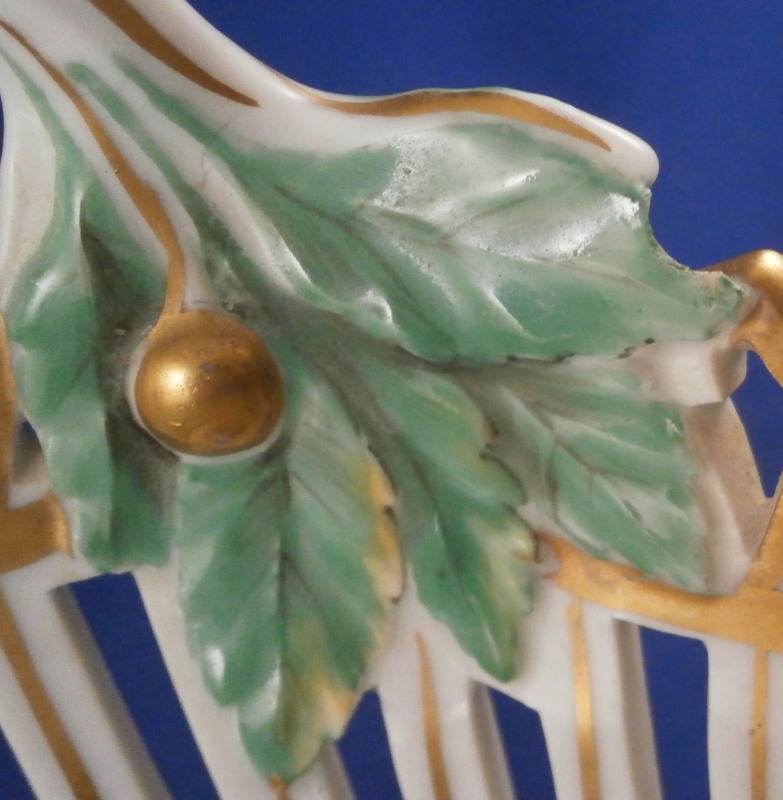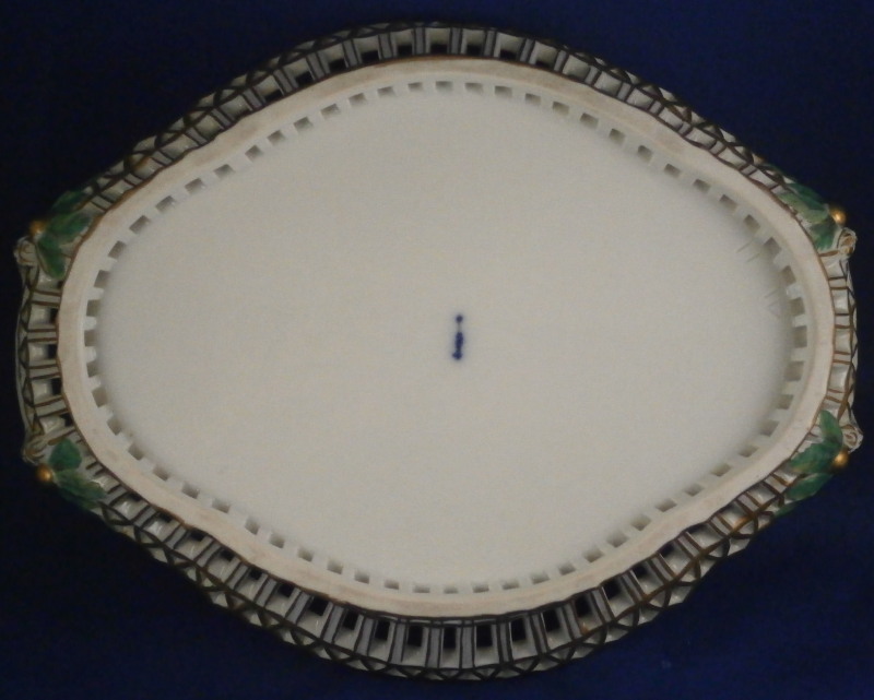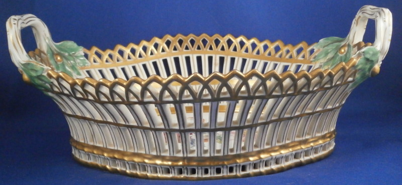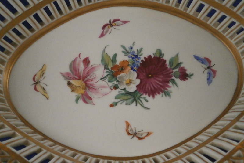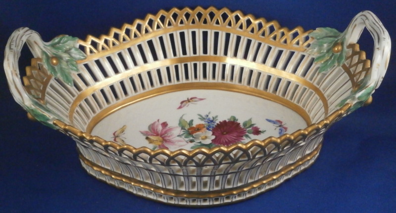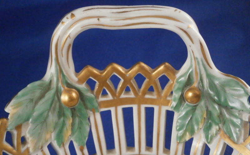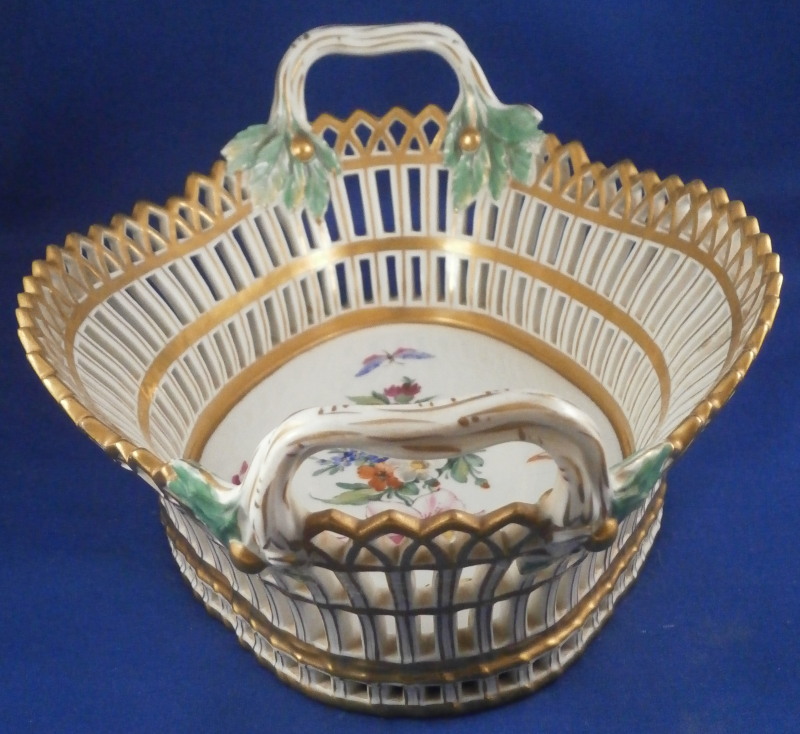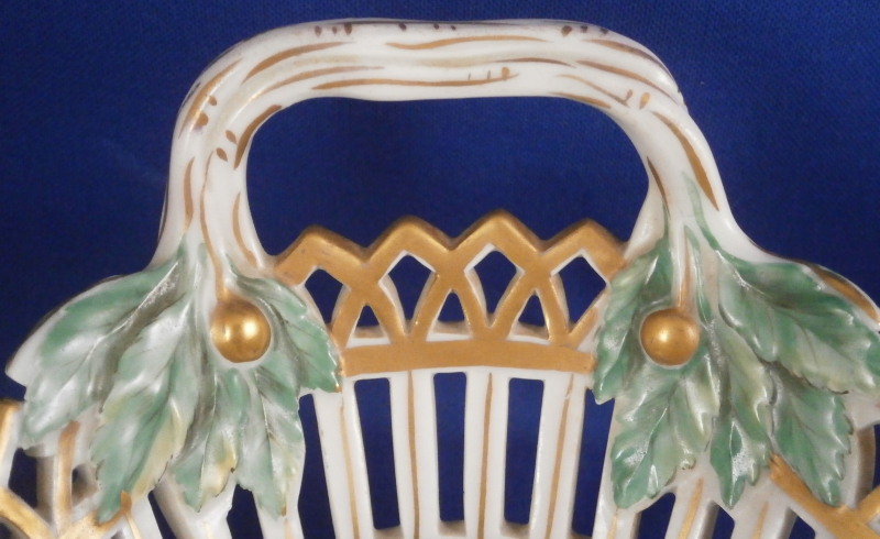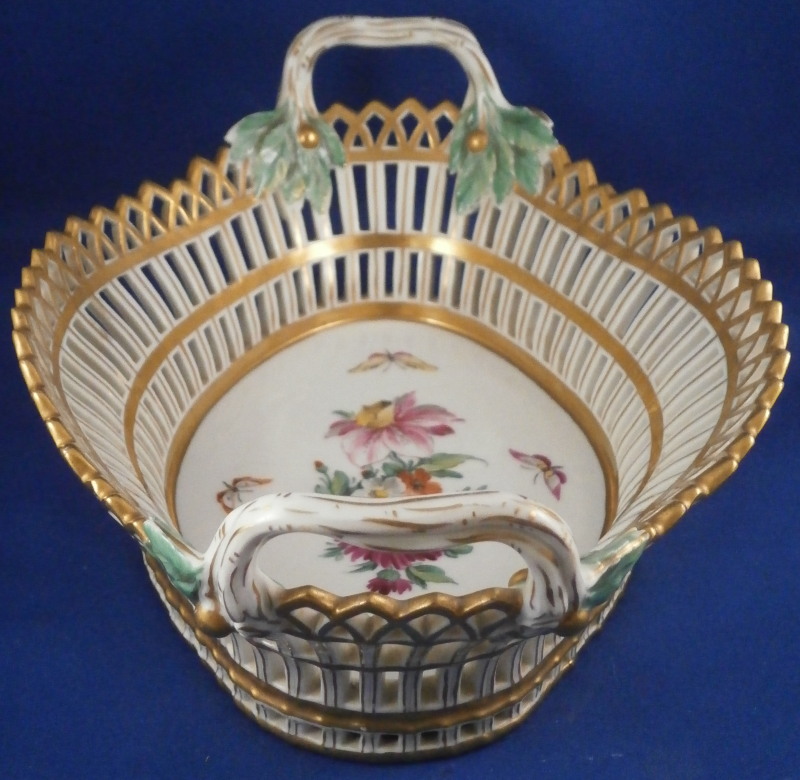 This is a nice reticulated basket made by KPM around 1800. It is not easy to find an early version of these in good condition these days. This one is nicely hand painted with a decent quality floral design with four butterflies in the bottom inside, nice reticulated sides highlighted in gilding and some nice leaf shaped terminals to the handles. Really a very nice piece! The basket is in great condition with some very minimal wear to the gilding (in superb shape for being 200 years old!) and a small chip to one leaf of the terminals as shown but it is not obvious at all and took me a while to find. The piece is 3.75 inches tall (including the handles), 9.625 inches wide and 7.25 inches deep. It is marked underneath with an early under glaze blue scepter mark as well as an incised double line which is a size reference and a line with a triangle - not sure what exactly that stands for. Please email me for more information or other pictures.