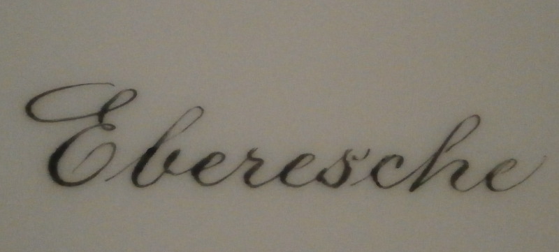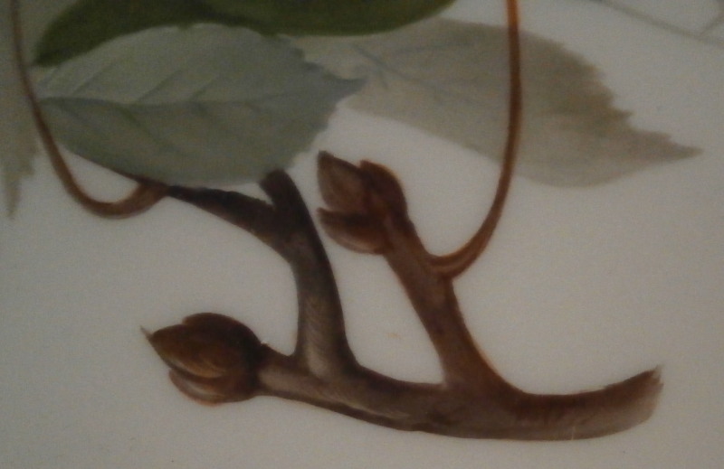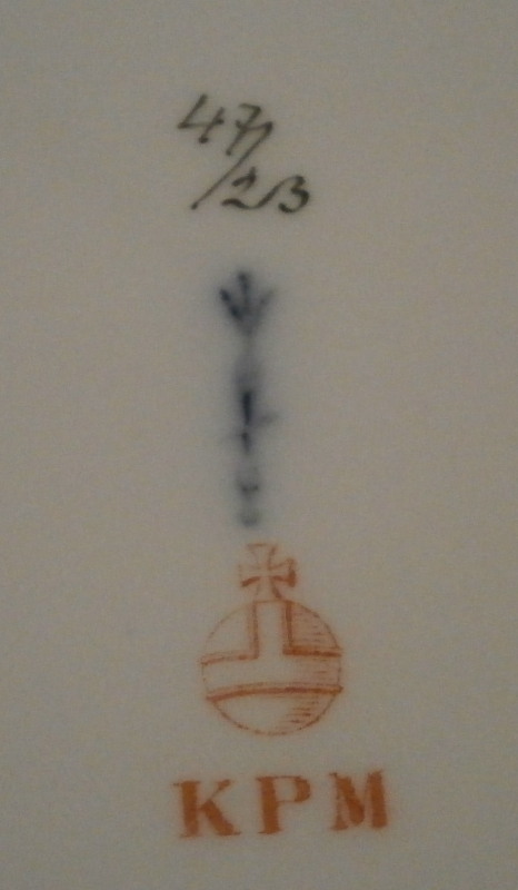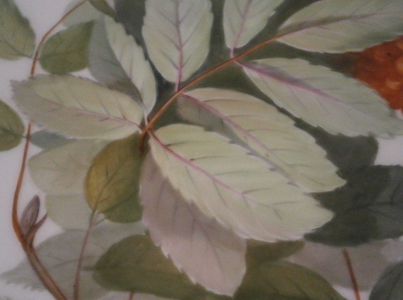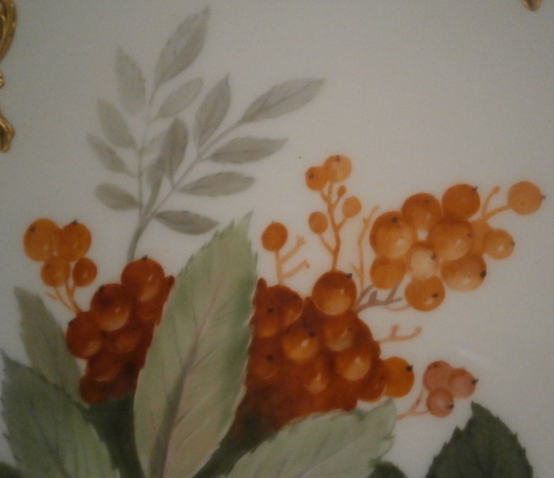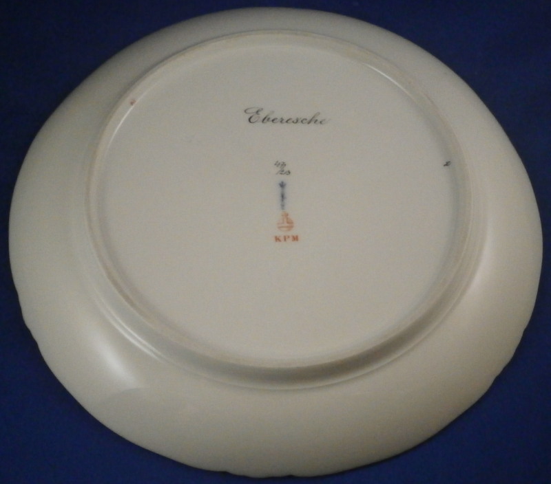 This is a plate made by KPM in the early 20th century. It is hand painted with the rarest design on these plates of this style - the tree branch / leaf motif. This one is of a branch of a Mountain Ash tree including its leaves on a branch but also the nice red berries which makes this one really superb plate! Kind of the German version of the Flora Danica :) Just an amazingly detailed painting and with the rim painted with gold on a raised design it is just spectacular. The plate is in perfect condition. It is 8.5 inches in diameter so a nice size and 1 inch tall. The plate is marked underneath with the under glaze blue scepter, the red orb mark, some black numbers, a painter's and a gilder's mark, the usual impressed marks of this period as well as the name of the tree - Eberesche in black script. Please email me for more information or other pictures.