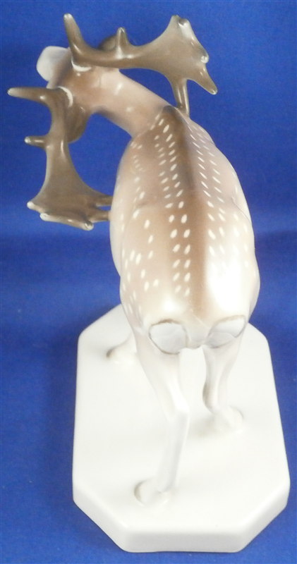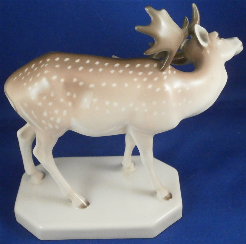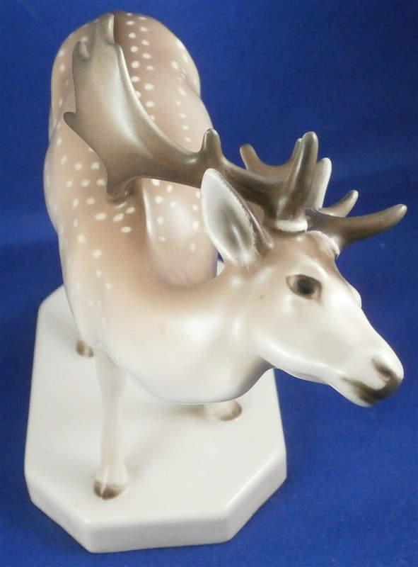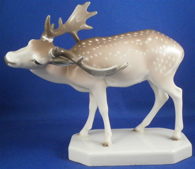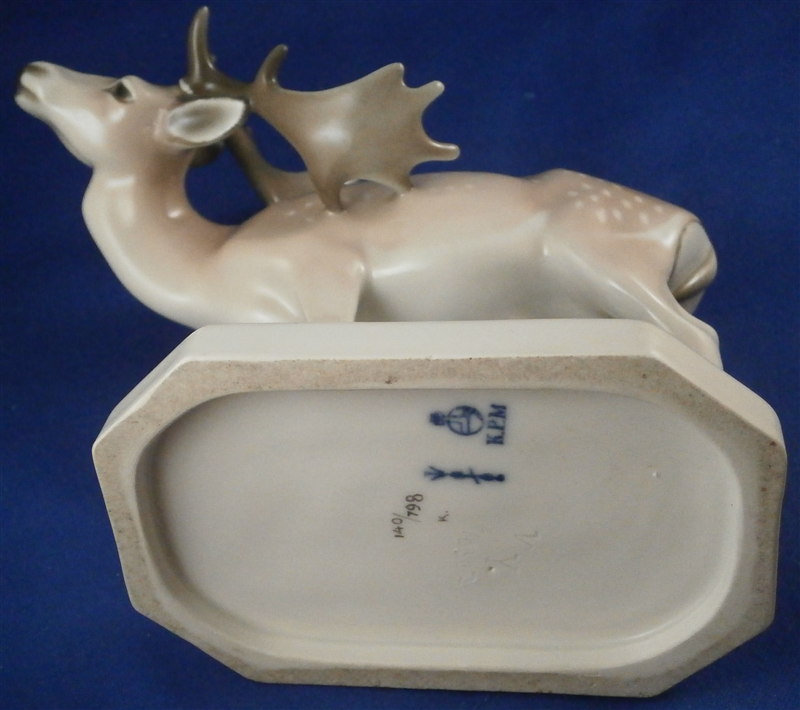 This is a superb figurine of a fallow deer stag (aka Dammhirsch in German) made by KPM in the early 20th century during the Art Nouveau period when they were first designed. This rare figurine is very decorative and the udnerglaze colors are pretty much unique to this period for KPM so not common at all. The piece is superbly modeled and painted. The piece is in perfect condition. It is 5.5 inches tall, 3 inches wide and 6 inches long. The figure is marked underneath with the underglaze blue scepter and orb as well as 140/798 and K. in black and the usual impressed marks as shown. Please email me for more information or other pictures.