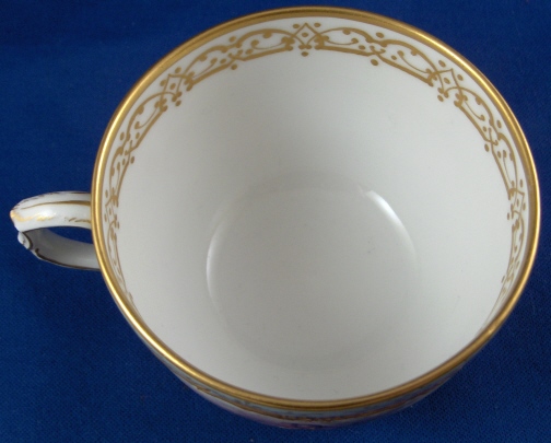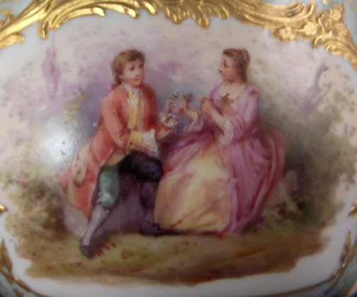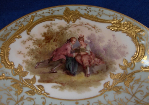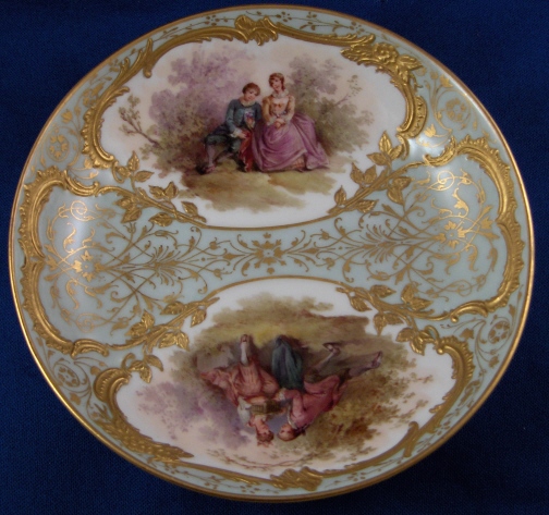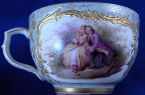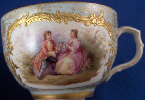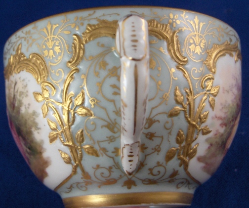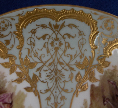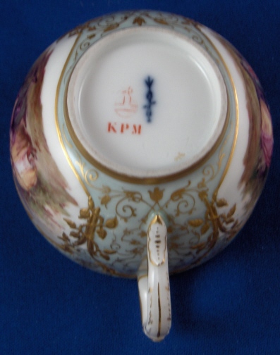 This is the fanciest design of this style cup made by KPM in the early 20th century. Both pieces are handpainted with two high quality large scenes of couples in a landscape surrounding and an amazing raised gold trim with the open areas having a greenish ground color with lots of amazingly detailed gold designs to it. The cup handle has a nice shape also highlighted with gilding and the inside of the cup has a gold trim as well. About as superb a cup as you can find from KPM of this period! The set is in perfect condition which always helps :) The cup is 2.125 inches tall and 3.25 inches in diameter. The saucer is 1.25 inches tall and has a diameter of 5.375 inches. Both are marked underneath with the underglaze blue scepter, the red orb mark as well as some painter' s / gilder's marks and the usual impressed marks pieces of this period have. Please email me for more information or other pictures.