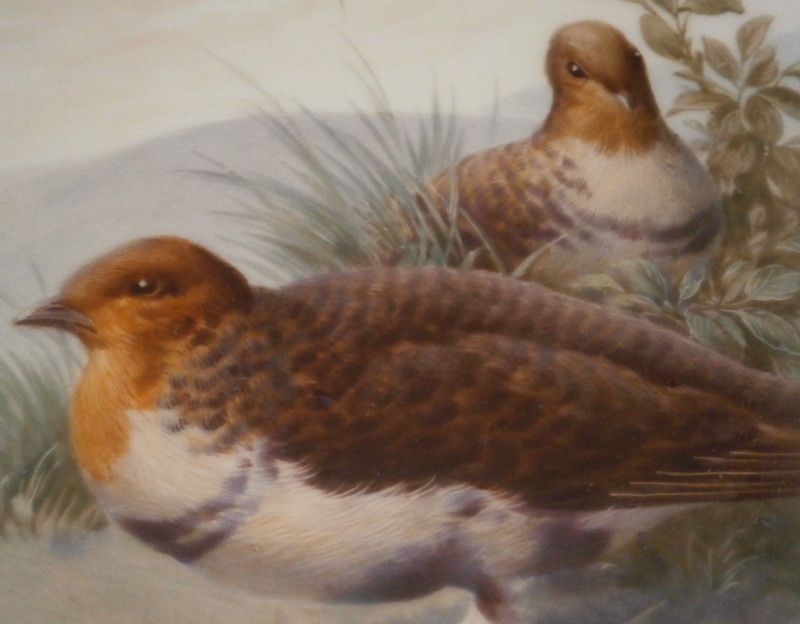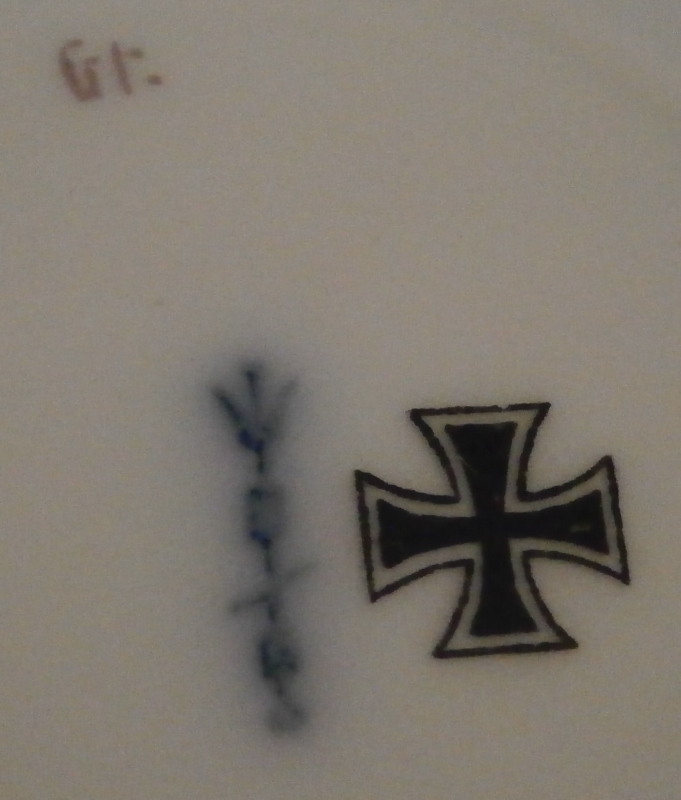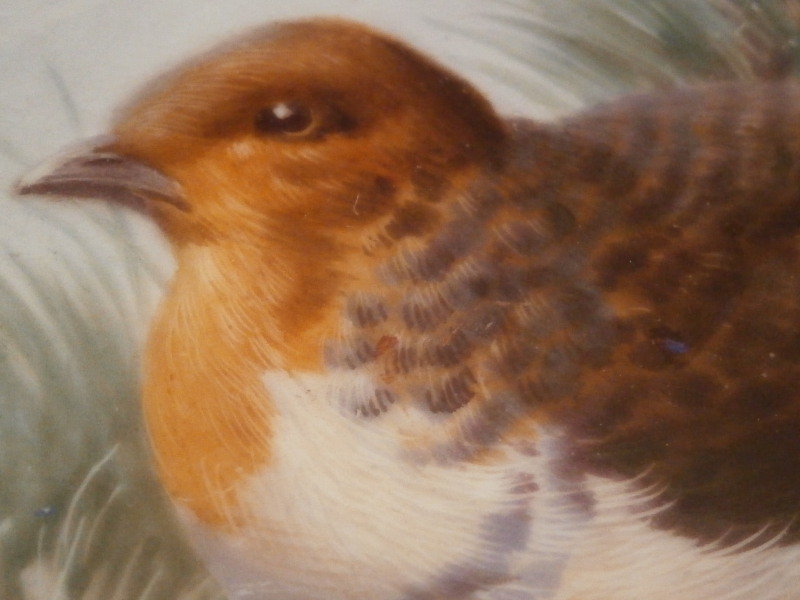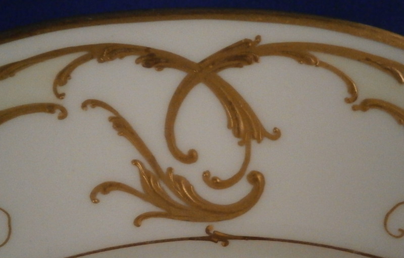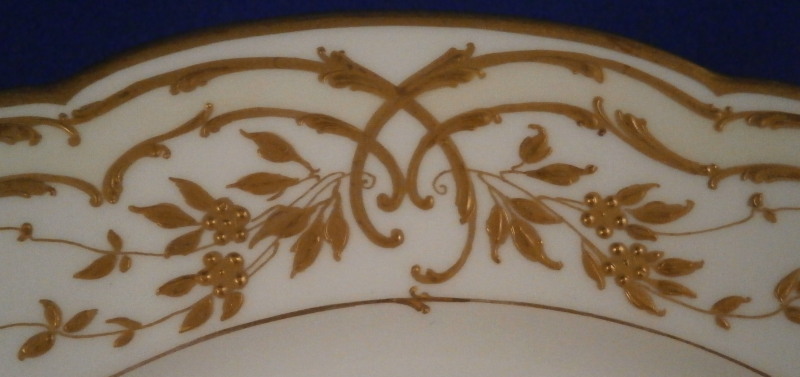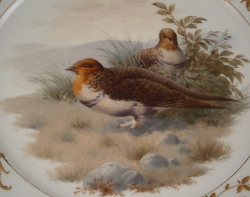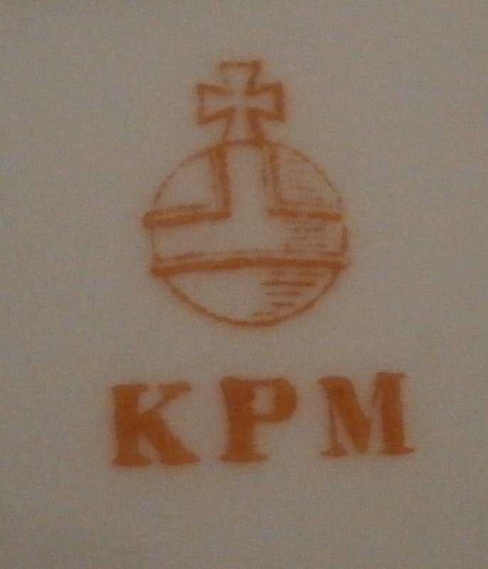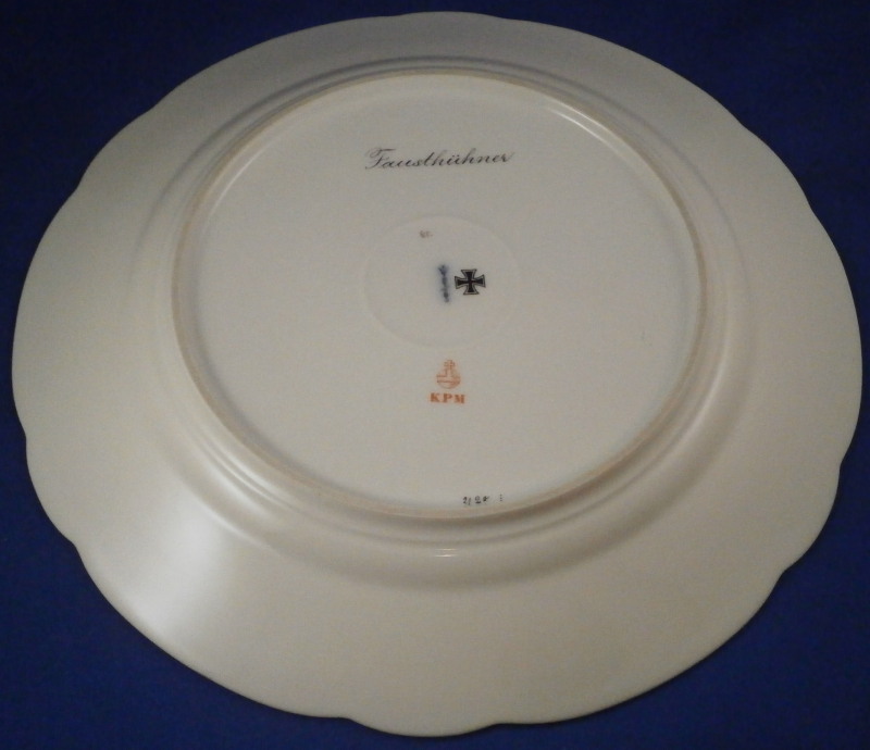 This is a superb Art Nouveau / Jugendstil period plate made by KPM in the early 20th century. The plate is hand painted with a superb scene in the center of a pair of birds sitting in a nice landscape. I think they are some sort of sand grouse but not sure. The rim is decorated with raised gold scrolls and leaf / floral decorations and a slightly greenish / yellowish ground color between the scrolls which is hard to see in the pictures. A truly superb plate and it is in superb condition with some very minor use wear. The piece is 1.125 inches tall and 9.75 inches in diameter. It is marked underneath with the under glaze blue scepter as well as the red orb mark, the iron cross as well as a painter's mark and the usual impressed marks, etc. of the period. The title Fausthuehner in black on the underside. Please email me for more information or other pictures.
