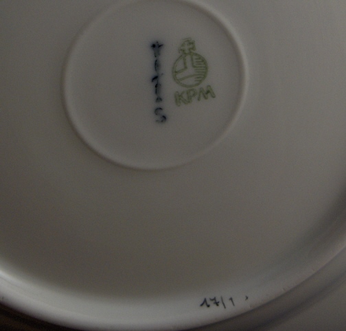 This is a large tea, coffee and dinner set made by KPM in the 20th century right after WWII. It is called the Feldblumen (field flowers) design and is not a very common one but one of the best ones you can actually use and put in the dishwasher as any painted design would not hold up in a dishwasher. Nice relief design of flowers as can be seen in the pictures and a nice gold trim. There are many different pieces from small plates to dinner plates, soup plates, serving dishes like a tureen with lid a bowl, a large round cake plate, a rectangular one, sauce dish, etc. Anything your heart desires especially now that I added some more pieces like an extra serving platter, a coffee pot, a lidded tureen, etc. If you are interested I can send detailed pictures and sizes of the pieces. All in great condition with the exception of two dinner plates having a small chip. Marked underneath with the underglaze blue scepter, the green orb mark for the gilding, incised marks and black artist marks. Please email me for more information or other pictures.