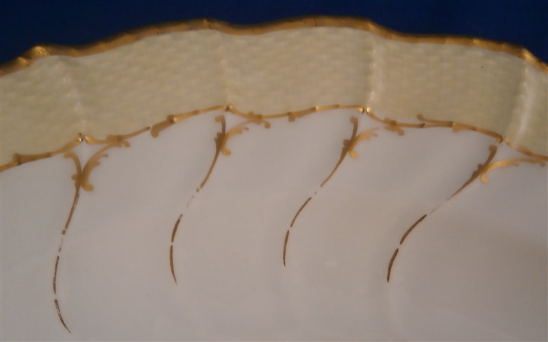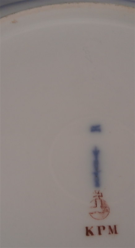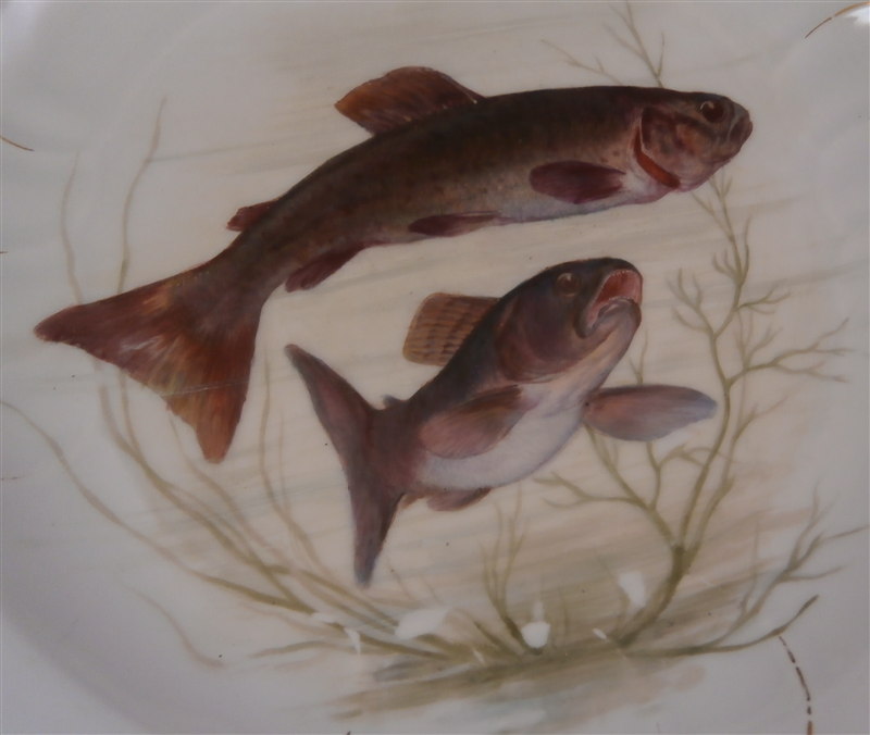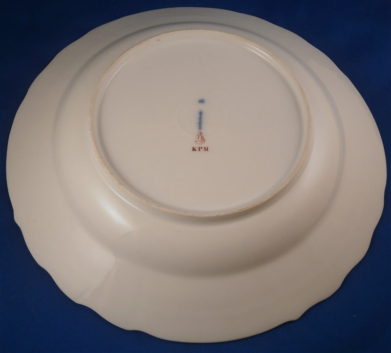 This is an amazing plate made by KPM in the early 20th century. I have always wanted one of these and got lucky and got a whole set recently. The plate is handpainted with a fish scene that covers the entire center including two large fish with some seaweed. The rim has a nice raised design to it with the edge basketweave design painted in a yellow ground color with a gold trim to the edge and a really nice gold trim going into the plate. Has that Art Nouveau / Jugendstil feeling to it and is just an amazing plate! The piece is in good condition with four spots of wear to the bottom seaweeds which I covered up a bit so it displays very well! The plate is 1.5 inches tall and 9.625 inches in diameter. It is marked underneath with the underglaze blue scepter as well as the red orb mark and the usual impressed and painter's / gilder's marks. Please email me for more information or other pictures.