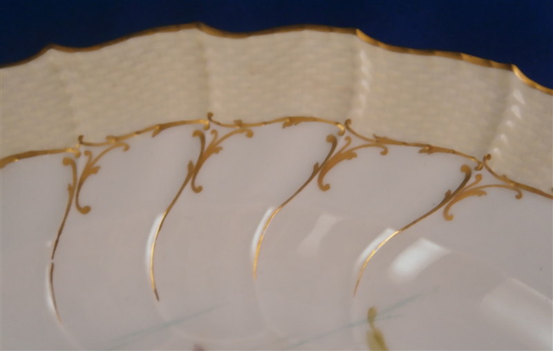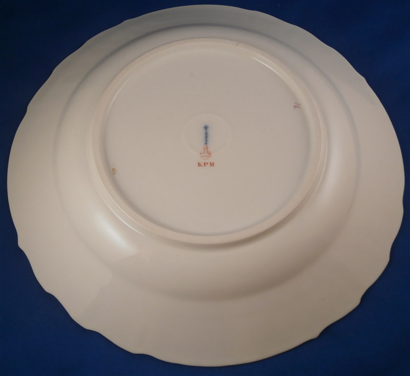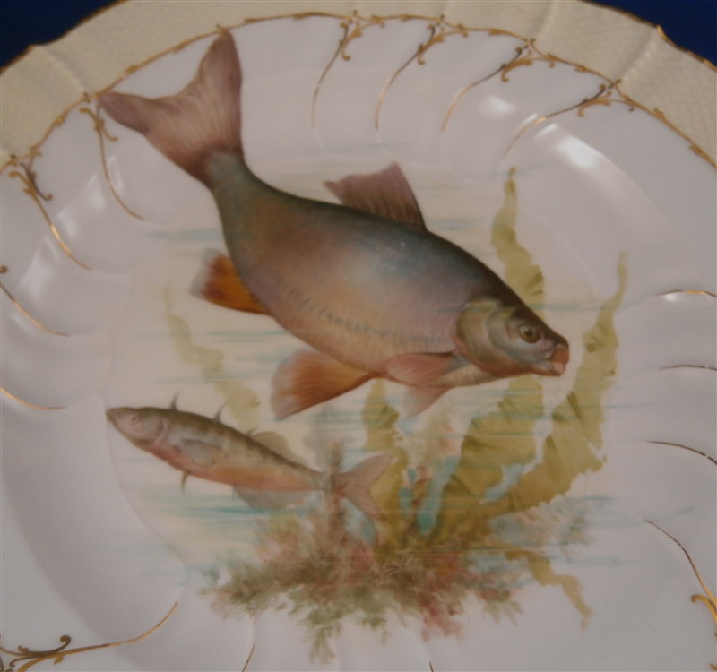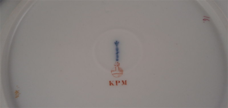 This is an amazing plate made by KPM in the early 20th century. I have always wanted one of these and got lucky and got a whole set recently. The plate is handpainted with a fish design that covers the entire center including one large fish, a small fish and different kinds of seaweed. The rim has a nice raised design to it with the edge basketweave design painted in a yellow ground color with a gold trim to the edge and a really nice gold trim going into the plate. Has that Art Nouveau / Jugendstil feeling to it and is just an amazing plate! The piece is in perfect condition. The plate is 1.5 inches tall and 9.75 inches in diameter. It is marked underneath with the underglaze blue scepter as well as the red orb mark and the usual impressed and painter's / gilder's marks. Please email me for more information or other pictures.