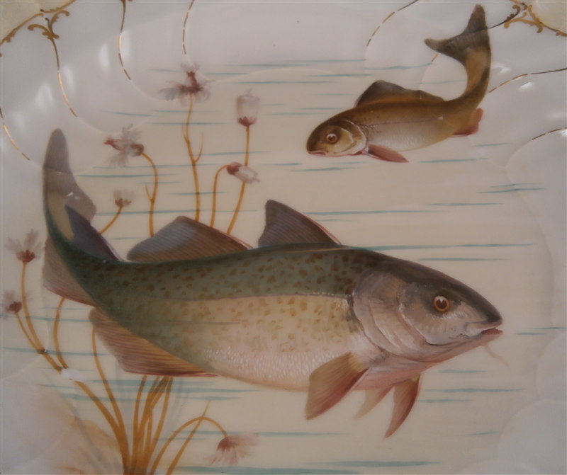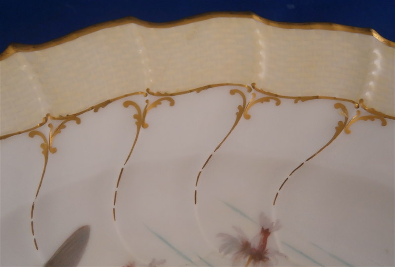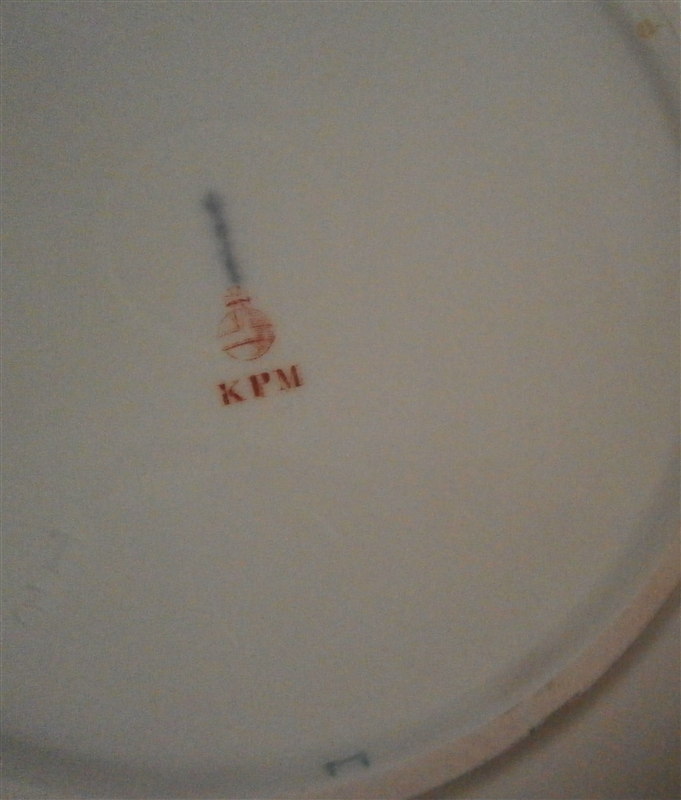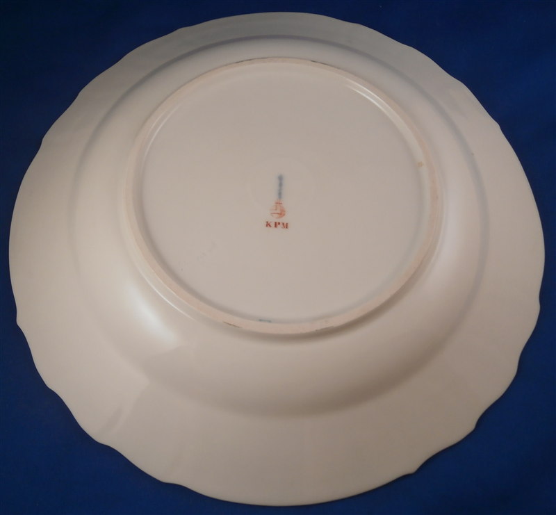 This is an amazing plate made by KPM in the early 20th century. I have always wanted one of these and got lucky and got a whole set recently. The plate is handpainted with a fish design that covers the entire center including one large fish, a smaller fish and some sort of udnerwater flower. The rim has a nice raised design to it with the edge basketweave design painted in a yellow ground color with a gold trim to the edge and a really nice gold trim going into the plate. Has that Art Nouveau / Jugendstil feeling to it and is just an amazing plate! The piece is in perfect condition with one tiny spot on a fin and a spot on the stalk of the flower that had stacking wear which I covered up so it displays perfectly. The plate is 1.5 inches tall and 9.75 inches in diameter. It is marked underneath with the underglaze blue scepter as well as the red orb mark and the usual impressed and painter's / gilder's marks. Please email me for more information or other pictures.