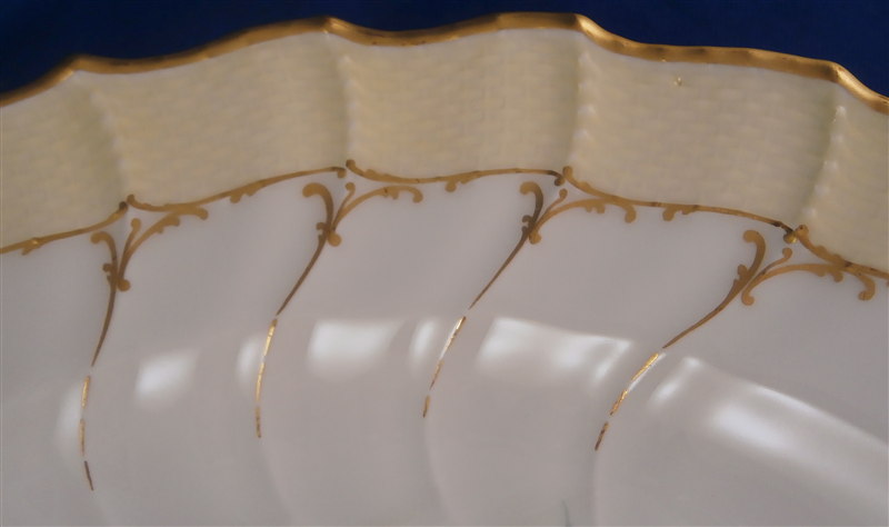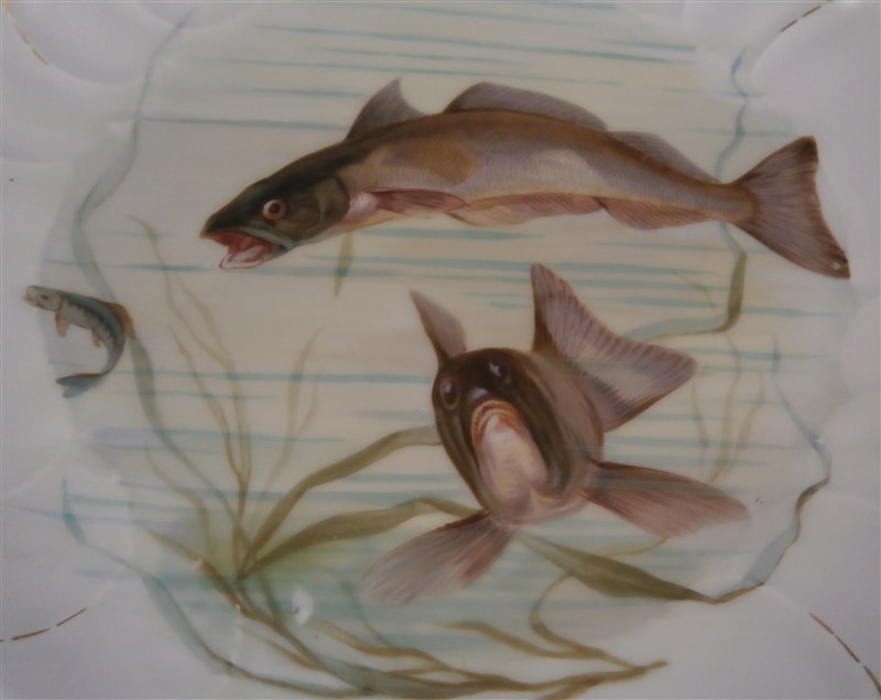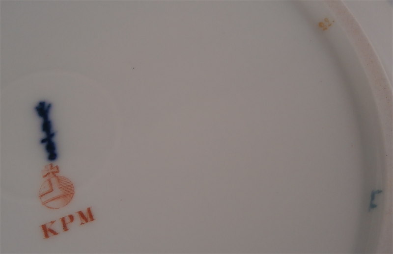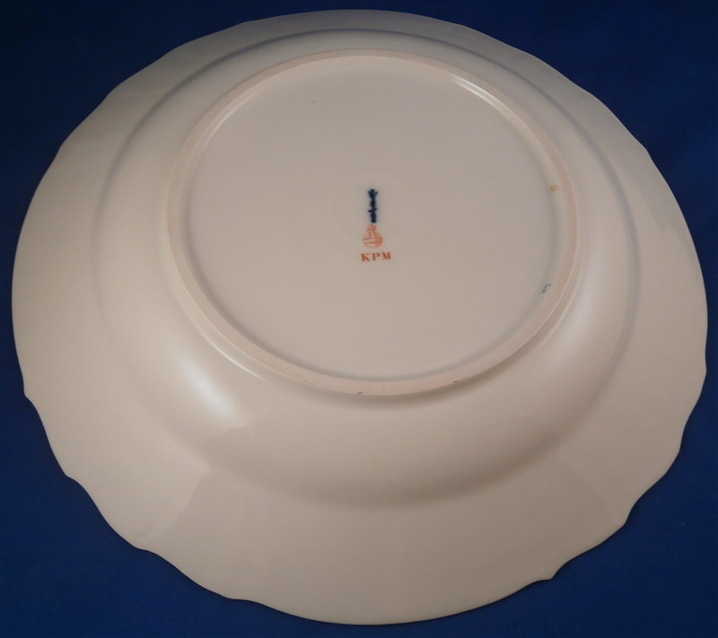 This is an amazing plate made by KPM in the early 20th century. I have always wanted one of these and got lucky and got a whole set recently. The plate is handpainted with a fish design that covers the entire center including two large fish, a small fish and some seaweed. The rim has a nice raised design to it with the edge basketweave design painted in a yellow ground color with a gold trim to the edge and a really nice gold trim going into the plate. Has that Art Nouveau / Jugendstil feeling to it and is just an amazing plate! The piece is in perfect condition with two spots of wear from where the plates where stacked but it displays perfectly. The plate is 1.5 inches tall and 9.75 inches in diameter. It is marked underneath with the underglaze blue scepter as well as the red orb mark and the usual impressed and painter's / gilder's marks. Please email me for more information or other pictures.