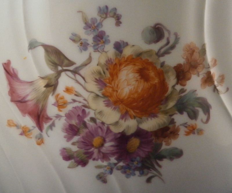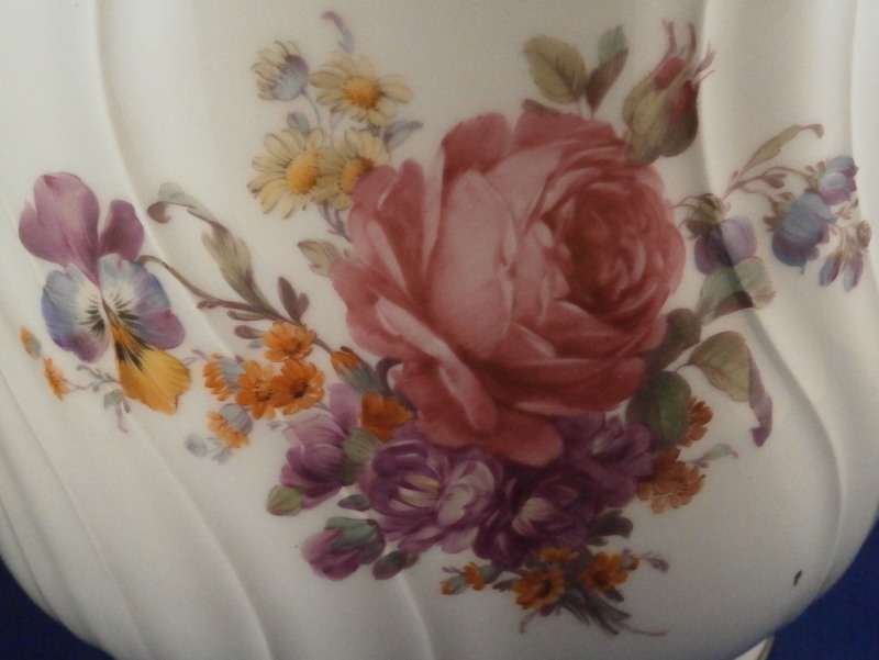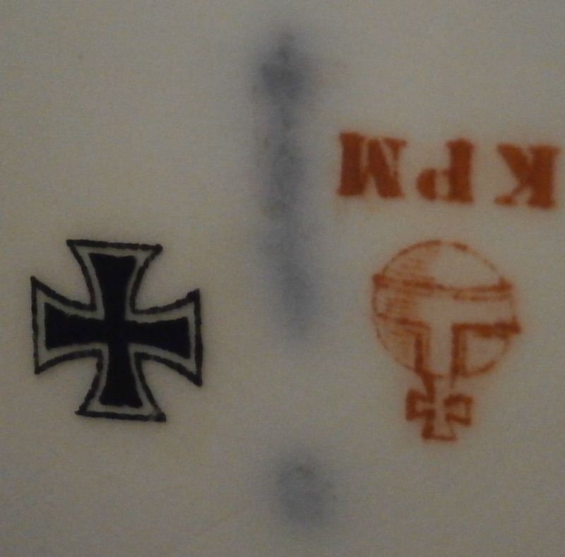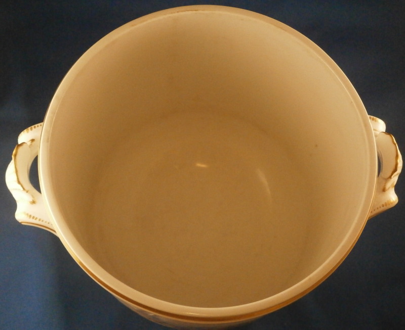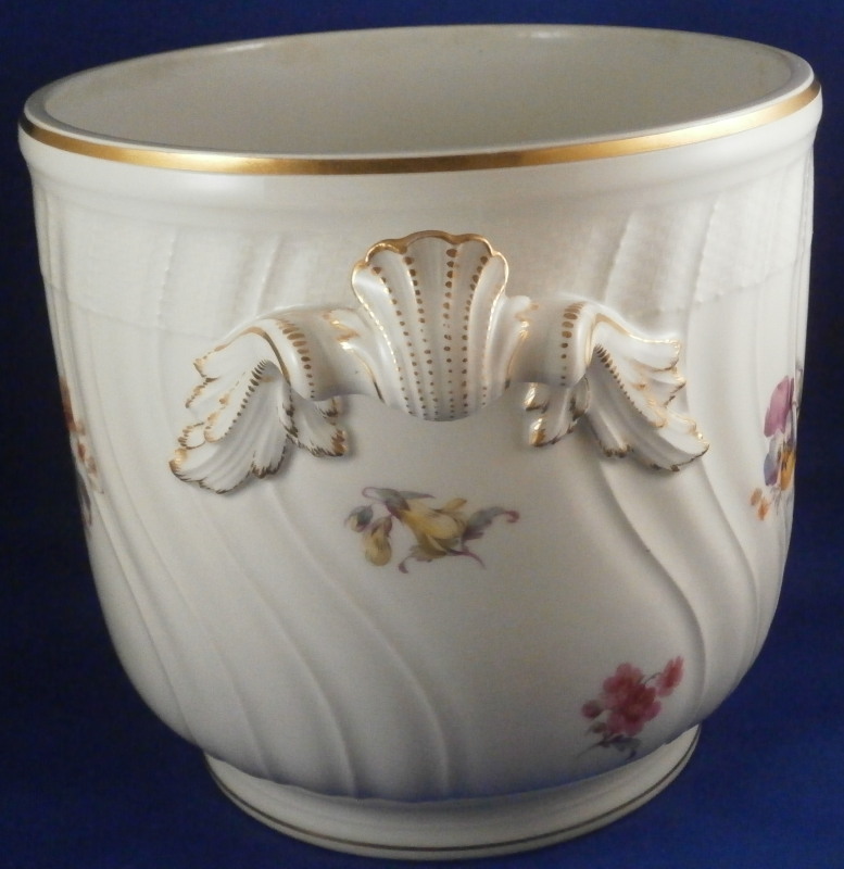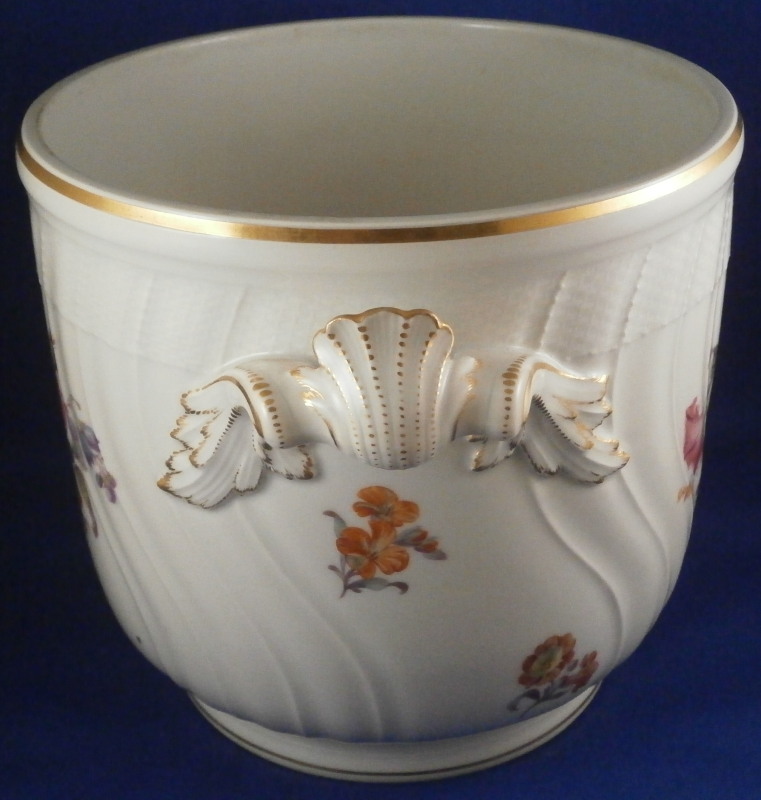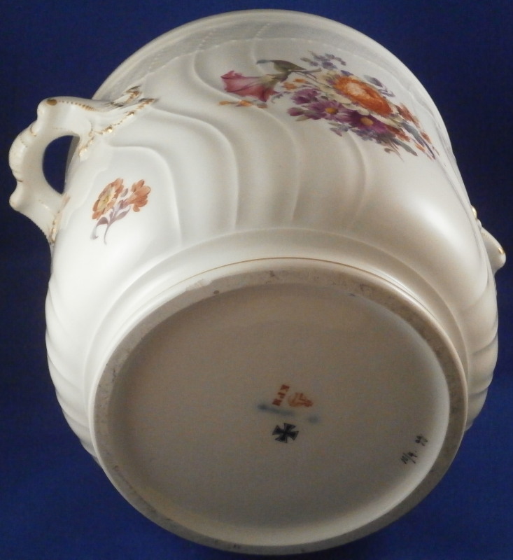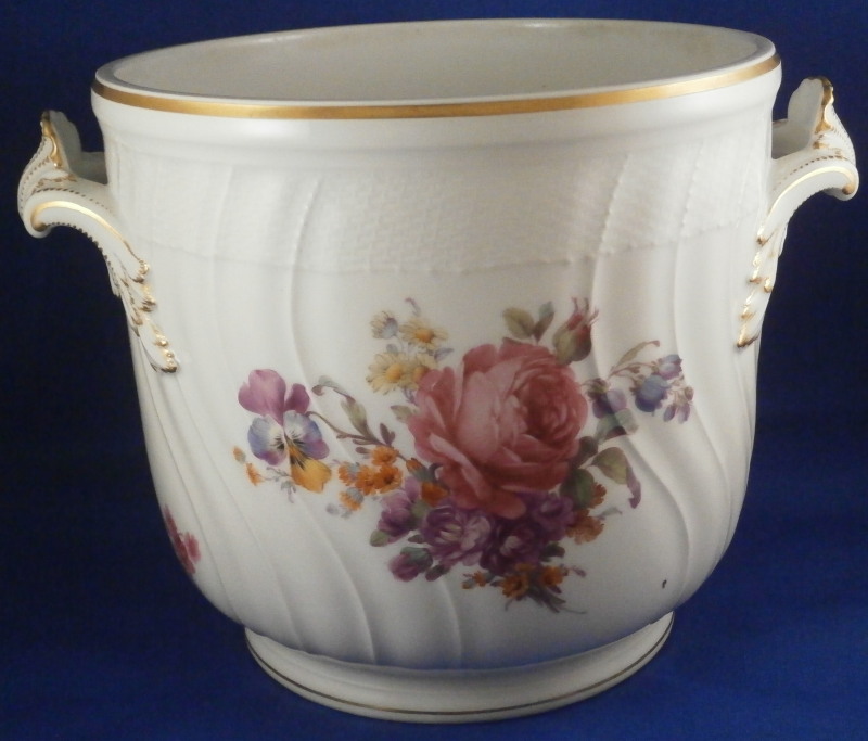 This is a a really nice early jadieniere / cache pot / flower pot / planter / champagne cooler made by KPM in the early 20th century during WWI. The piece is hand painted with two large floral arrangements - one to the front and one to the back well as smaller flowers to the sides under the handles. The handles have a nice shape to them and are highlighted with some gilding and the top part of the piece has a basket weave relief design to it. Gold line to the top edge and along the foot. It is from their Neuosier line. The piece is in superb condition but was used so the inside has some scratches and a bit of minor staining and a ground spot on the bottom edge from the making but nothing that takes away from the piece at all! The pot is marked underneath with their under glaze blue scepter mark with a letter below it, the red orb, a black iron cross, some black numbers and letters and the usual impressed marks from this period as shown. The piece is about 6.625 inches tall and 7.125 inches in diameter with the handles sticking out another inch on either side. Please email me for more information or other pictures.
